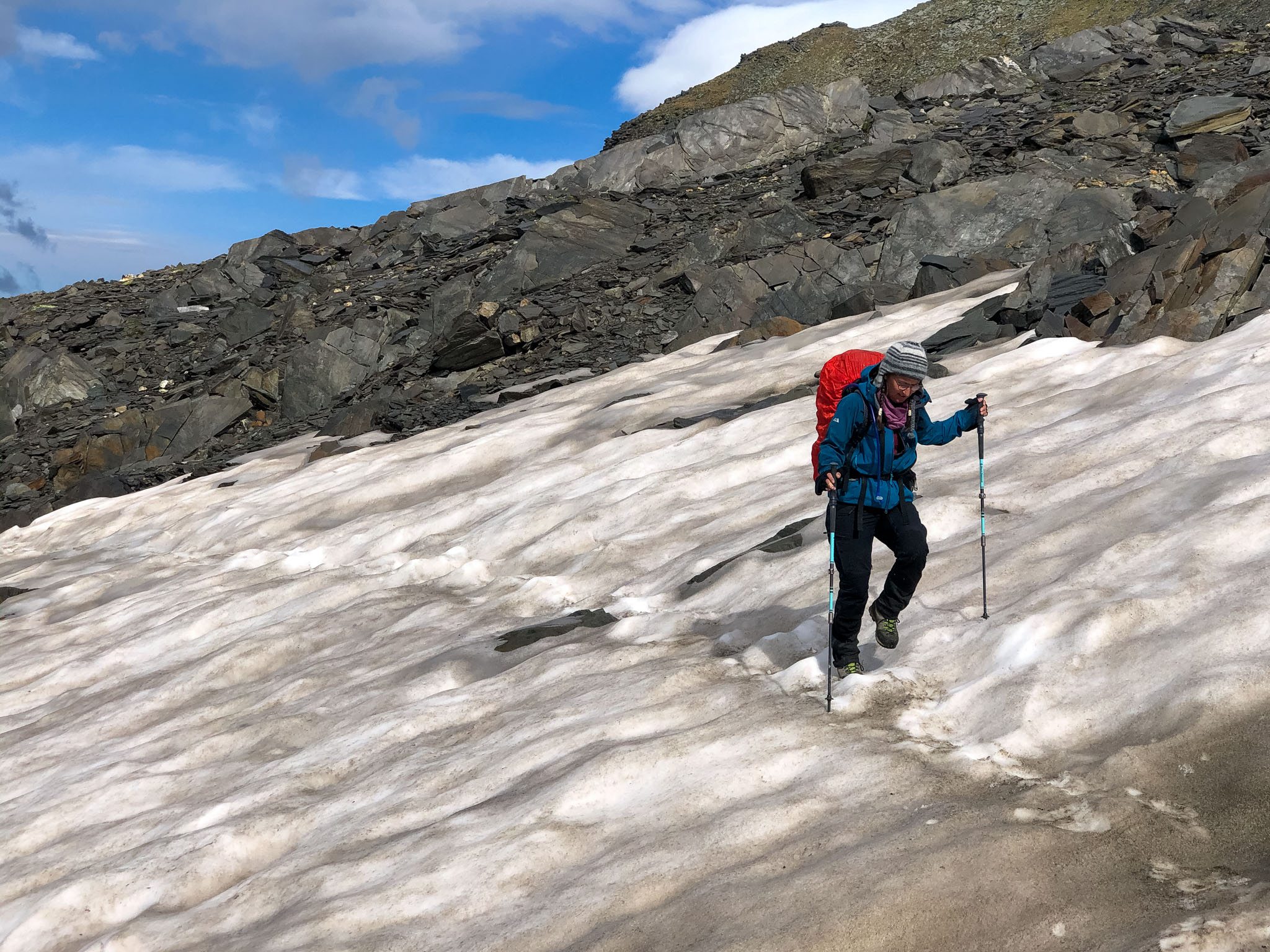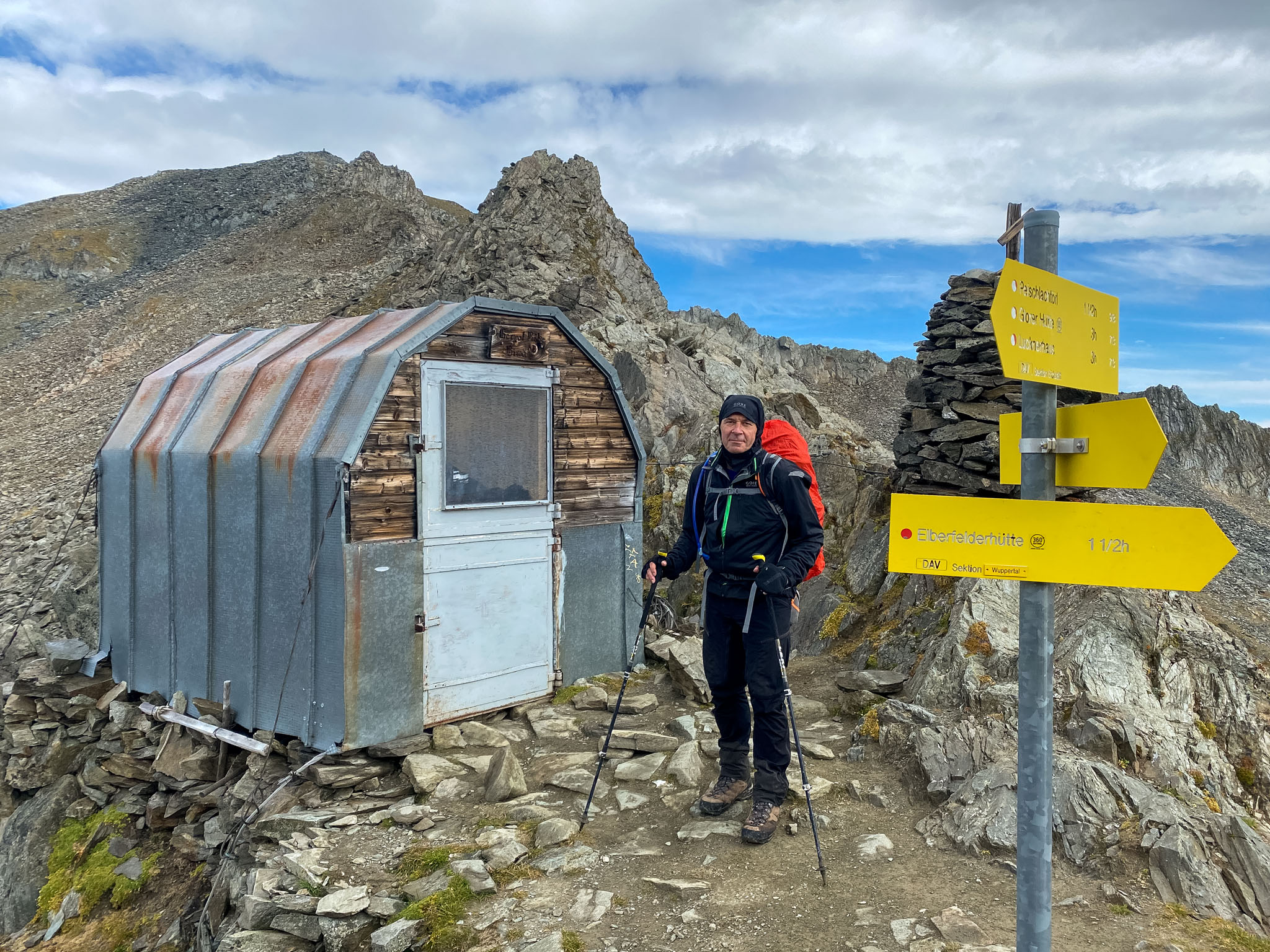 Nach 45 Minuten haben wir das Kasteneck, nach einer guten Stunde den zweiten Gipfel erreicht. Der Abstieg ist einfach und es geht gleich zum zweiten Anstieg weiter, dem höchsten Punkt unserer gesamten Tour, wo sich der Weg zur Scharte unter anderem über ein Gletscherfeld hinzieht. Zwischenzeitlich ist der Weg wieder ausgesetzt, vor allem direkt unterhalb der Scharte. Hier steht eine Biwakschachtel, doch wir sind froh, dass wir hier nicht übernachten müssen.