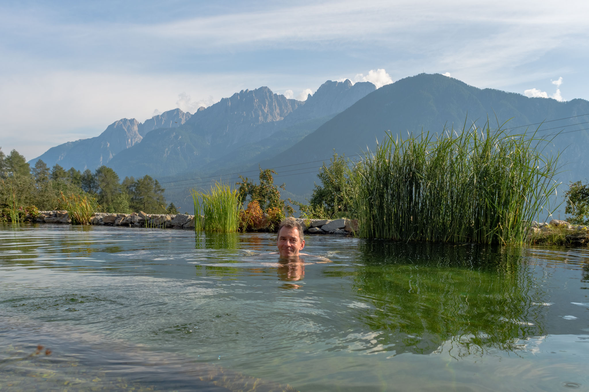 Dann geht es mit der Seilbahn runter ins Tal zu unserem Hotel. Hier geht es nach einer Dusche direkt in den Naturpool, was eine super Abkühlung ist.