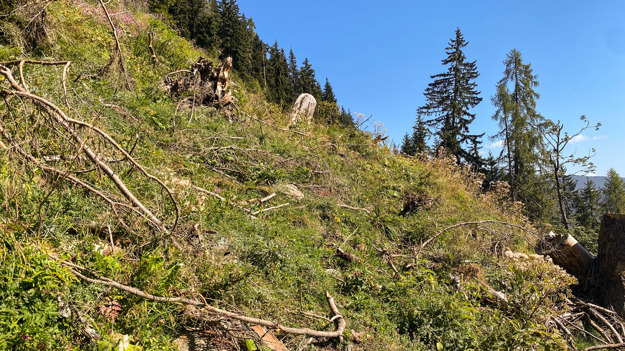 Ursprünglich wollten wir nicht den Schotterweg Richtung Falkertsee nehmen, sondern einen schmalen Wanderpfad. Wenige Meter nach dem Start sagte unsere App allerdings, dass der Weg zugewachsen sei! Das war ein Euphemismus. Es war nämlich nicht im Entferntesten erkennbar, wo der Weg hätte sein sollen.