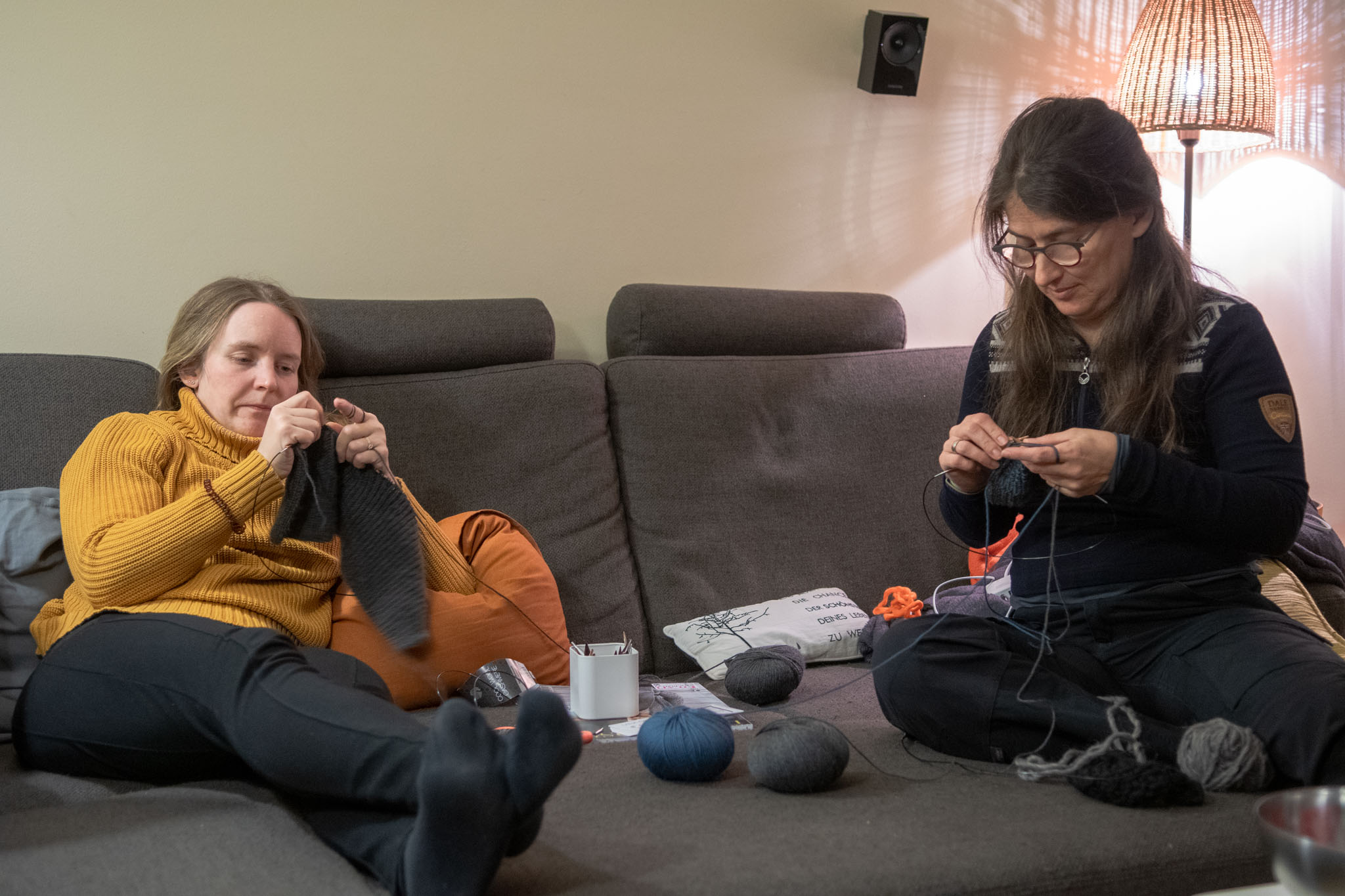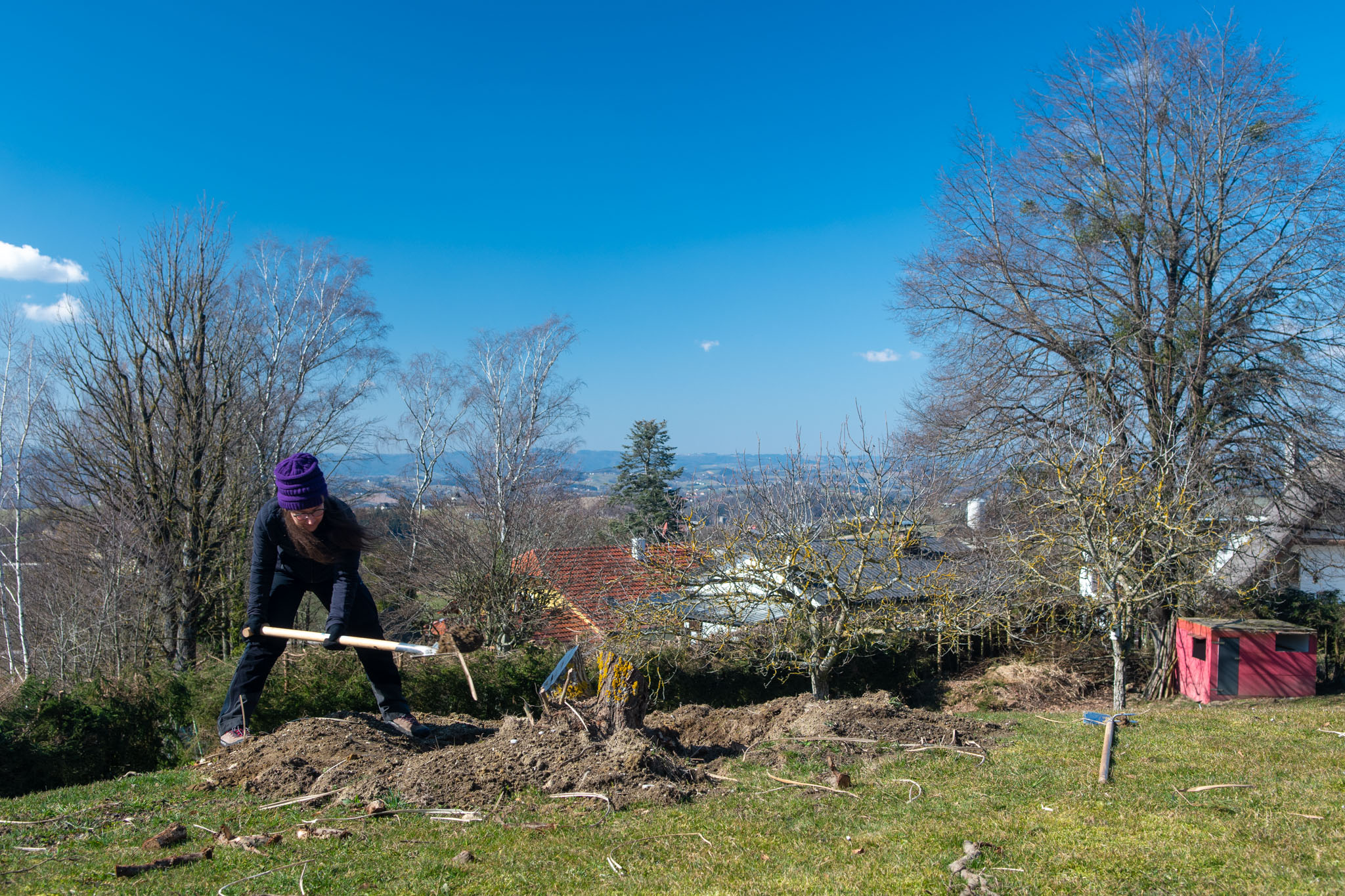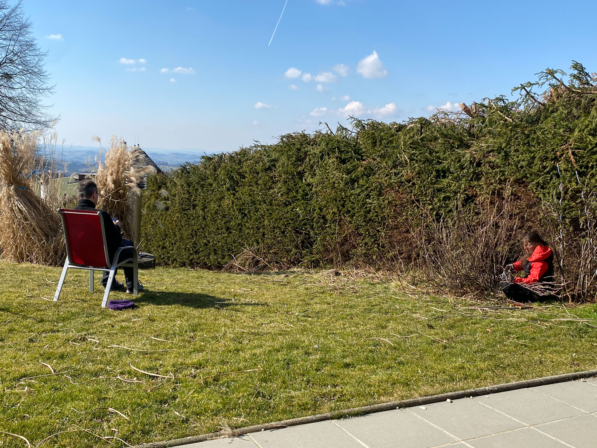 Vier Tage mussten wir in Quarantäne bleiben. Während dieser Zeit konnten wir die Aussicht aus unserem Zimmerfenster auf das Alpenpanorama genießen, sowie im Garten von Julia und Samir eine ganze Reihe von alten Bäumen fällen und ausgraben, sowie neue pflanzen. Ganz fertig geworden sind wir zwar nicht, aber doch ein gehöriges Stück voran gekommen. Zwischendrin haben Maria und Julia auch mal gemeinsam musiziert und nachdem Julia dabei war, einen Pulli für Samir zu stricken, hat sich Maria davon inspirieren lassen und hat mit einem Pulli für Thomas begonnen, was in den zwei Wochen zu einem witzigen kleinen Wettstreit zwischen den beiden Strickerinnen führte. Am Tag 5 (Mittwoch, 10. März) konnten wir uns durch einen neuerlichen (negativen) Coronatest freitesten lassen.