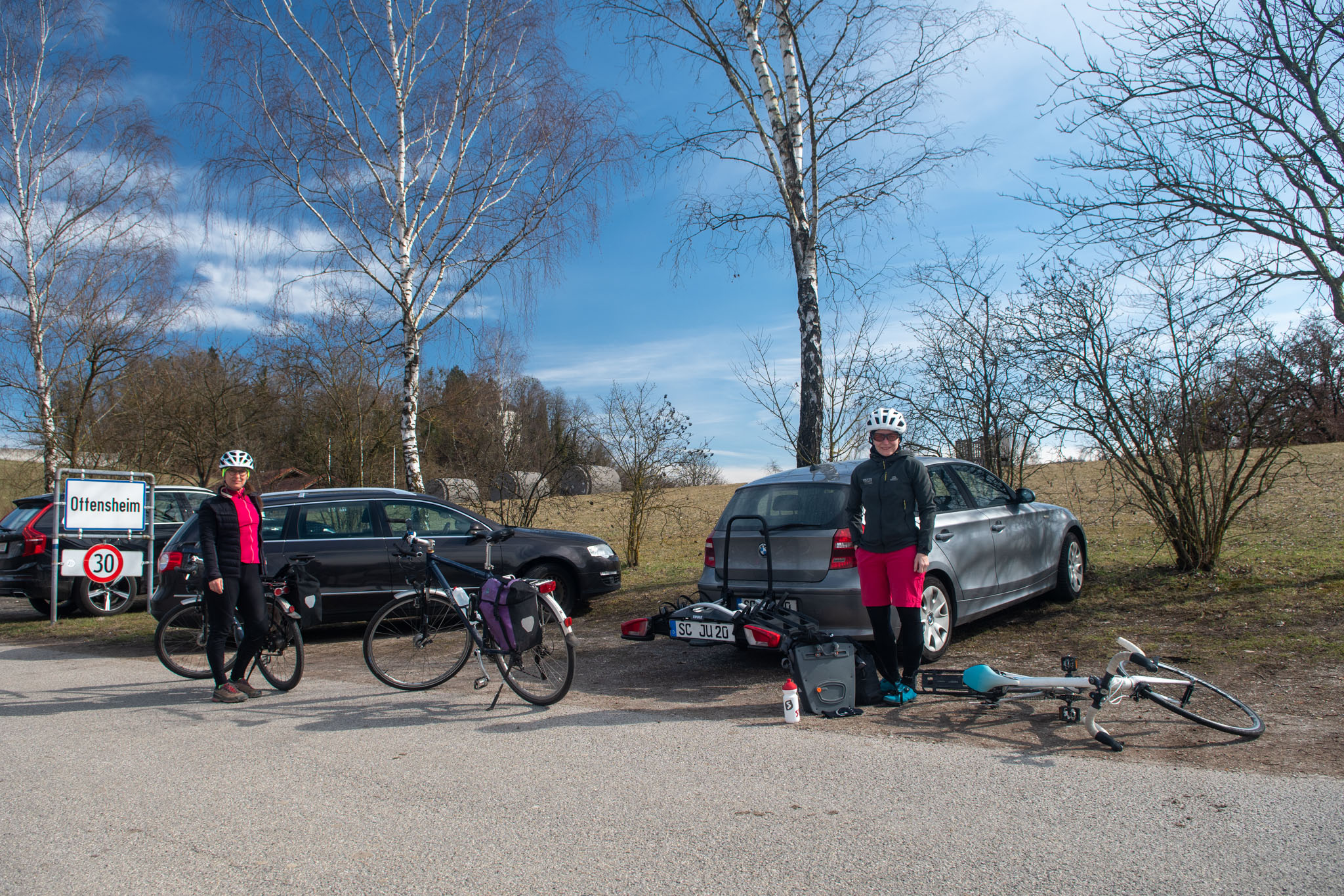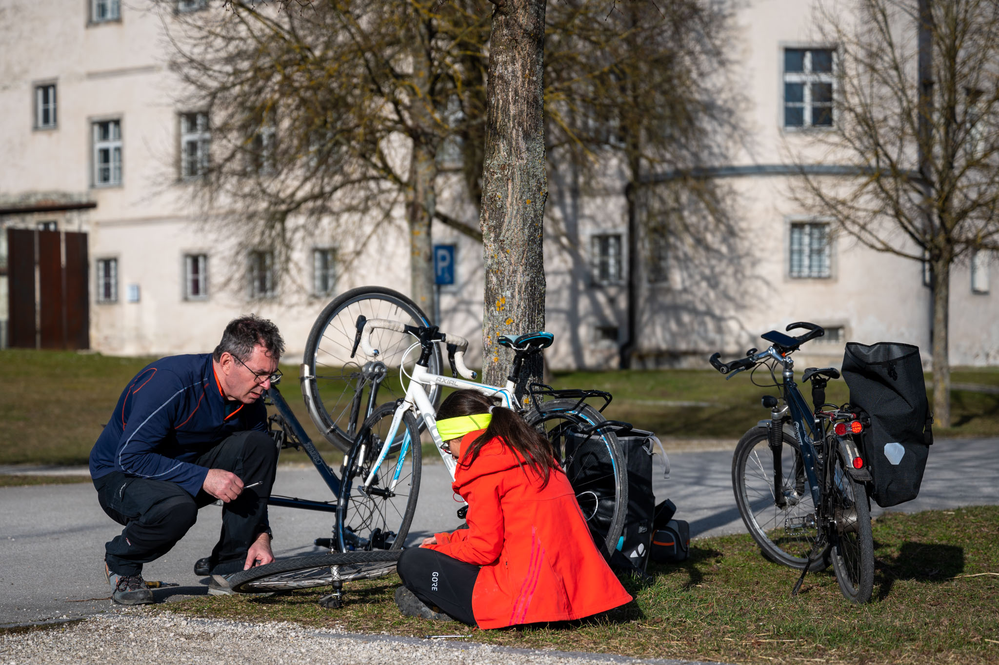Am Samstag, den 13. März sind wir zu unserer ersten Radtour aufgebrochen. Dummerweise verzögerte sich schon der Start, da Marias Vorderreifen platt war. Das lag zwar wahrscheinlich nur an einem nicht richtig zugeschraubten Ventil vom Aufpumpen vor der Herfahrt nach Österreich, doch Ausbau, erfolglose Loch-Suche, Kontrolle und Wiedereinbau des Rades haben uns eine knappe Stunde gekostet. Geplant hatten wir eine Rundtour südlich der Donau westlich von Linz. Nach gut zwei Stunden gab es dann den zweiten Platten – diesmal an Thomas' Hinterrad. Dummerweise dachte jeder von uns, dass der/die Andere Flickzeug dabei hat, so dass wir erst einmal ohne dastanden – immerhin im Hof eines schönen Schlosses. Mehrere Einheimische haben wirklich intensiv versucht, uns zu helfen und hatten letztendlich auch die Idee, dass eine nahe Tankstelle die schnellste Quelle für Flickzeug ist. Alles in allem war es danach aber schon so spät, dass wir den Rundweg kräftig abgekürzt haben und direkt runter zur Donau und zurück zum Auto geradelt sind. Vor sechs Jahren hatten wir am Bodensee das letzte Mal einen Fahrradplatten und nun gleich zwei an einem Tag. 🙁