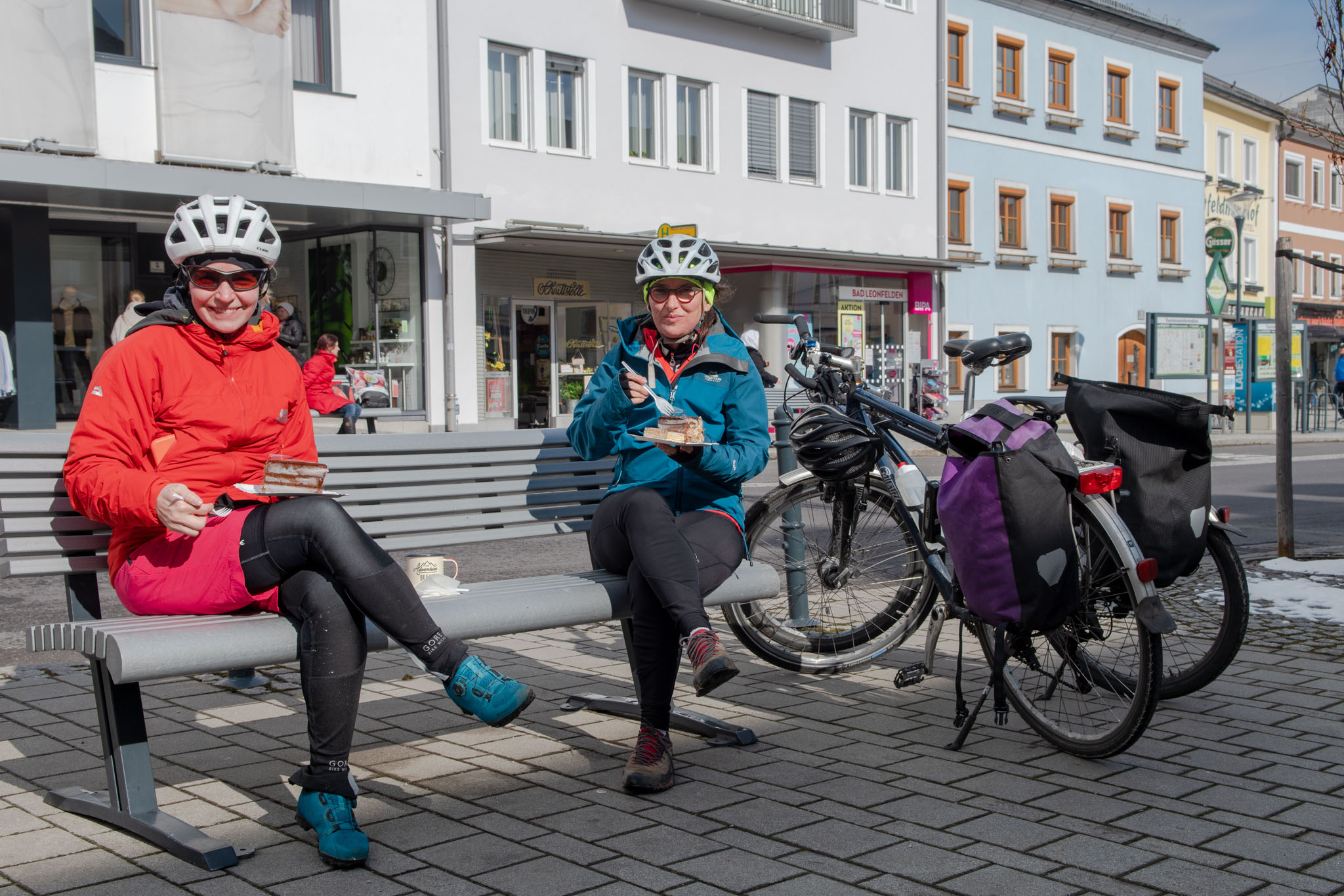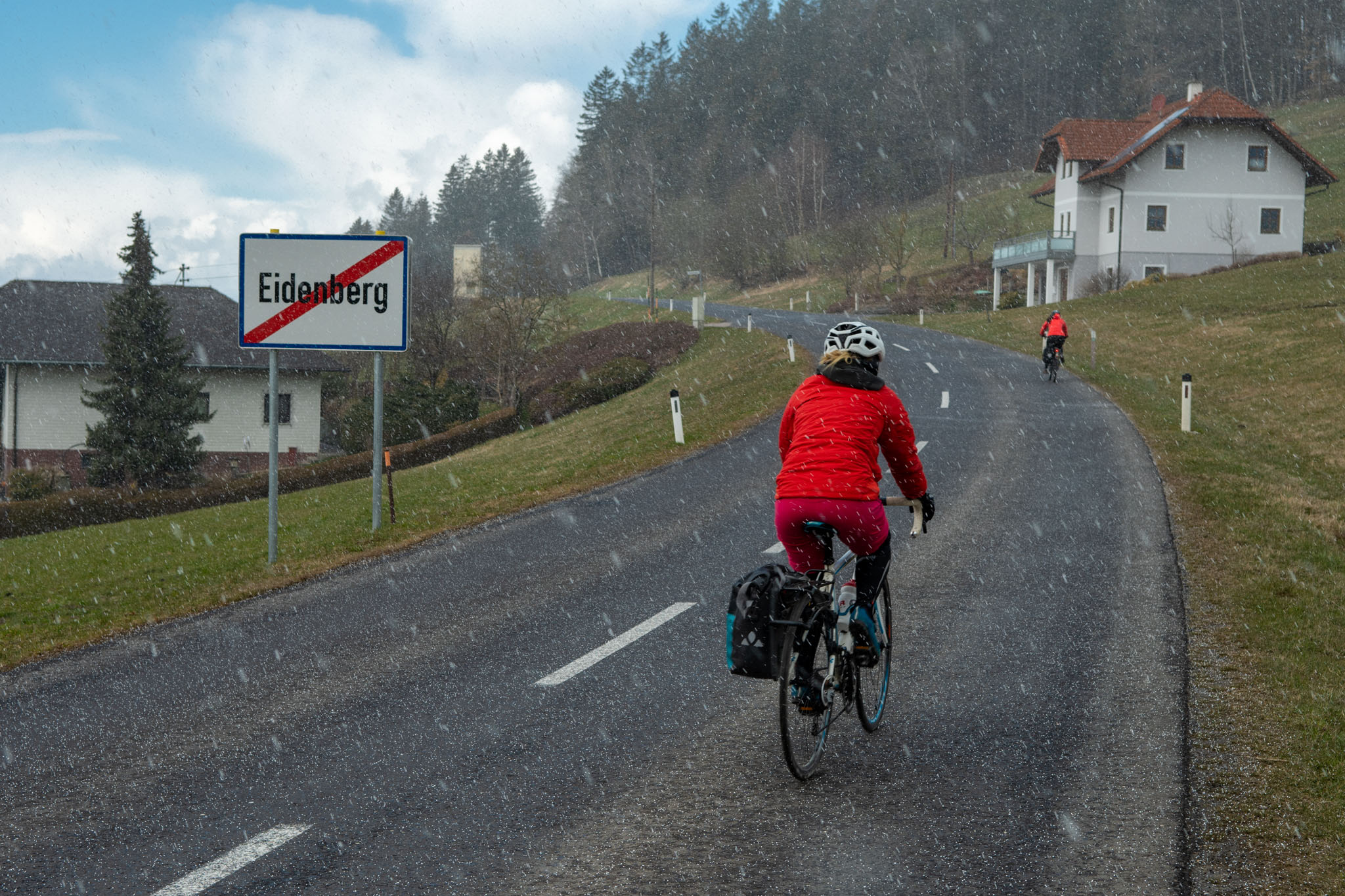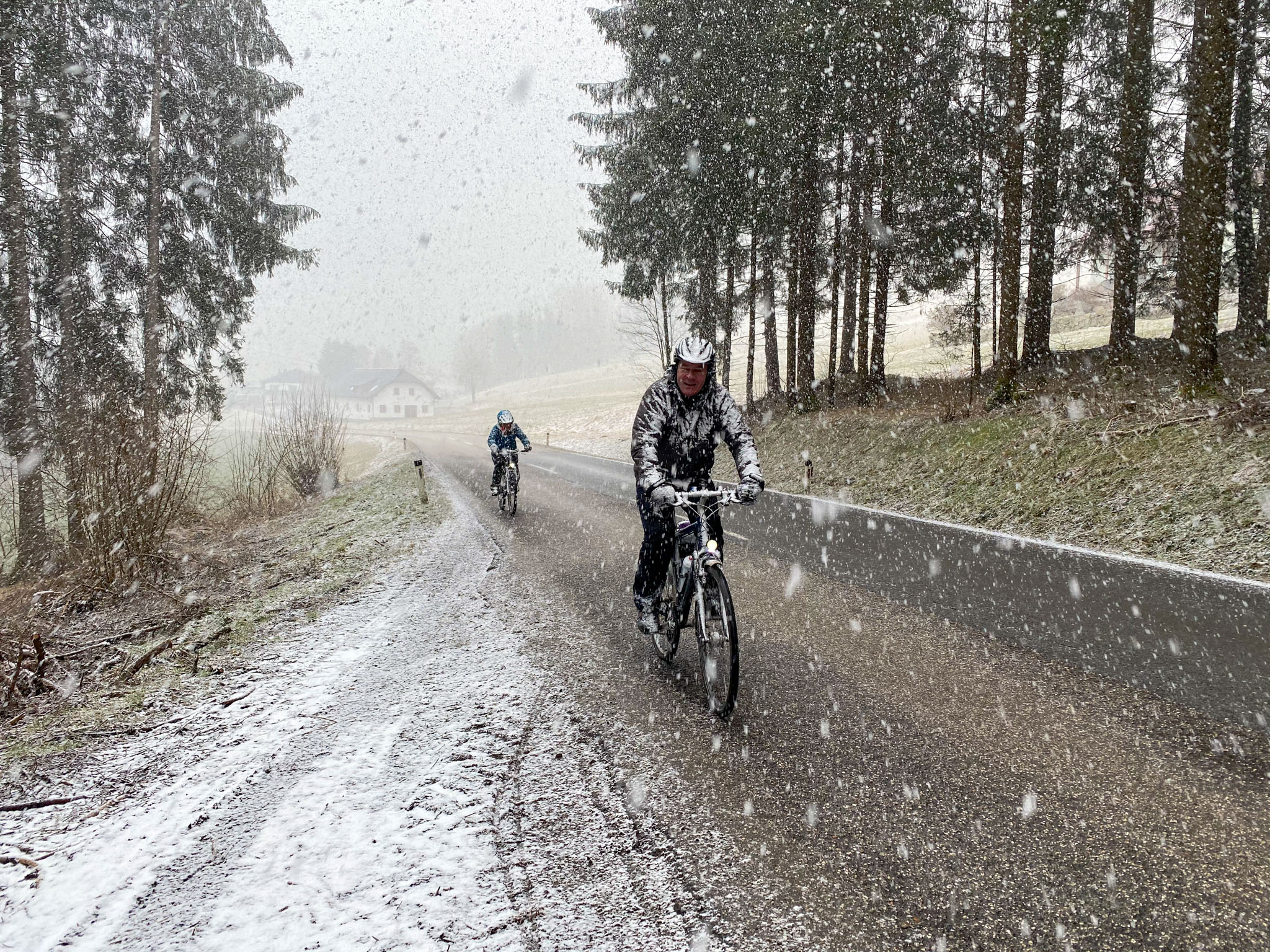 Am Tag darauf (Donnerstag, 18. März) sind wir zu unserer zweiten Radtour aufgebrochen. Diesmal ging es gleich vor der Haustür in Eidenberg los, Richtung Norden über Zwettl nach Bad Leonfelden und wieder zurück. Am Start in Eidenberg hat es noch leicht geschneit, doch den gesamten Hinweg und während unserer beiden Rasten in Zwettl und Bad Leonberg schien die Sonne. Kaum hatten wir bei unserer zweiten Rast unseren Kuchen auf einer Parkbank gegessen, wurde es kalt und es fing zu schneien an. Man kann sich gar nicht vorstellen, wie schmerzhaft Schneeflocken bei schneller Geschwindigkeit bergab in den Augen sind. Zurück in Eidenberg waren wir jedenfalls kräftig eingeschneit und komplett durchgefroren.