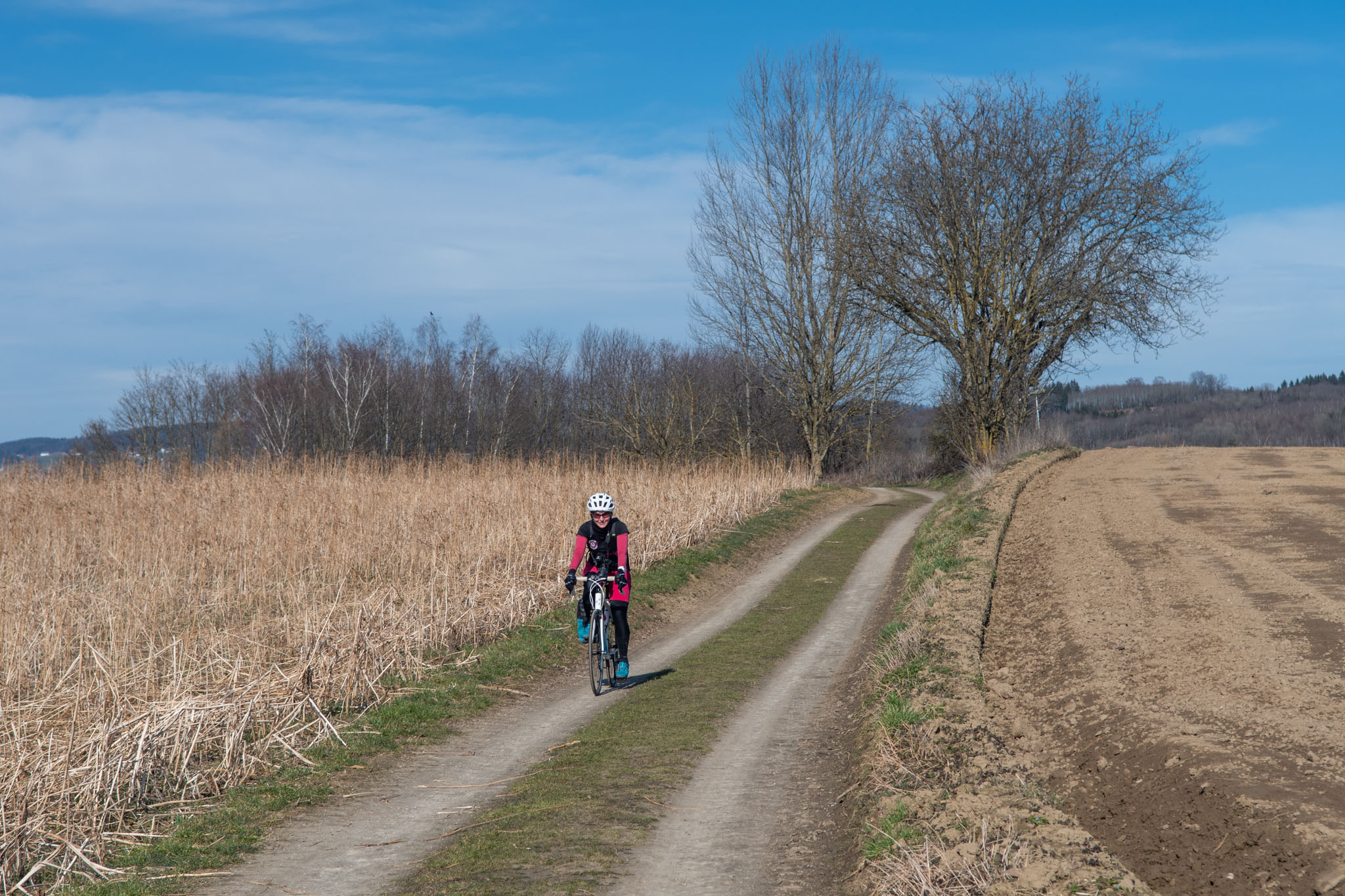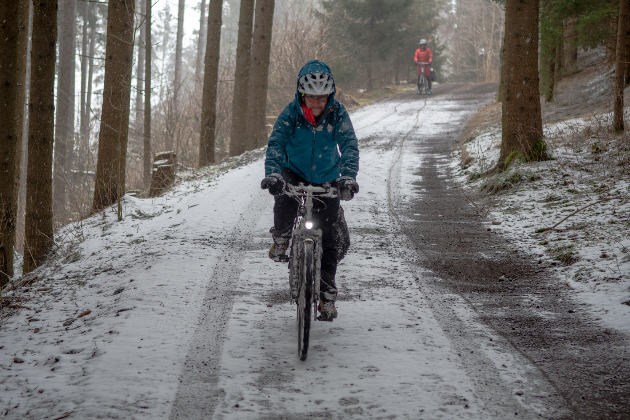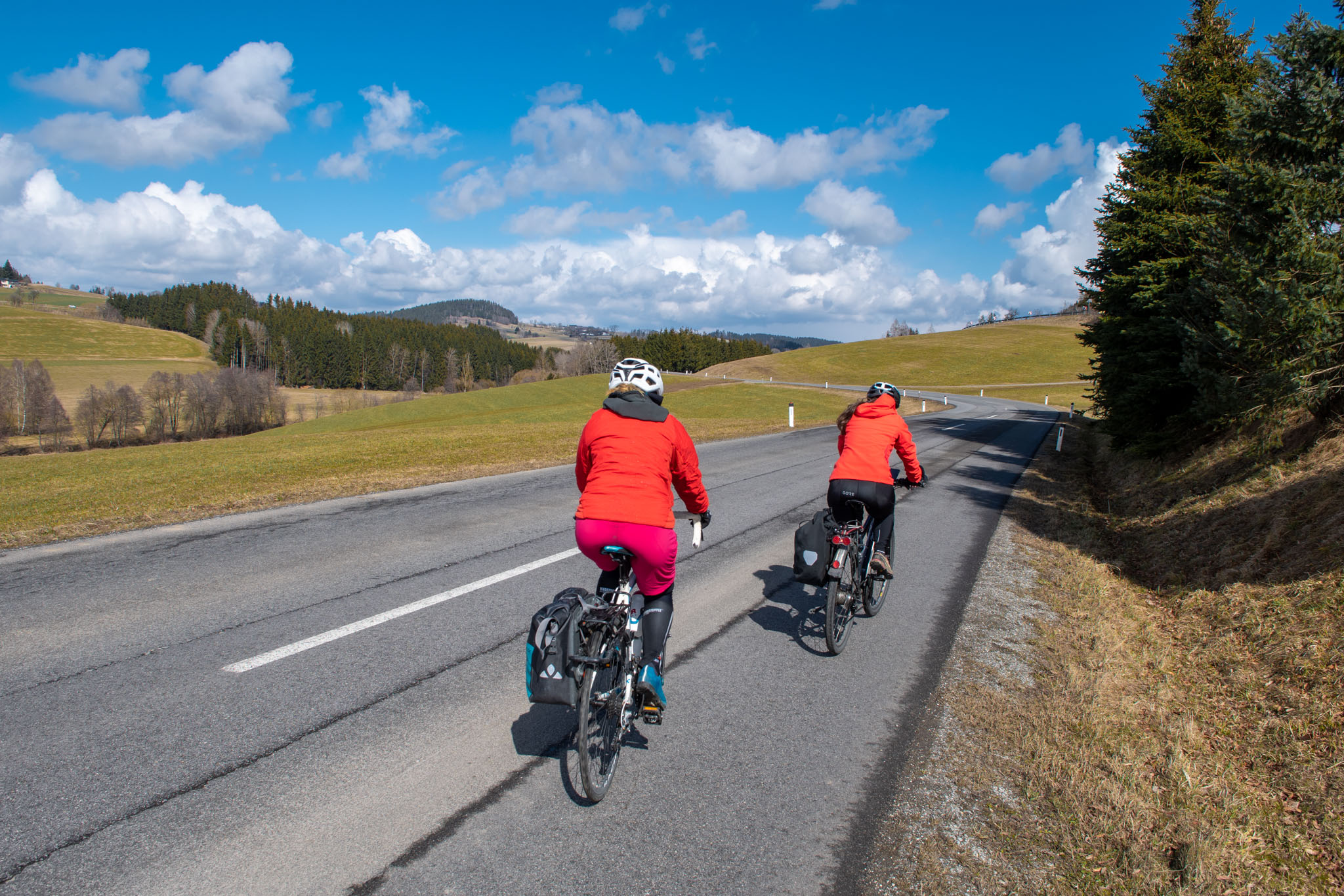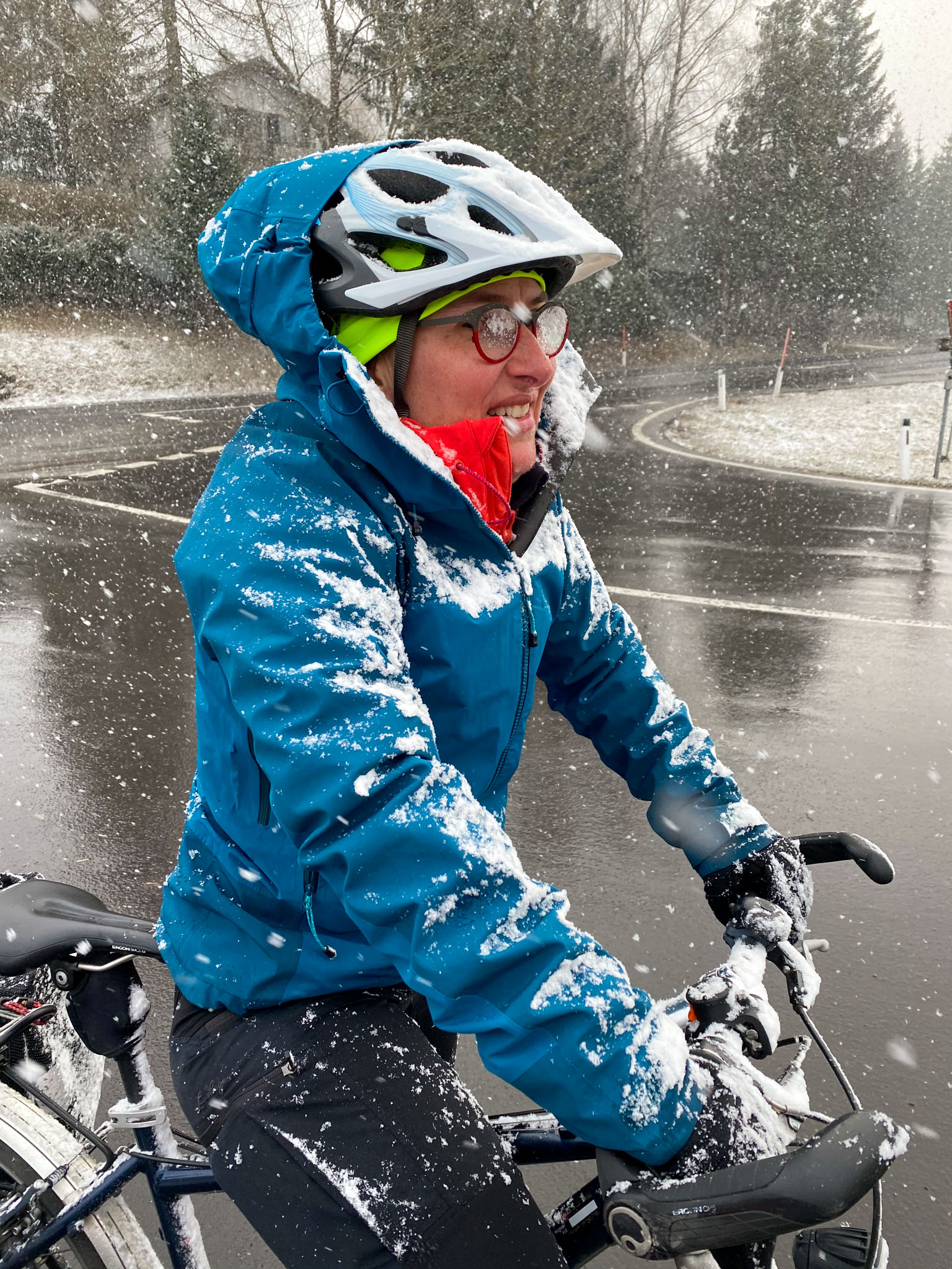 Am Tag darauf (Donnerstag, 18. März) sind wir zu unserer zweiten Radtour aufgebrochen. Diesmal ging es gleich vor der Haustür in Eidenberg los, Richtung Norden über Zwettl nach Bad Leonfelden und wieder zurück. Am Start in Eidenberg hat es noch leicht geschneit, doch den gesamten Hinweg und während unserer beiden Rasten in Zwettl und Bad Leonberg schien die Sonne. Kaum hatten wir bei unserer zweiten Rast unseren Kuchen auf einer Parkbank gegessen, wurde es kalt und es fing zu schneien an. Man kann sich gar nicht vorstellen, wie schmerzhaft Schneeflocken bei schneller Geschwindigkeit bergab in den Augen sind. Zurück in Eidenberg waren wir jedenfalls kräftig eingeschneit und komplett durchgefroren.