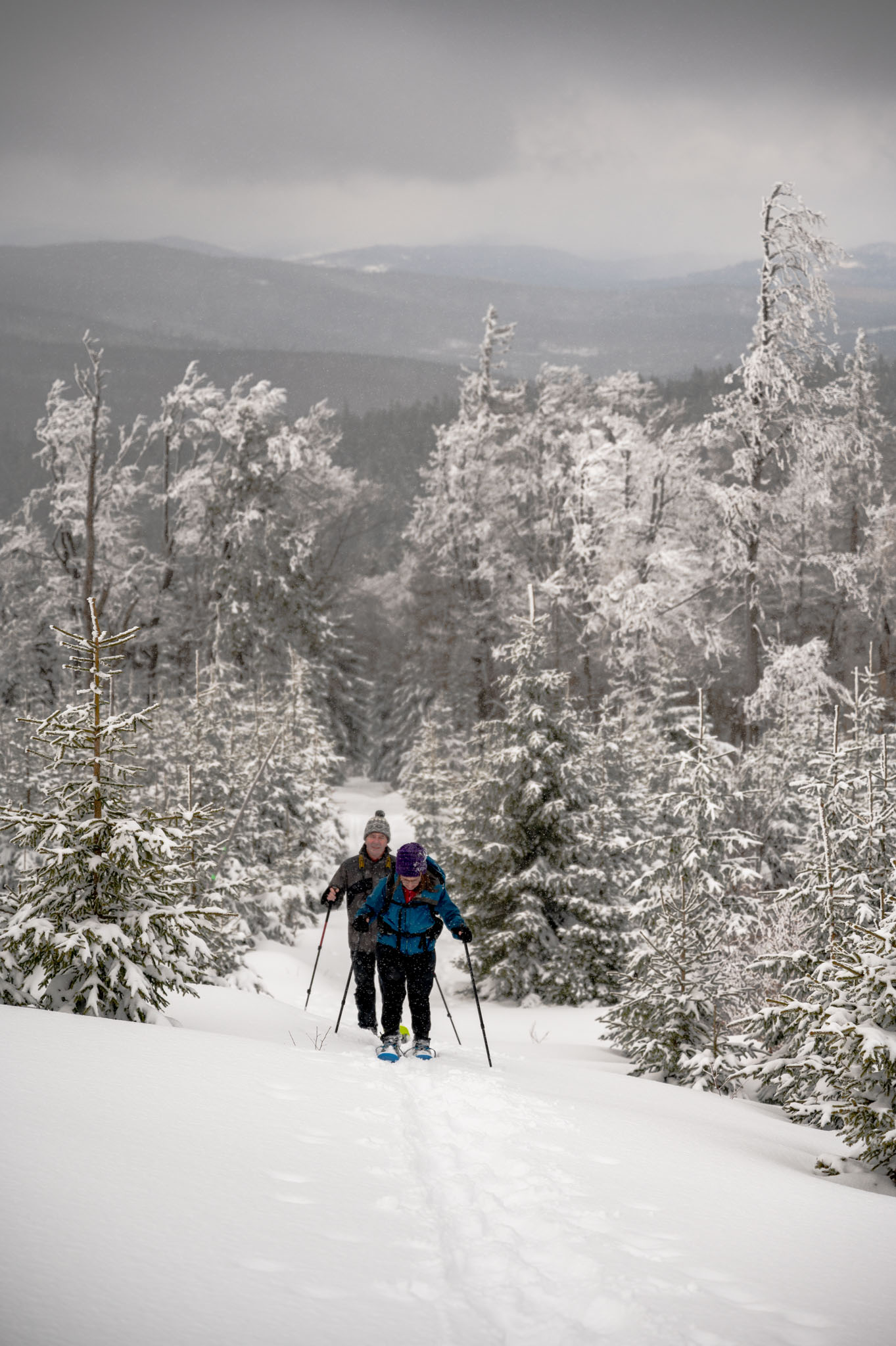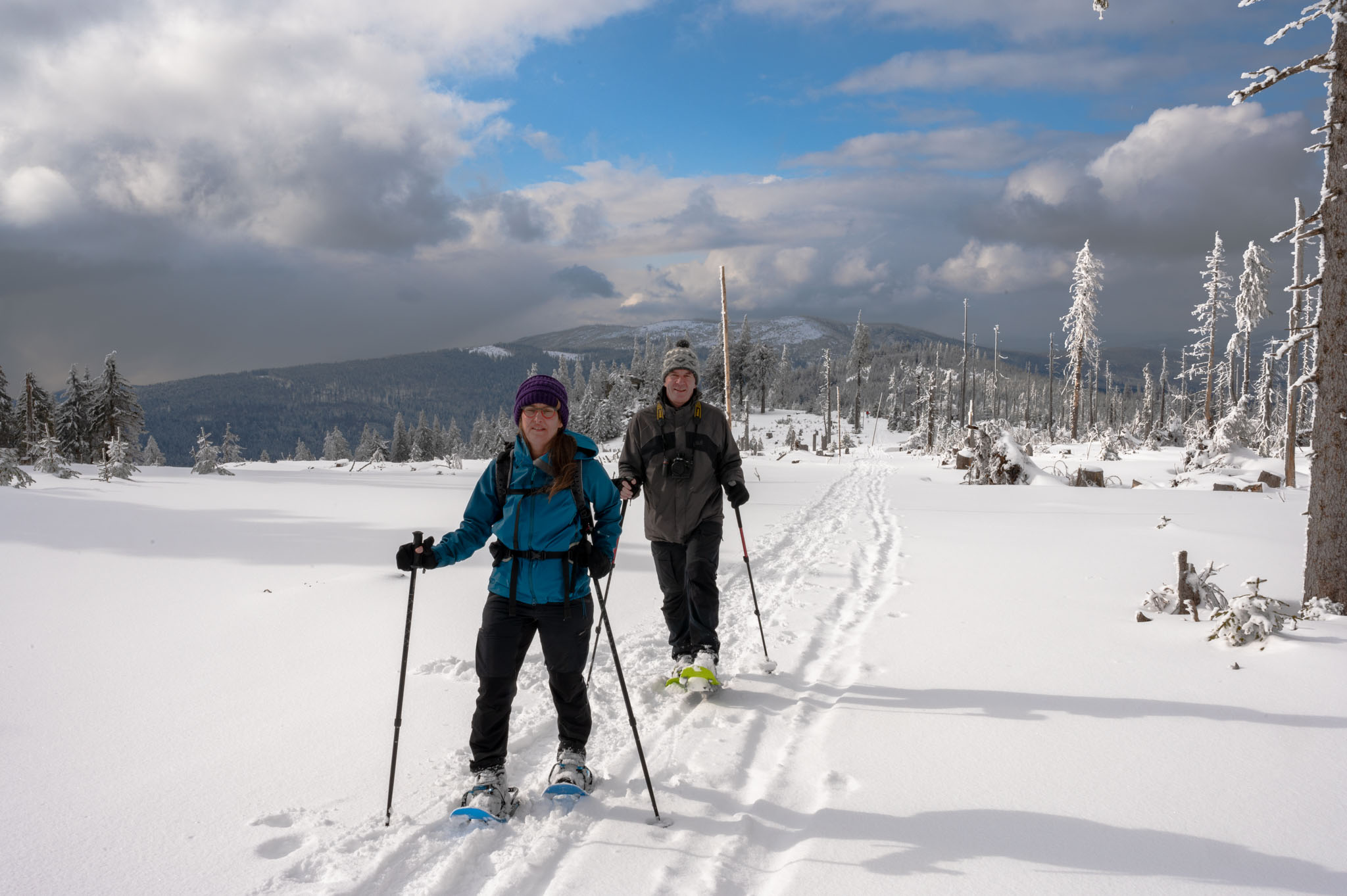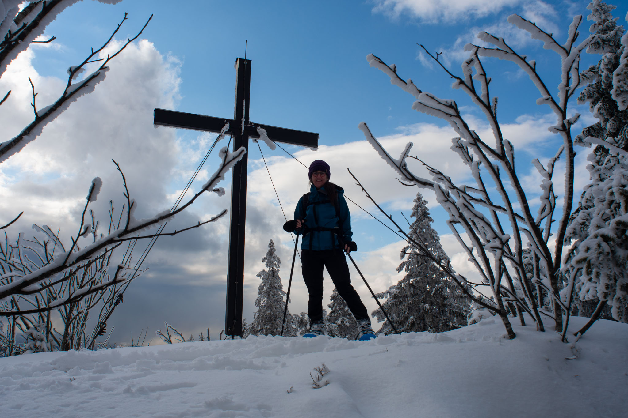 In unserer zweiten Urlaubswoche hatte auch Julia frei, und so konnten wir am Mittwoch (17. März) eine gemeinsame Schneeschuhtour im oberösterreichischen Teil des Böhmerwaldes machen. Von der Talstation der Hochfichtbahn ging es zunächst noch bei Schneefall durch den Wald nach oben und dort exakt auf der Grenze zwischen Oberösterreich und Tschechien entlang. Oben angekommen rissen die Wolken auf, so dass wir auch noch schönen Sonnenschein abbekommen haben. Auf dem Hochficht/Smrčina-Gipfel mussten wir feststellen, dass dort keine Gondel fährt, sondern nur ein Sessellift, der uns nicht mit nach unten nimmt, so dass wir auch den Abstieg – am Rand der Skipiste – mit Schneeschuhen gehen mussten. Letztendlich war das aber kein Problem und wir waren noch rechtzeitig zurück, um das eine geliehene Schneeschuhpaar vor der Geschäftsschließung wieder abgeben zu können.