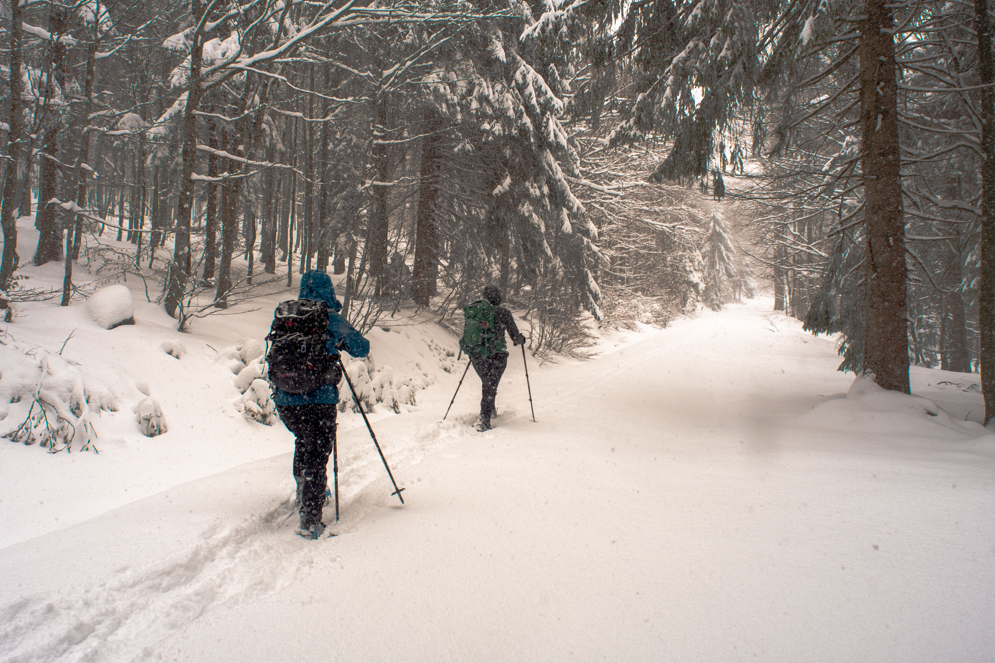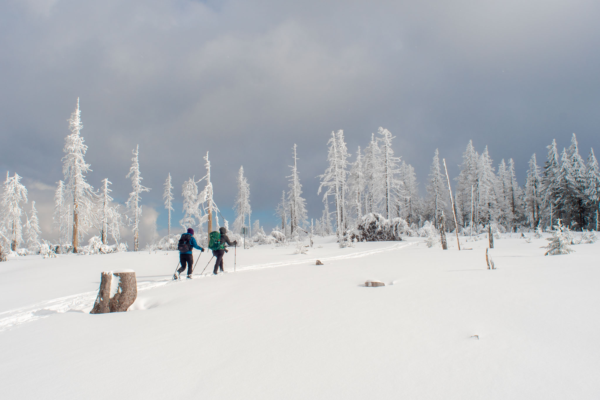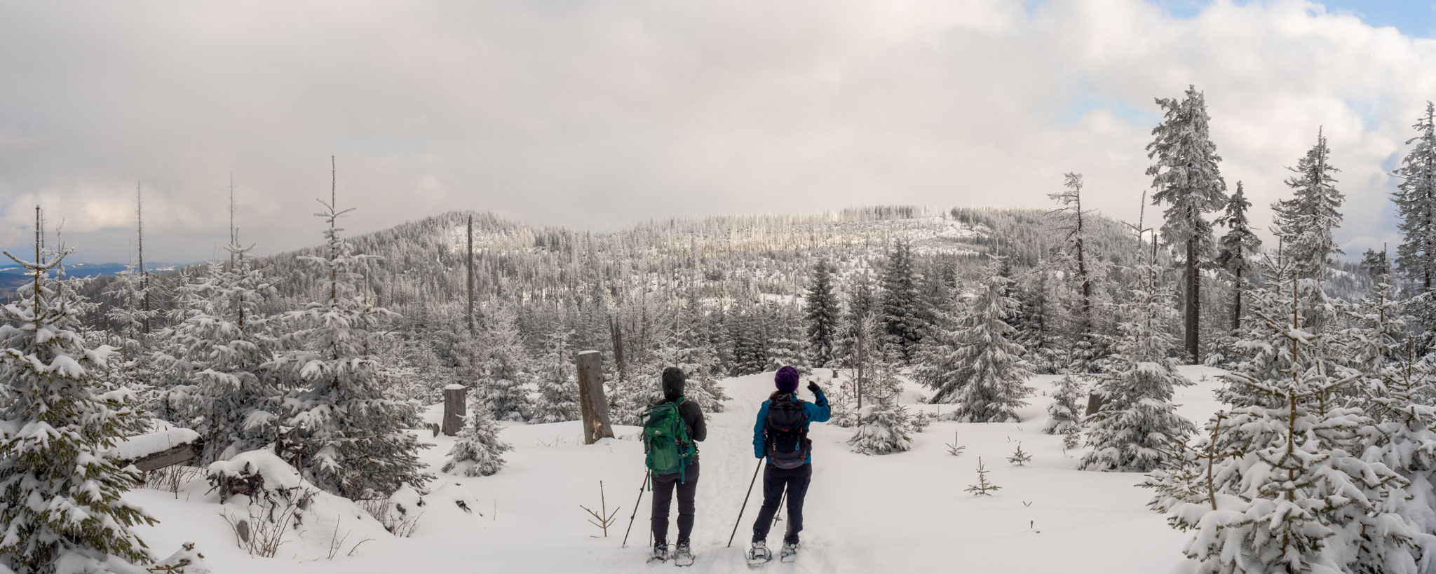 In unserer zweiten Urlaubswoche hatte auch Julia frei, und so konnten wir am Mittwoch (17. März) eine gemeinsame Schneeschuhtour im oberösterreichischen Teil des Böhmerwaldes machen. Von der Talstation der Hochfichtbahn ging es zunächst noch bei Schneefall durch den Wald nach oben und dort exakt auf der Grenze zwischen Oberösterreich und Tschechien entlang. Oben angekommen rissen die Wolken auf, so dass wir auch noch schönen Sonnenschein abbekommen haben. Auf dem Hochficht/Smrčina-Gipfel mussten wir feststellen, dass dort keine Gondel fährt, sondern nur ein Sessellift, der uns nicht mit nach unten nimmt, so dass wir auch den Abstieg – am Rand der Skipiste – mit Schneeschuhen gehen mussten. Letztendlich war das aber kein Problem und wir waren noch rechtzeitig zurück, um das eine geliehene Schneeschuhpaar vor der Geschäftsschließung wieder abgeben zu können.
