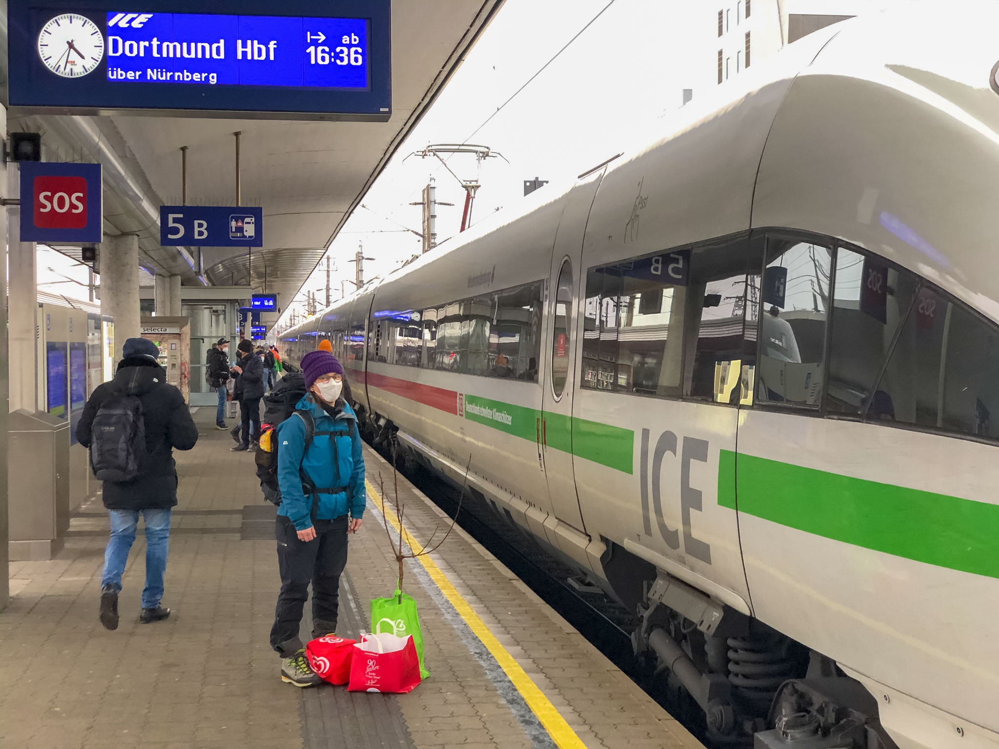 Am Abend ging es dann noch zum Coronatest, denn am nächsten Tag ging es wieder zurück über die Grenze nach Deutschland. Der Sonntag war noch einmal ein gemütlicher Tag. Auf dem Weg zum Bahnhof haben wir eine Linzer Torte für unsere Nachbarin besorgt, die sich wieder um unseren Briefkasten gekümmert hat (Blumen gießen war diesmal wohl noch nicht nötig). Julia hat uns als Reiseproviant noch eine Tafel Schokolade und eine halbe Brioche eingepackt. Die Bahnfahrt selbst war ruhig und entspannt. Die Bahn vergibt derzeit nur so viele Sitzplätze, dass jeder Reisende alleine sitzen kann und der Zug von Linz fährt in knapp drei Stunden ohne Umsteigen direkt nach Nürnberg. Unsere Fahrräder und Marias großen Rucksack haben wir in Oberösterreich zurück gelassen. Julia bringt uns das, wenn sie das nächste Mal nach Franken kommt. Jetzt müssen wir hier wieder vier Tage in Quarantäne bleiben und am fünften Tag (Freitag), dürfen wir uns freitesten lassen. Das ist aber kein Problem, denn die Gefriertruhe ist gefüllt und unsere Nachbarin hat uns zusätzlich schon zweimal versorgt. 😁