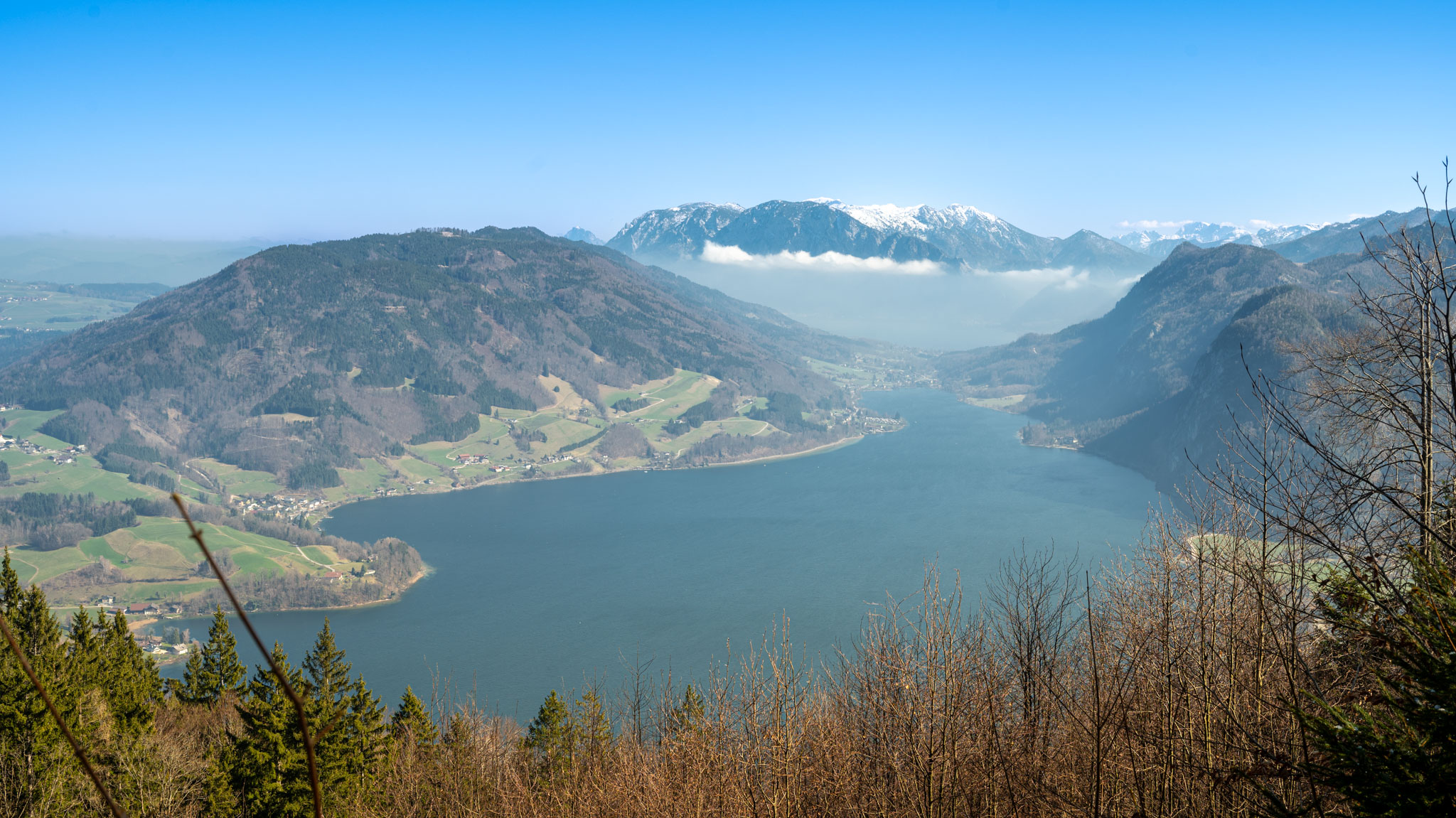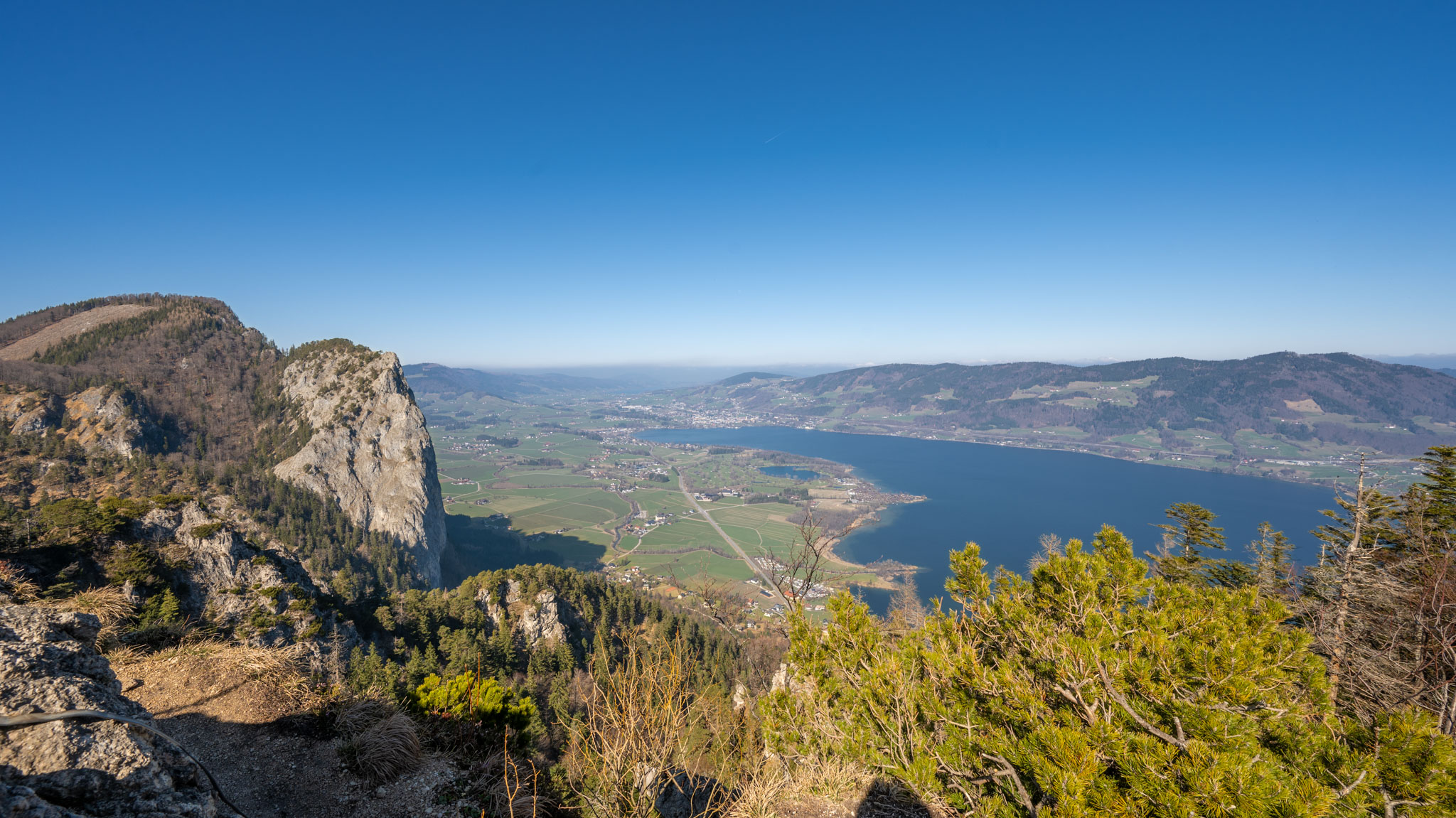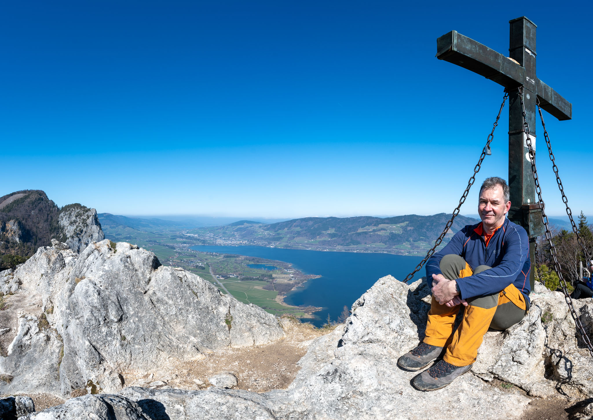 Das erste Drittel bis zum Almkogel – mit Blick zurück auf den Wolfgangsee und zur Seite auf den Attersee – ging es moderat bergauf. Auf dem Almkogelgipfel hatten wir dann perfekte Sicht auf den Mondsee und im Hintergrund den Irrsee.