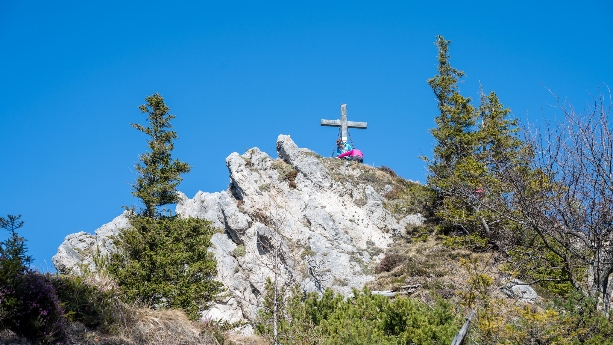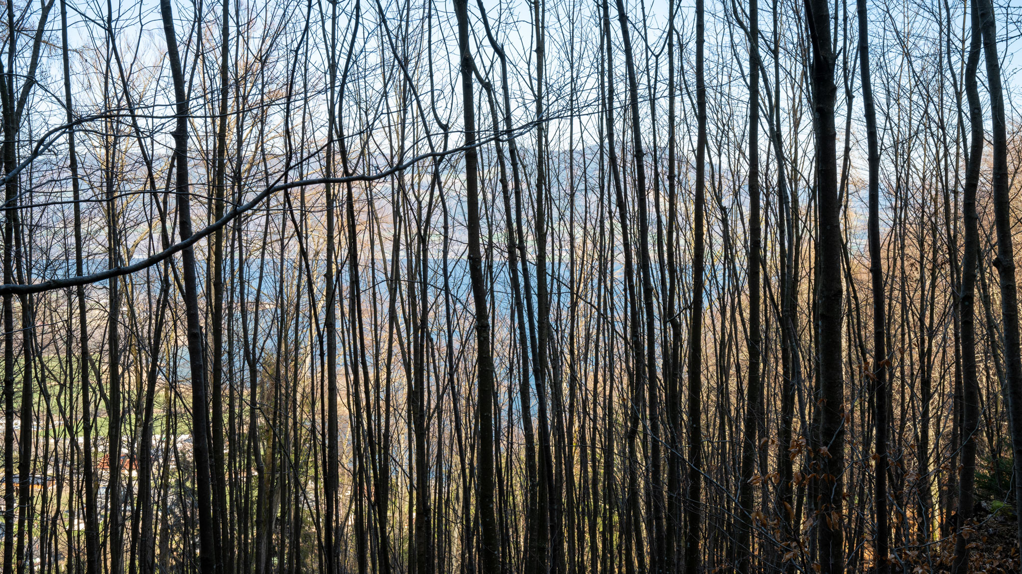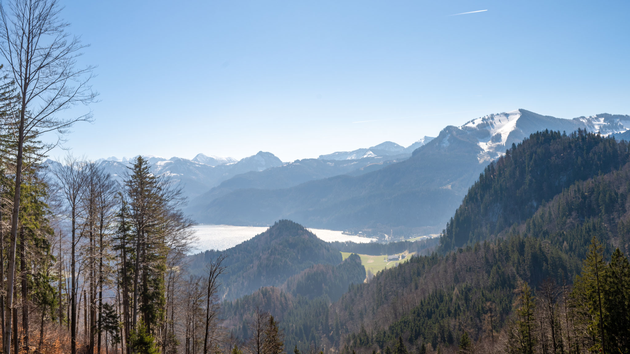 Das erste Drittel bis zum Almkogel – mit Blick zurück auf den Wolfgangsee und zur Seite auf den Attersee – ging es moderat bergauf. Auf dem Almkogelgipfel hatten wir dann perfekte Sicht auf den Mondsee und im Hintergrund den Irrsee.