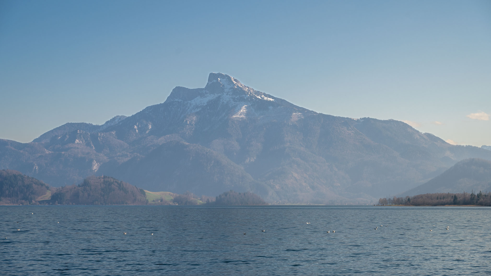 Das zweite Drittel der Strecke – vom Ankogel runter ins Tal – war dann richtig steil, meist in Serpentinen, während das dritte Drittel bis nach Mondsee praktisch völlig flach war. Dort musste man sich nur umdrehen, um die gesamte Zeit die Aussicht auf den Schafberg und die Drachenwand genießen zu können.
