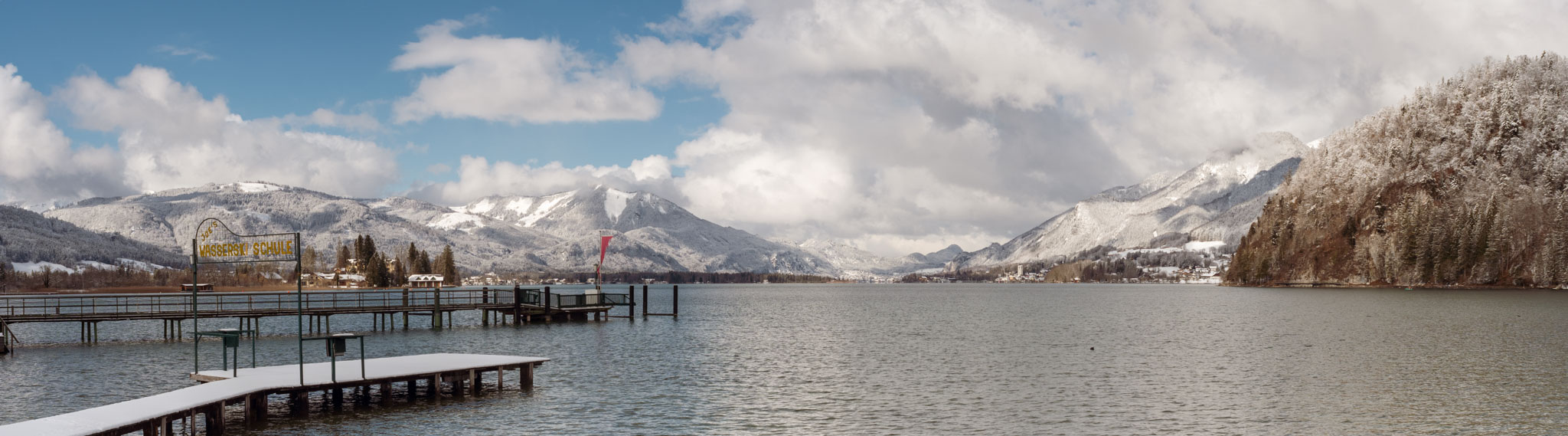 Wir wären schon zufrieden gewesen, wenn wir unsere Schneeschuhe zumindest einmal hätten nutzen können und wir die anderen Tage mit normalen Wanderstiefeln verbracht hätten. In den ersten beiden Nächten hat es dann aber nach langer Zeit mal wieder ordentlich geschneit, so dass wir – mit einer Ausnahme – jeden Tag mit Schneeschuhen unterwegs waren, und zwar immer an einem anderen der vielen Seen im Salzkammergut: Wolfgangsee, Mondsee, Hallstätter See, Traunsee, Gosausee und Fuschlsee. Das Wetter war fast durchgehend so sonnig, dass am Ende der Woche der Schnee schon extrem schwer war. Wir haben also – mal wieder – die bestmögliche Woche erwischt.