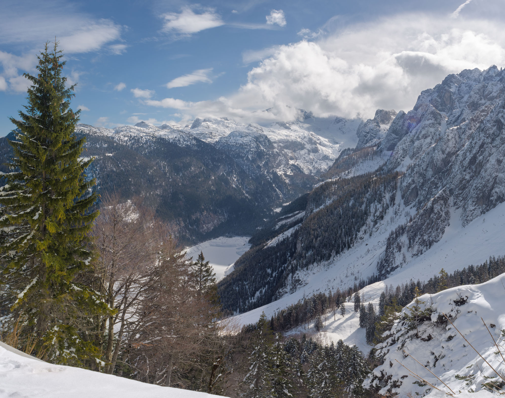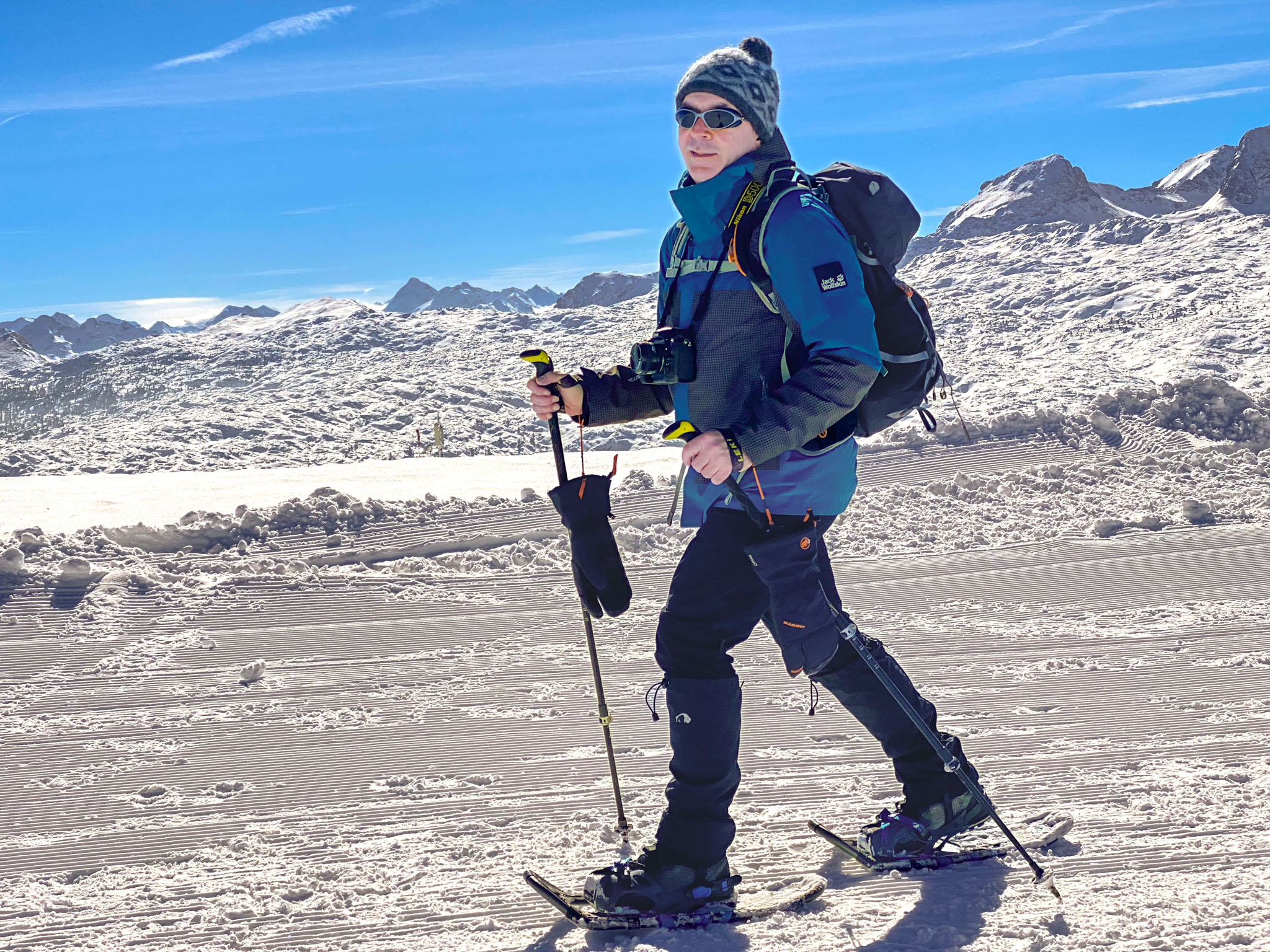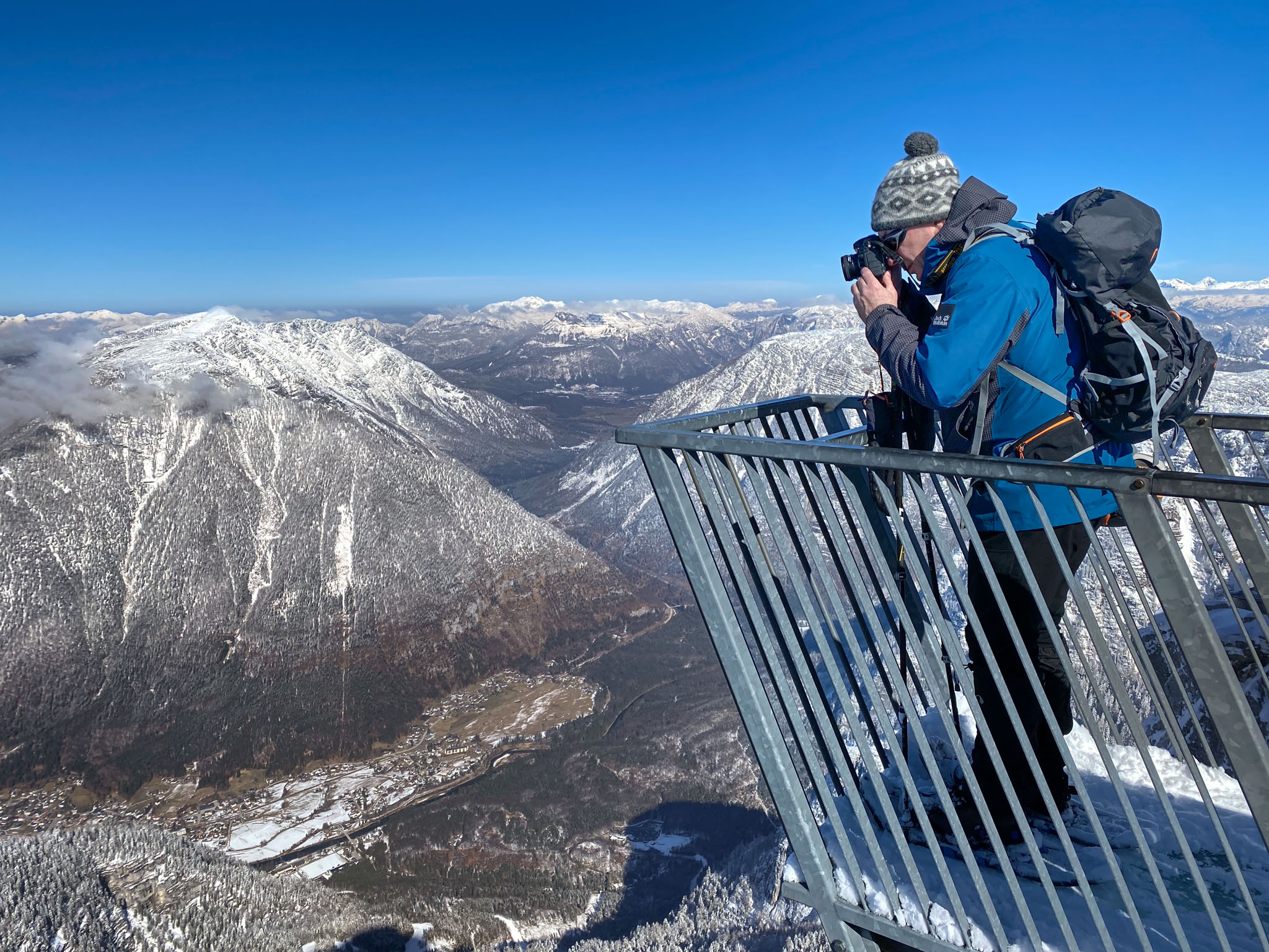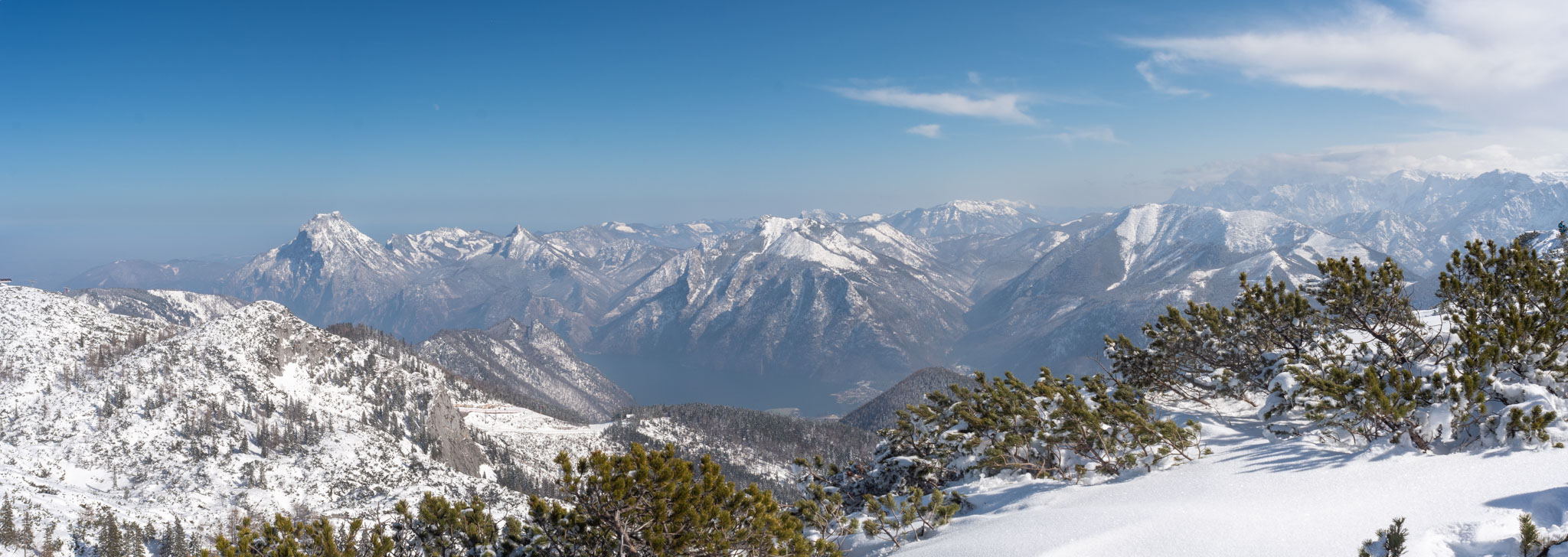 Ein weiterer sonniger Tag war angekündigt, so dass wir erneut früh aufgestanden sind, um Richtung Gosausee zu fahren. Mit der Seilbahn ging es auf die Zwieselalm am Gosaukamm, ganz in der Nähe, wo wir im letzten September auf dem SalzAlpenSteig die Kammseite gewechselt haben. Der heutige Schneeschuhtrail konnte nicht ganz mit denen von gestern mithalten (es ging mehr an Skipisten entlang), aber die Aussicht war wieder grandios. Der Dachsteingipfel war zwar weitestgehend von Wolken umgeben, aber in alle anderen Richtungen hatten wir perfekte Fernsicht – bis zum Großvenediger; Untersberg und Gamsfeld schienen beinahe zum Greifen nah.