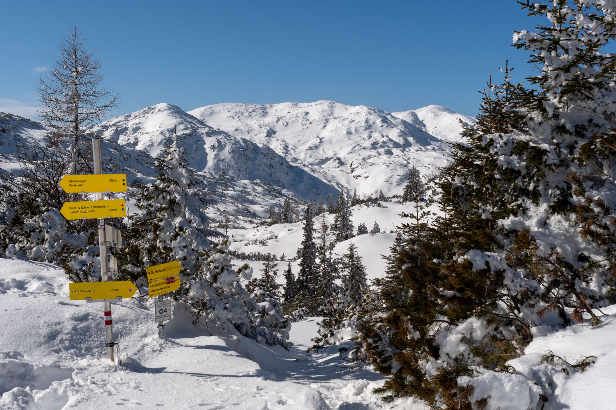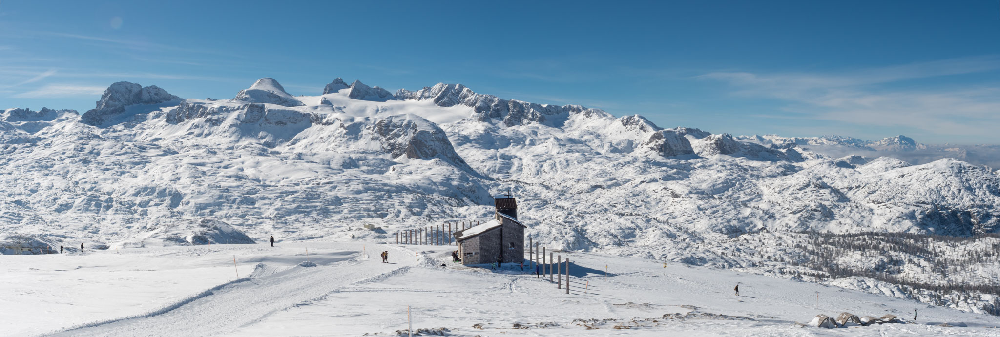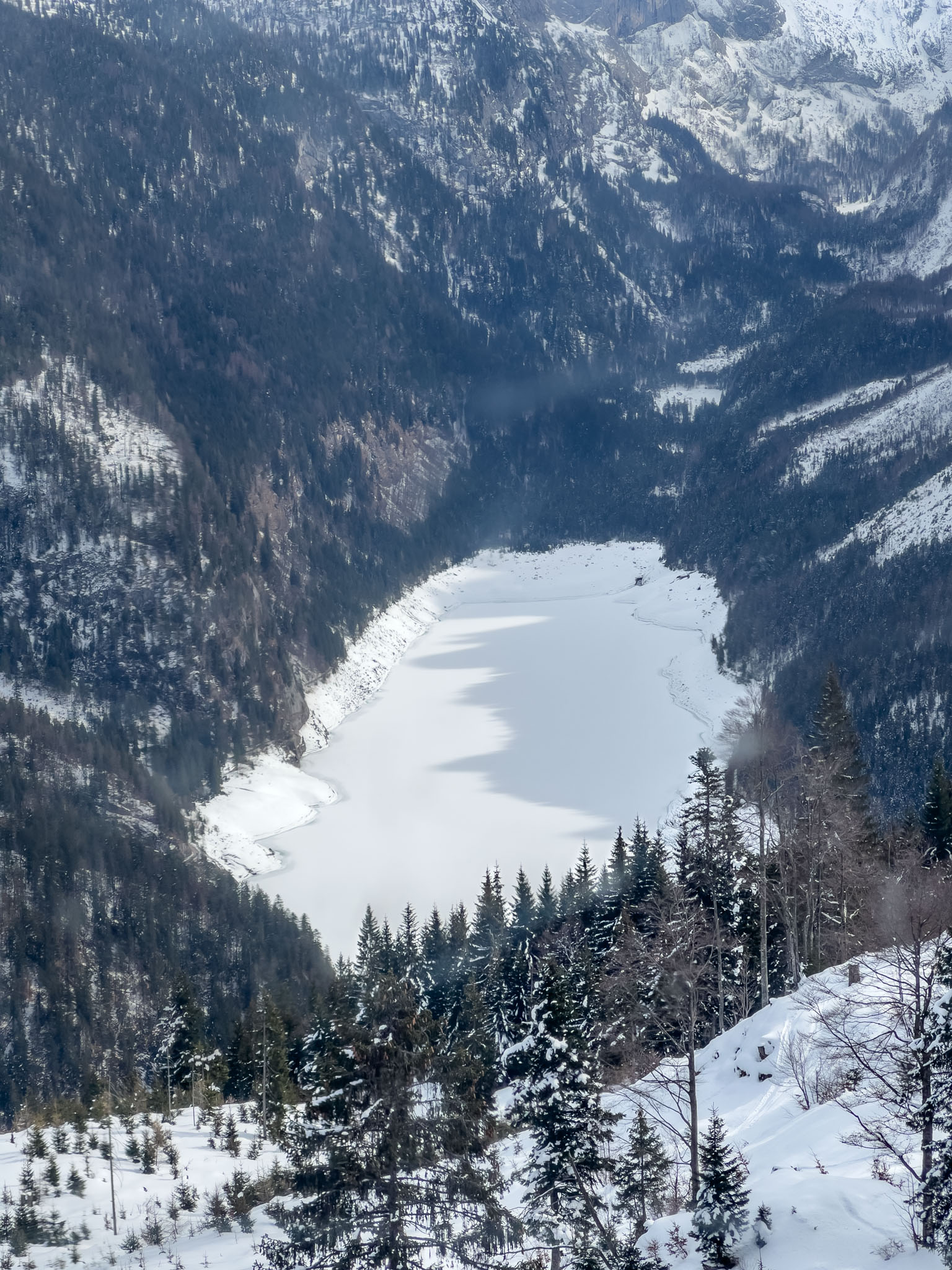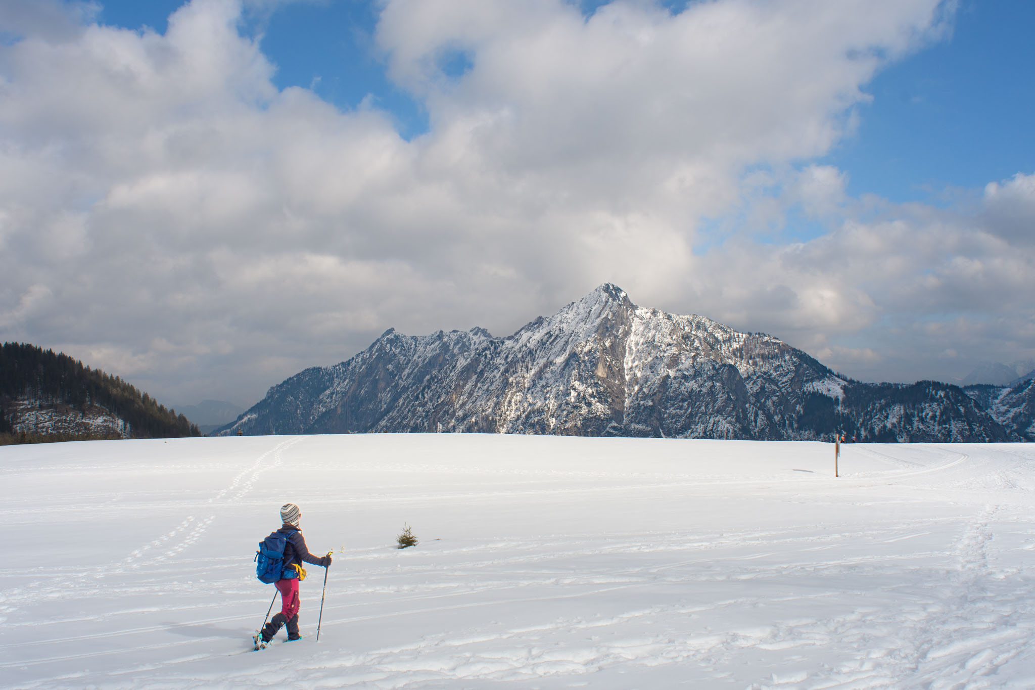 Ein weiterer sonniger Tag war angekündigt, so dass wir erneut früh aufgestanden sind, um Richtung Gosausee zu fahren. Mit der Seilbahn ging es auf die Zwieselalm am Gosaukamm, ganz in der Nähe, wo wir im letzten September auf dem SalzAlpenSteig die Kammseite gewechselt haben. Der heutige Schneeschuhtrail konnte nicht ganz mit denen von gestern mithalten (es ging mehr an Skipisten entlang), aber die Aussicht war wieder grandios. Der Dachsteingipfel war zwar weitestgehend von Wolken umgeben, aber in alle anderen Richtungen hatten wir perfekte Fernsicht – bis zum Großvenediger; Untersberg und Gamsfeld schienen beinahe zum Greifen nah.
