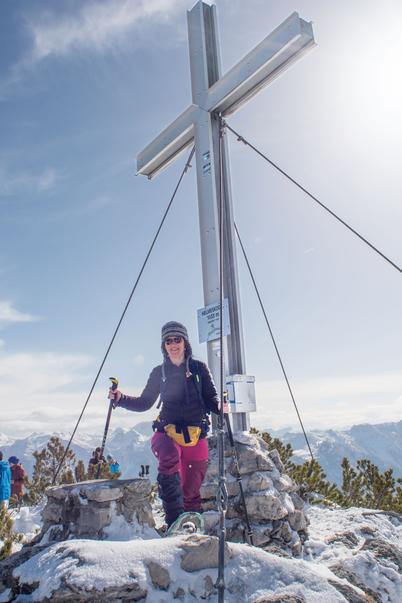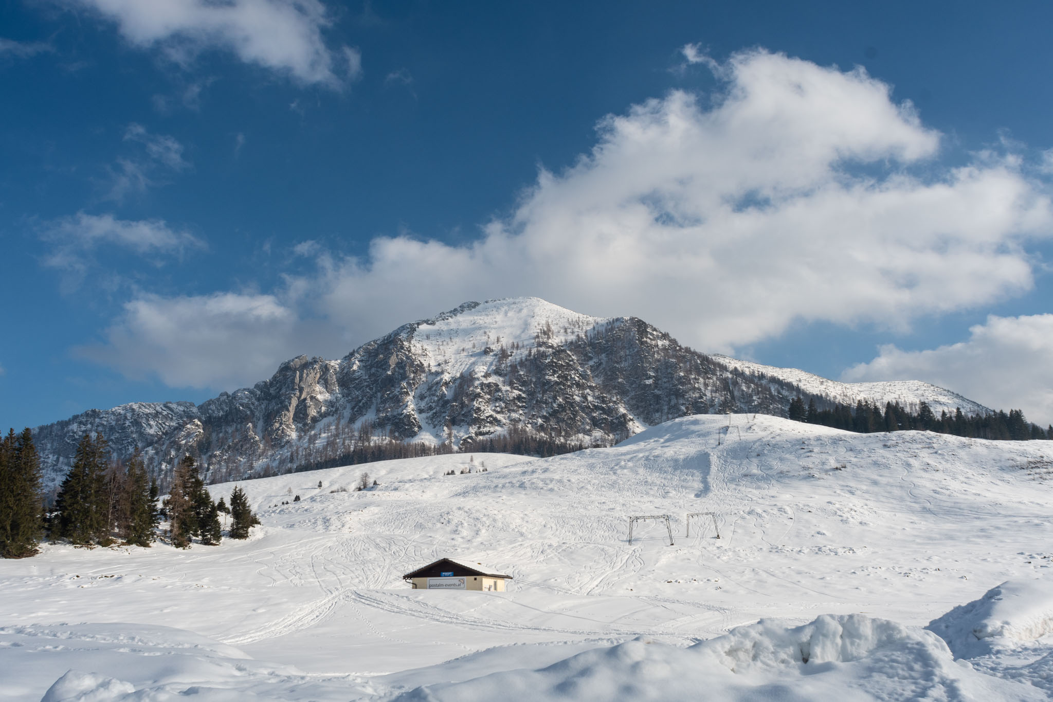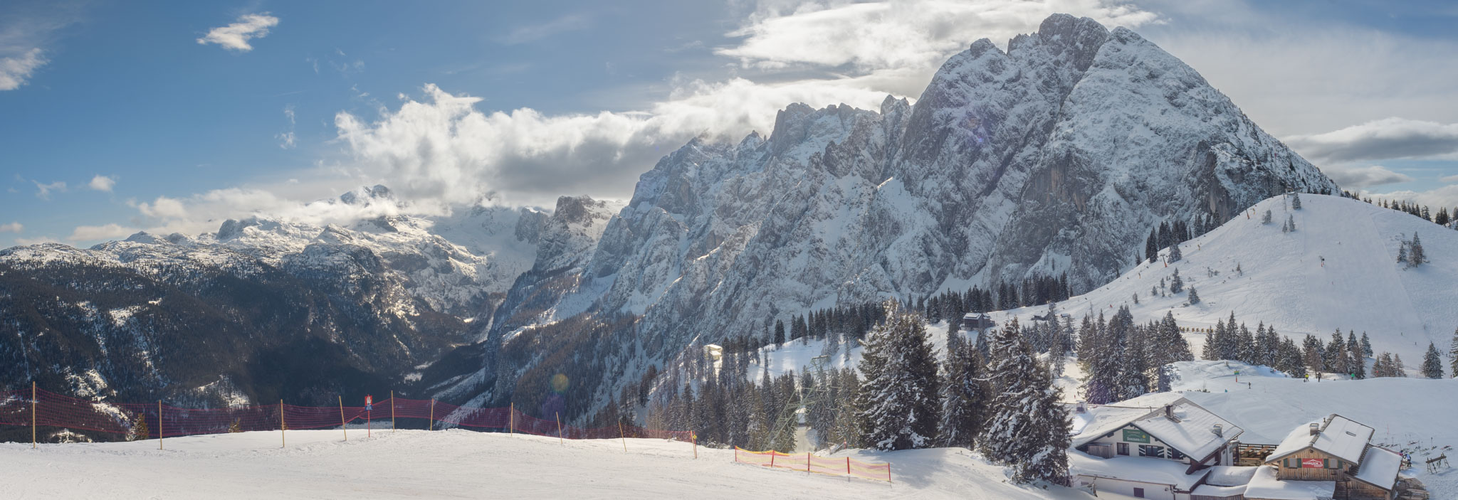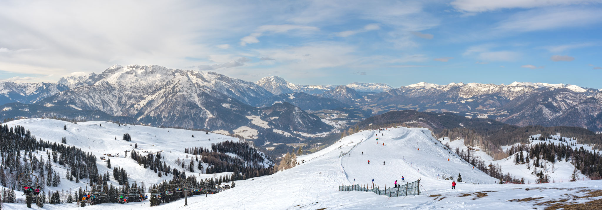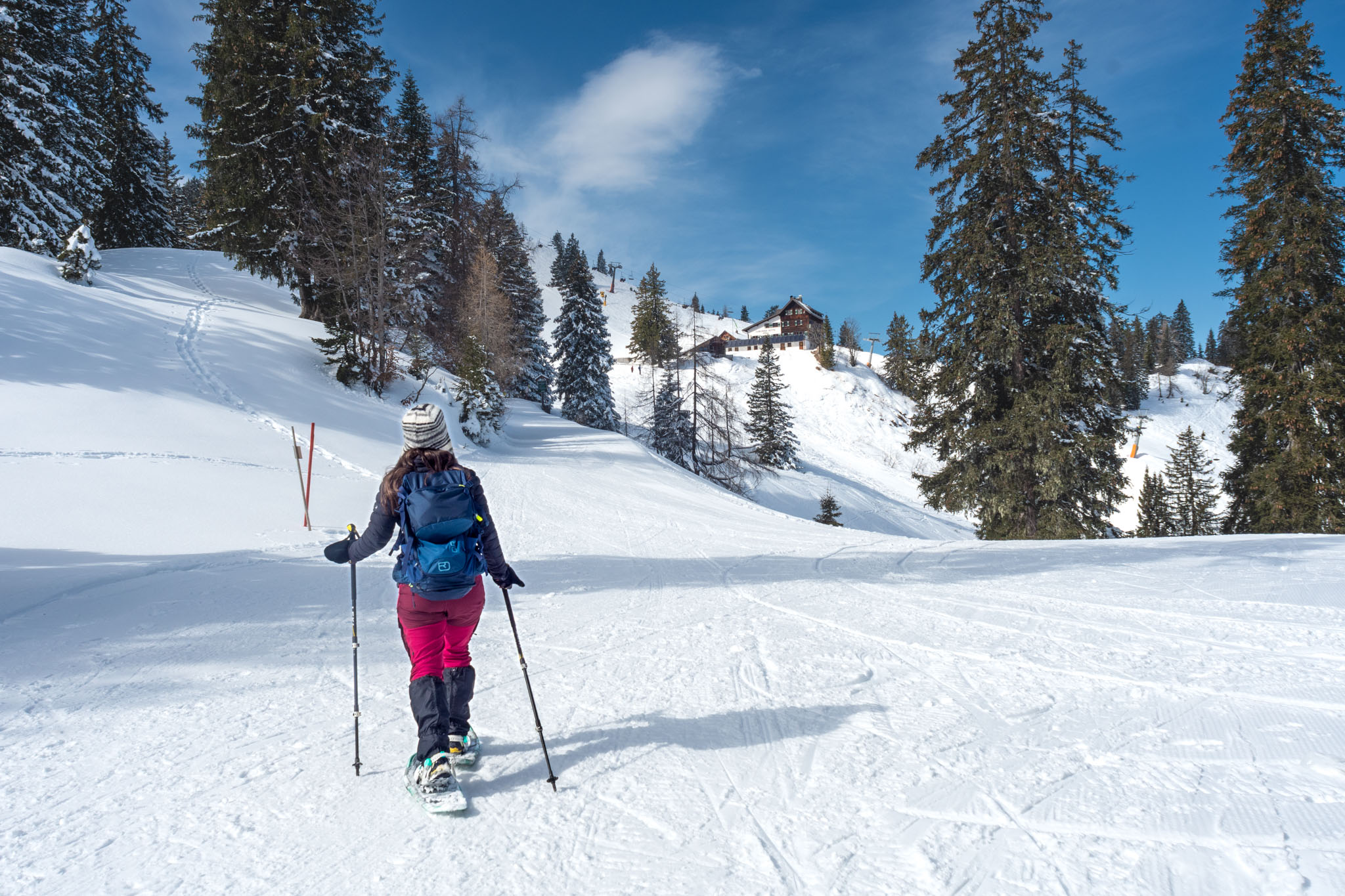 Ein weiterer sonniger Tag war angekündigt, so dass wir erneut früh aufgestanden sind, um Richtung Gosausee zu fahren. Mit der Seilbahn ging es auf die Zwieselalm am Gosaukamm, ganz in der Nähe, wo wir im letzten September auf dem SalzAlpenSteig die Kammseite gewechselt haben. Der heutige Schneeschuhtrail konnte nicht ganz mit denen von gestern mithalten (es ging mehr an Skipisten entlang), aber die Aussicht war wieder grandios. Der Dachsteingipfel war zwar weitestgehend von Wolken umgeben, aber in alle anderen Richtungen hatten wir perfekte Fernsicht – bis zum Großvenediger; Untersberg und Gamsfeld schienen beinahe zum Greifen nah.