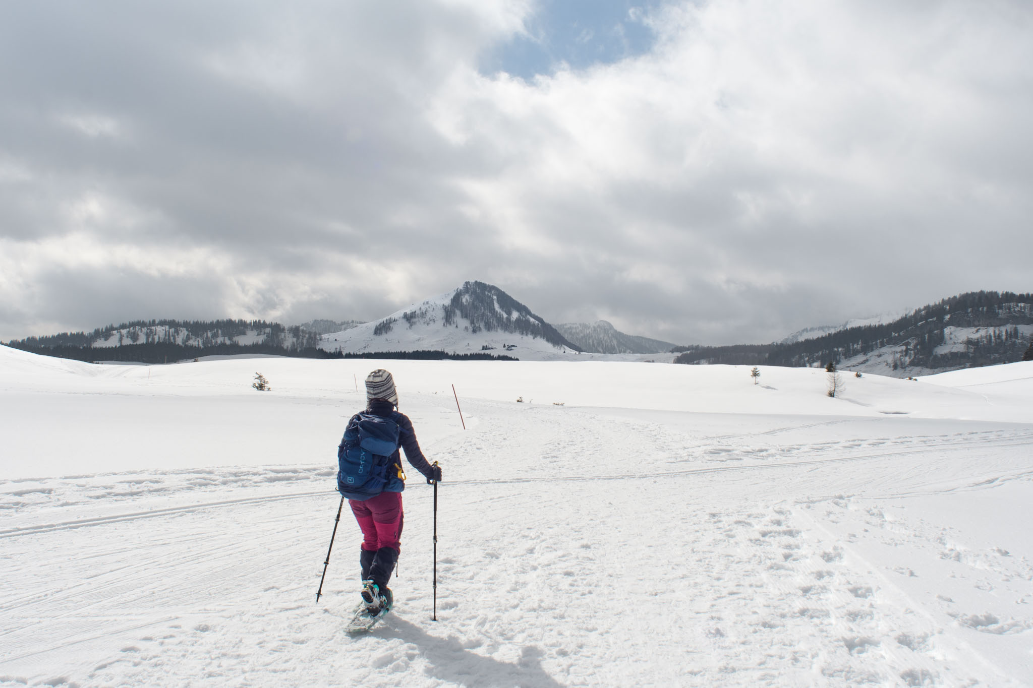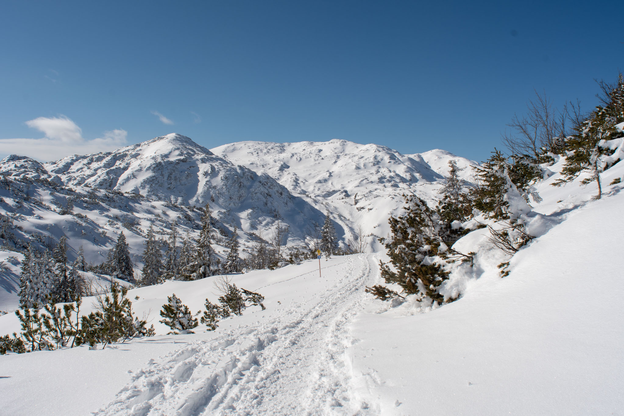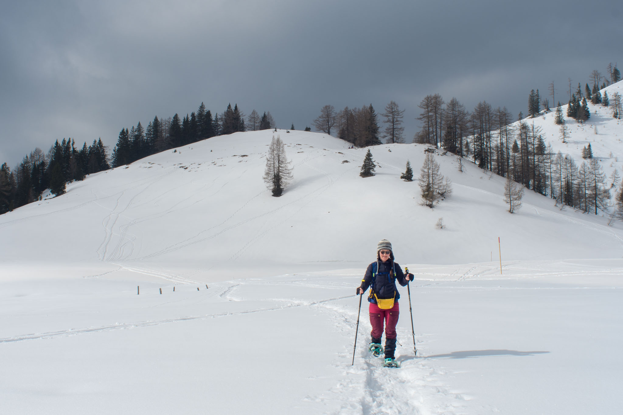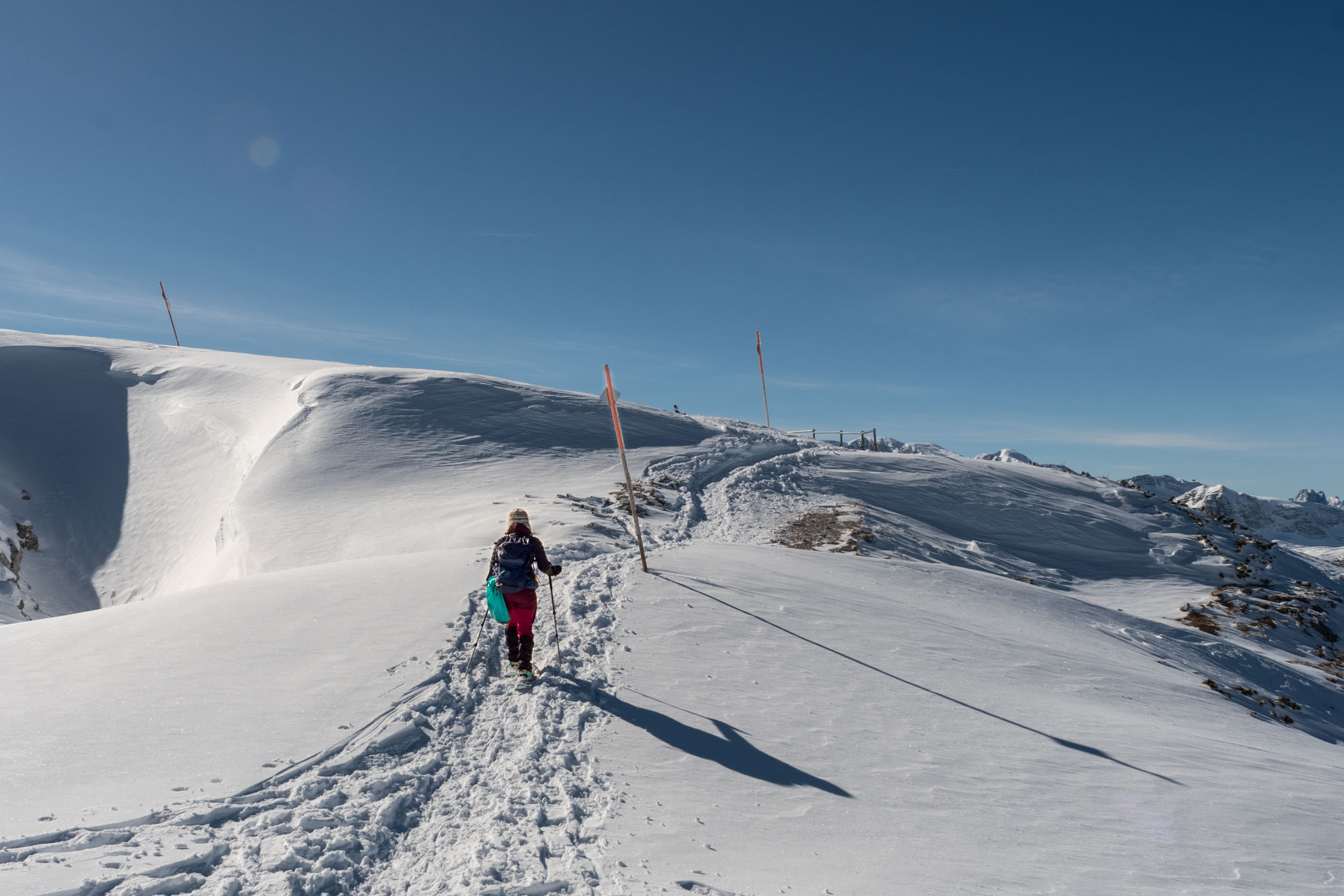 Ein weiterer sonniger Tag war angekündigt, so dass wir erneut früh aufgestanden sind, um Richtung Gosausee zu fahren. Mit der Seilbahn ging es auf die Zwieselalm am Gosaukamm, ganz in der Nähe, wo wir im letzten September auf dem SalzAlpenSteig die Kammseite gewechselt haben. Der heutige Schneeschuhtrail konnte nicht ganz mit denen von gestern mithalten (es ging mehr an Skipisten entlang), aber die Aussicht war wieder grandios. Der Dachsteingipfel war zwar weitestgehend von Wolken umgeben, aber in alle anderen Richtungen hatten wir perfekte Fernsicht – bis zum Großvenediger; Untersberg und Gamsfeld schienen beinahe zum Greifen nah.