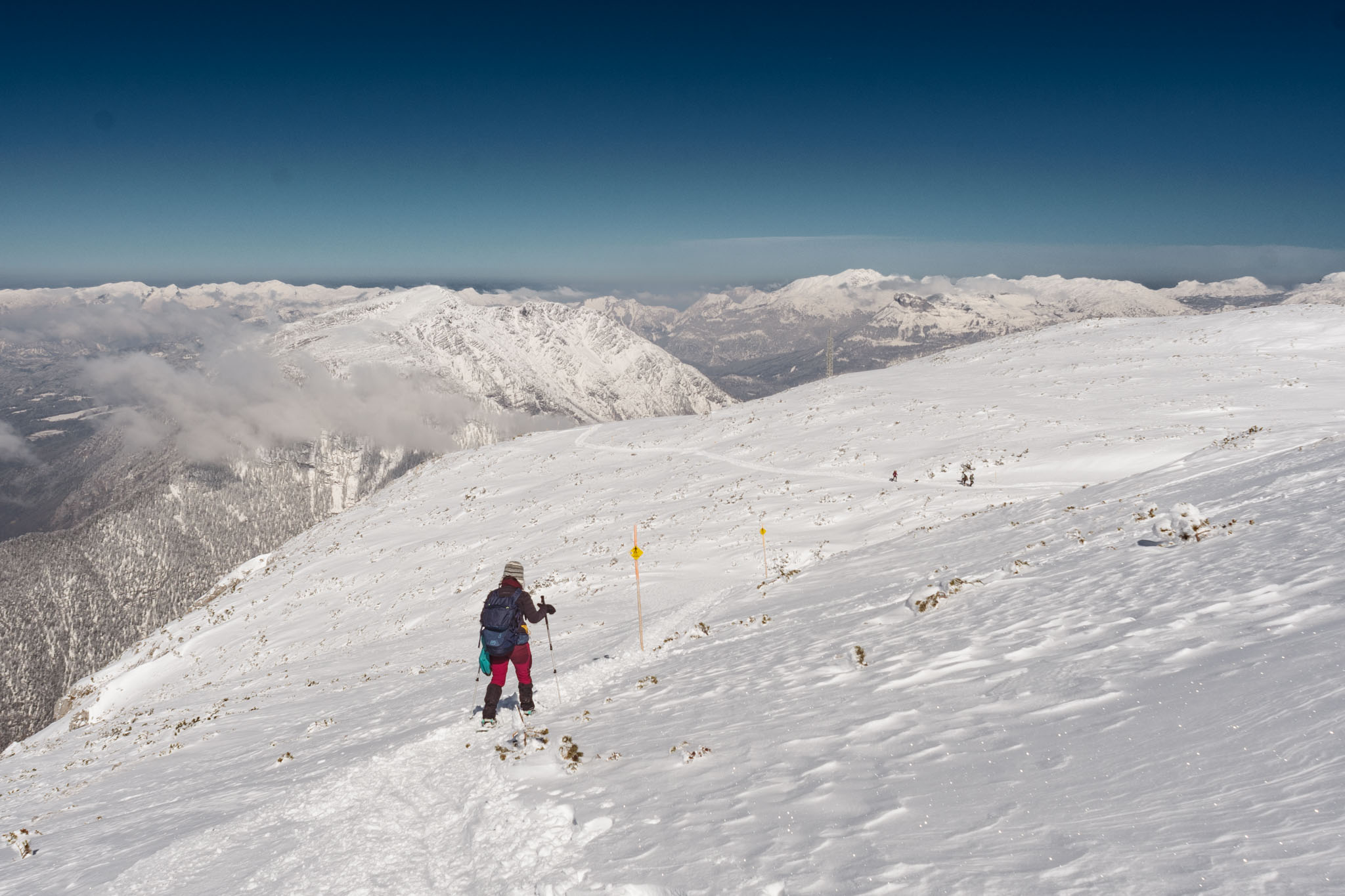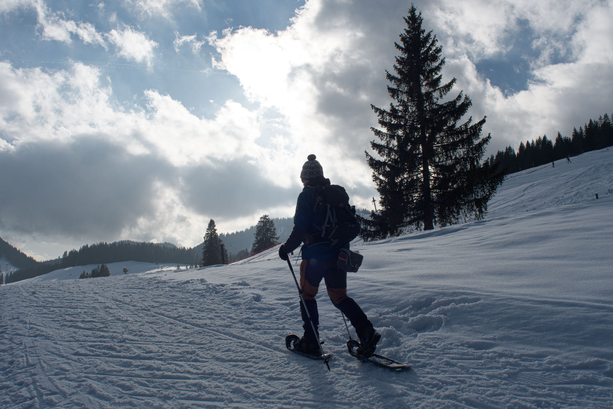 Jeweils mittwochs wird auf dem Feuerkogel oberhalb von Ebensee am Traunsee eine (kostenlose) geführte Schneeschuhtour angeboten, zu der wir uns ein paar Tage vorher angemeldet hatten. Es hat sich auch wirklich gelohnt, die geführte Tour mitzumachen, denn zum einen hat der Guide eine ganze Menge erzählt, angefangen bei der Entstehung der Region während der letzten Eiszeiten, bis hin zu Wissenswertem und Gefahren, wenn man frei im Gelände seine eigene Schneeschuhtour machen möchte. Zum anderen hätten wir es wahrscheinlich nicht geschafft, die landschaftlich schönsten Abschnitte der fünf angebotenen Trails mit der besten Aussicht auf eigene Faust zu kombinieren. Und die Aussicht war tatsächlich so gut, dass man bis zum Hochficht im Böhmerwald an der Grenze zwischen Oberösterreich und Tschechien sowie dem Großen Arber sehen konnte.
