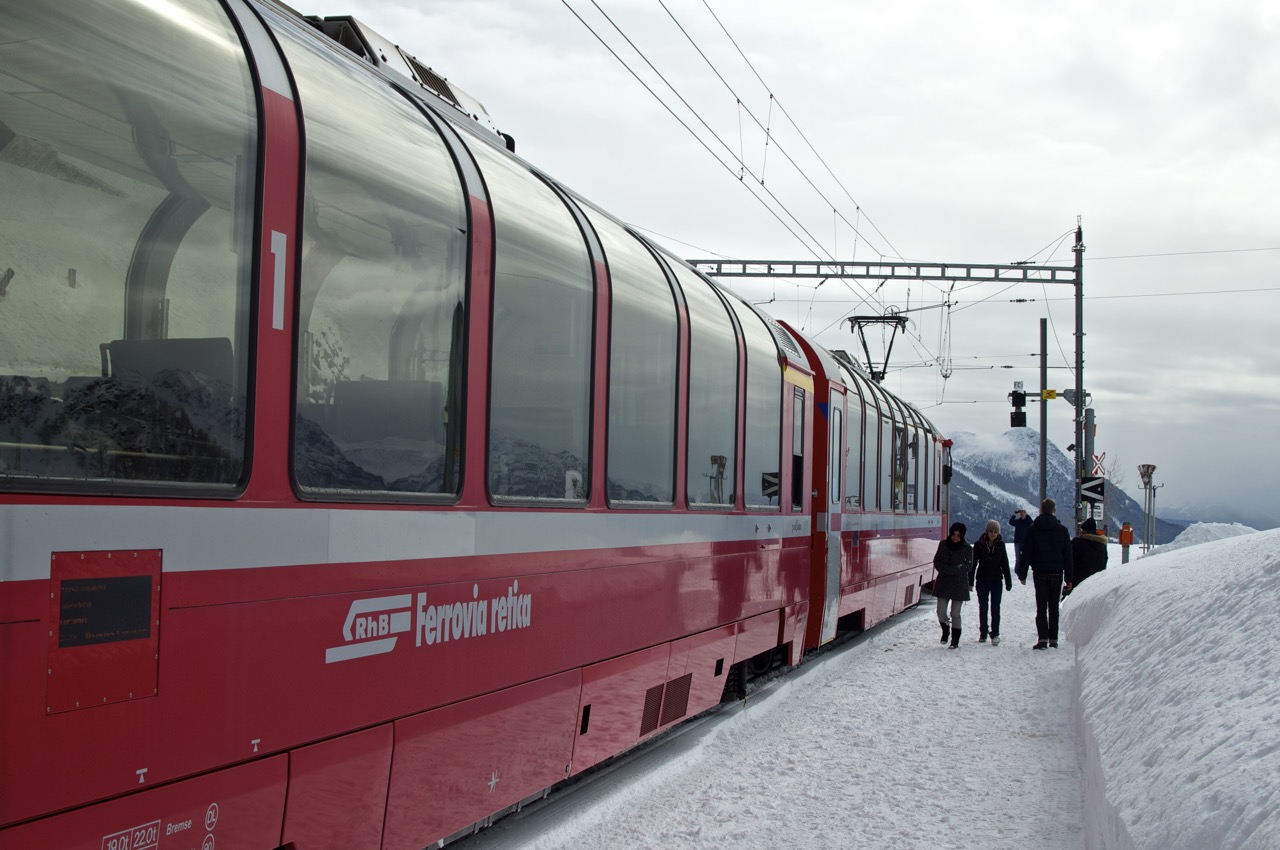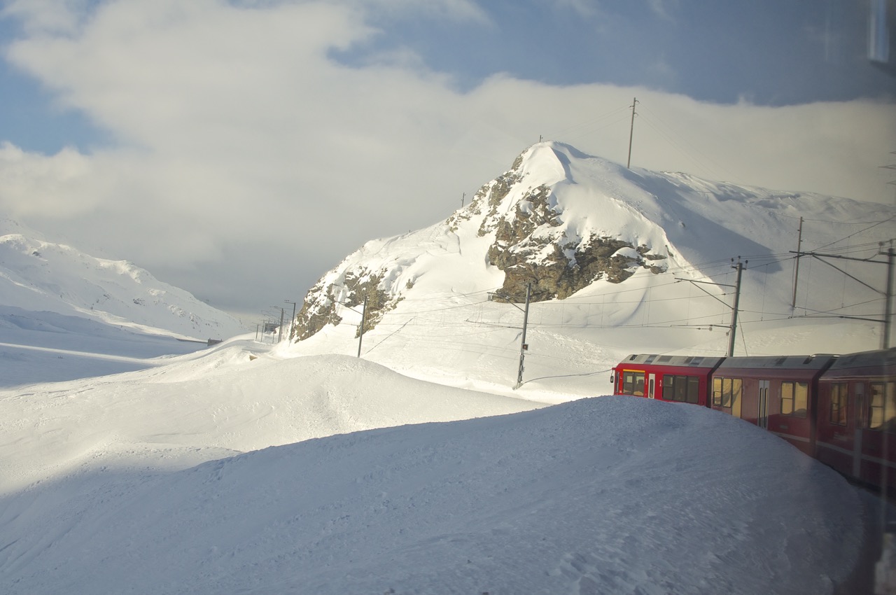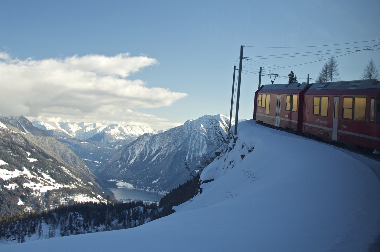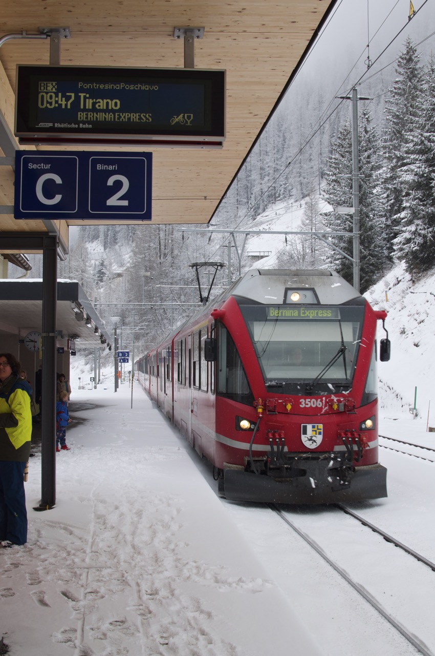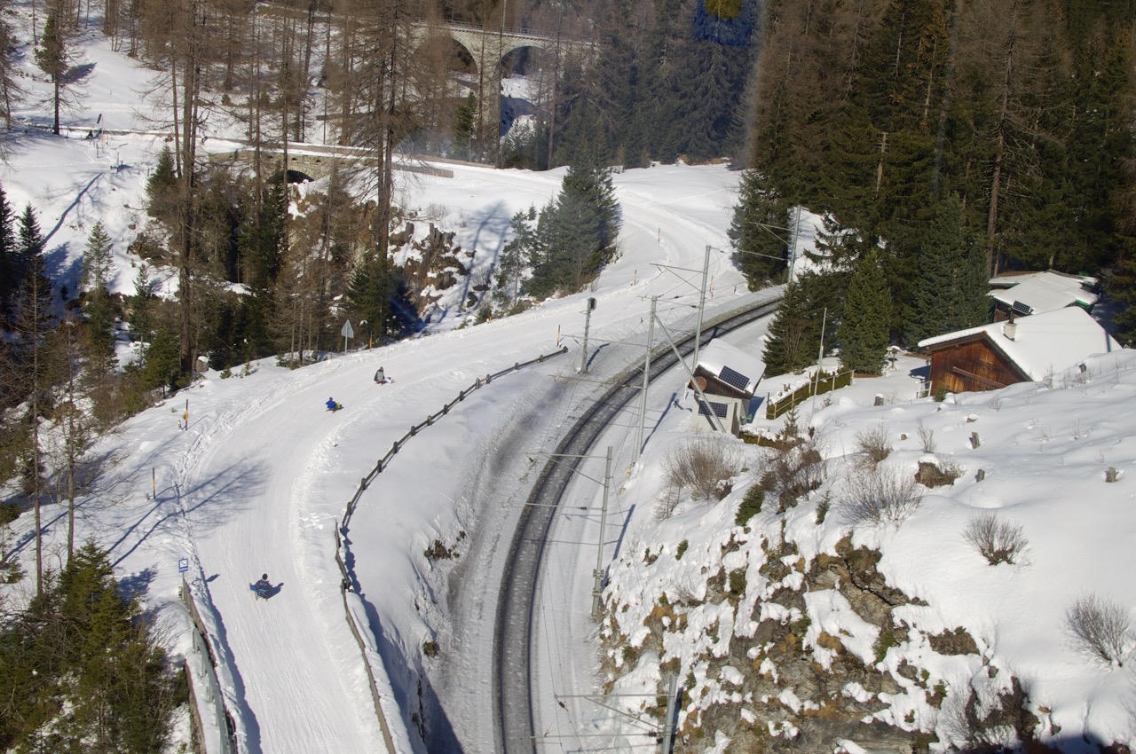 Als es nach vier Tagen über Nacht etwas schneite und die Schlittelbahn deshalb langsamer wurde, nutzen wir die Gelegenheit zu einem Ausflug mit dem Bernina Express nach Tirano (Italien). Auf 57 km Luftlinie überwindet die Albula- und Bernina-Linie mehr als 2.700 Höhenmeter von Bergün (1.367 m) über Ospizia Bernina (2.253 m) nach Tirano (429 m). Während man über den Berninapass an Gletschern und 4.000-ern vorbei fährt, wachsen am Zielort Palmen.