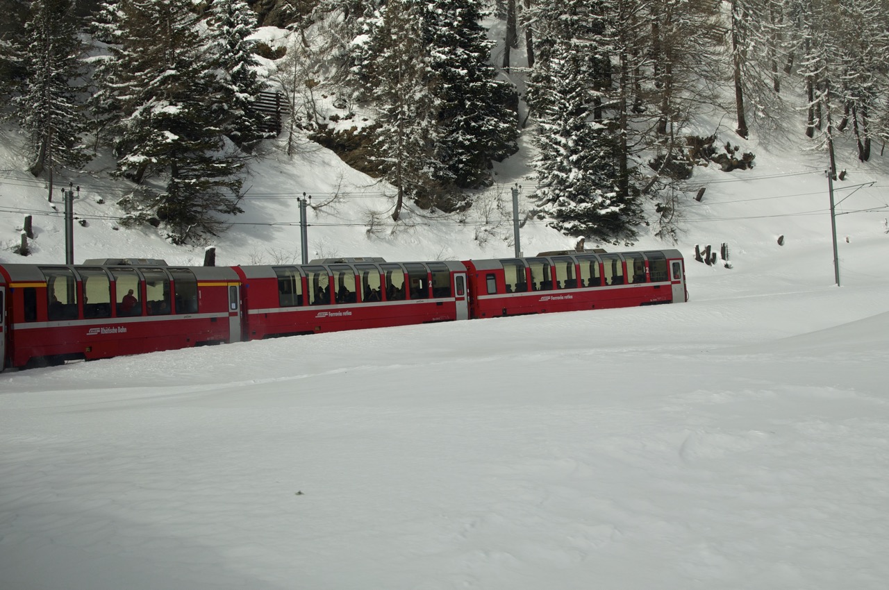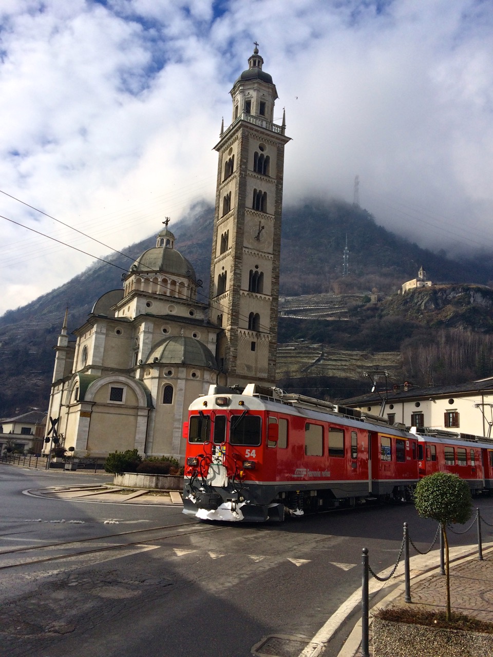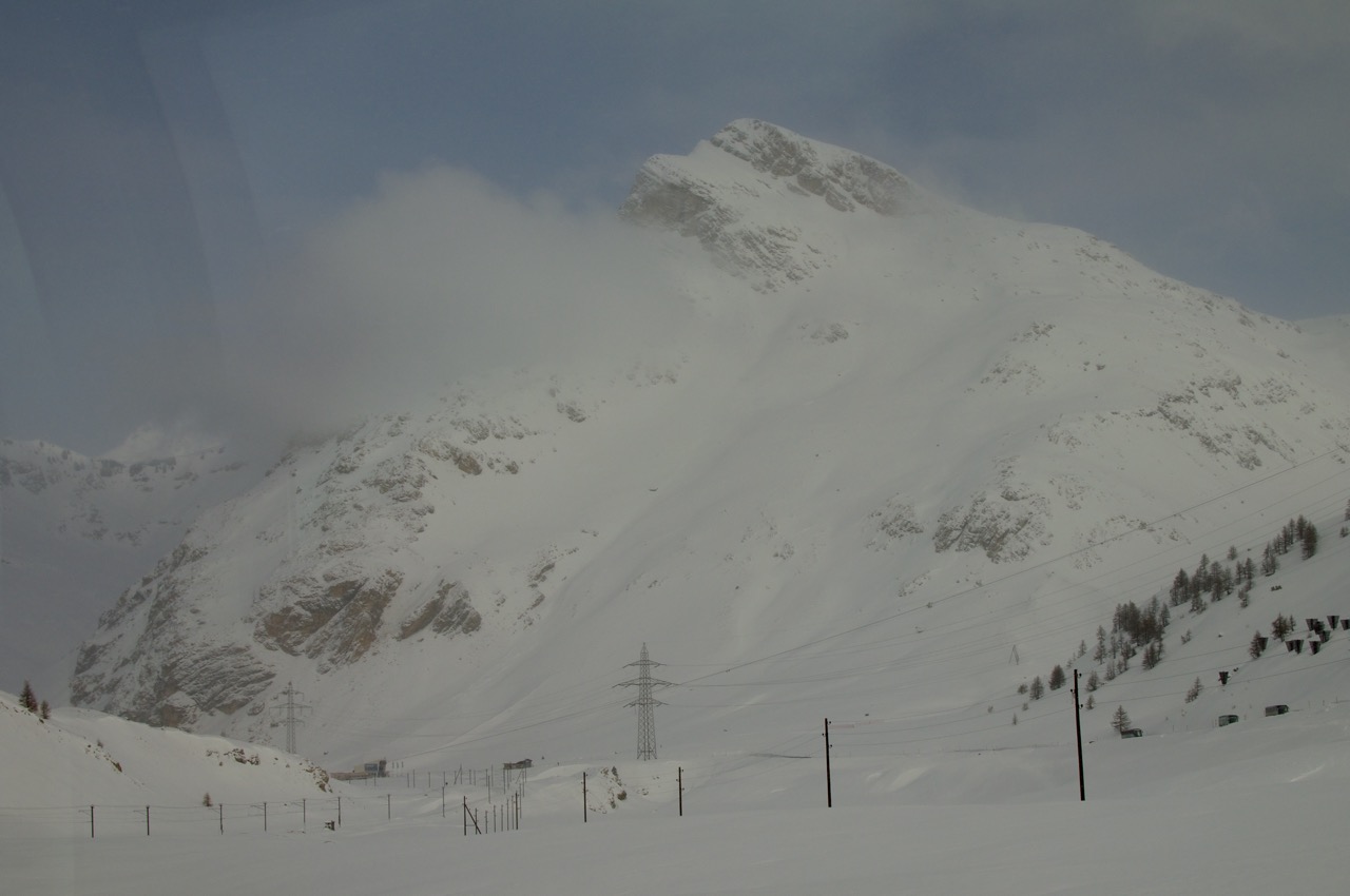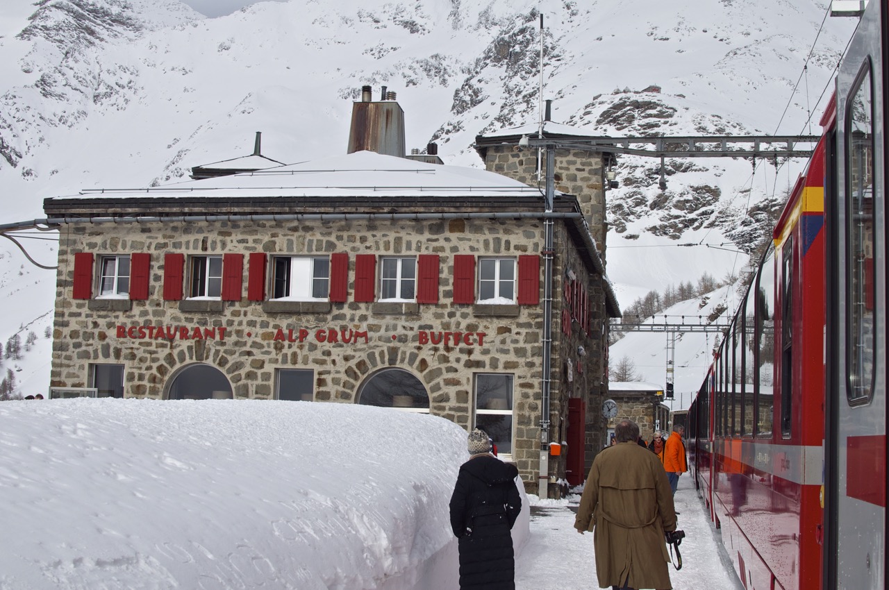 Als es nach vier Tagen über Nacht etwas schneite und die Schlittelbahn deshalb langsamer wurde, nutzen wir die Gelegenheit zu einem Ausflug mit dem Bernina Express nach Tirano (Italien). Auf 57 km Luftlinie überwindet die Albula- und Bernina-Linie mehr als 2.700 Höhenmeter von Bergün (1.367 m) über Ospizia Bernina (2.253 m) nach Tirano (429 m). Während man über den Berninapass an Gletschern und 4.000-ern vorbei fährt, wachsen am Zielort Palmen.