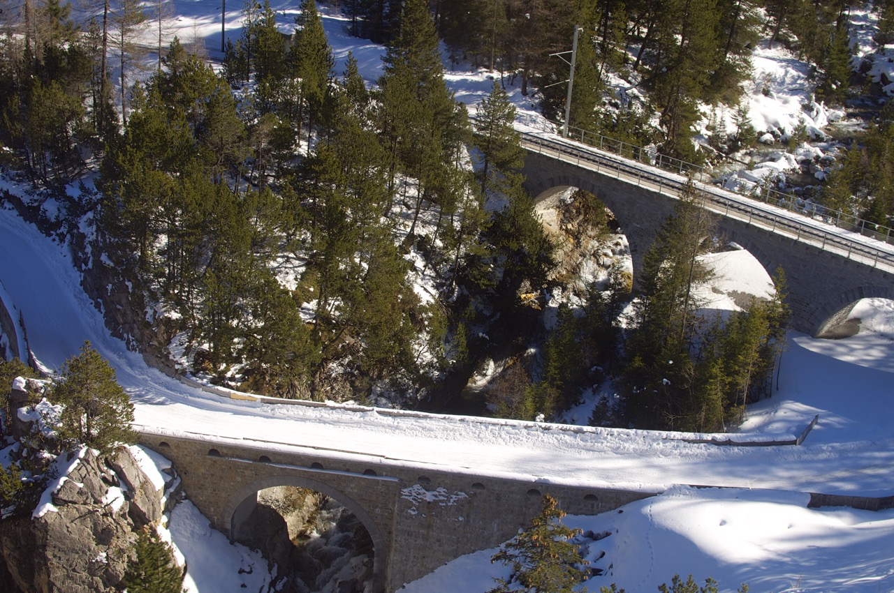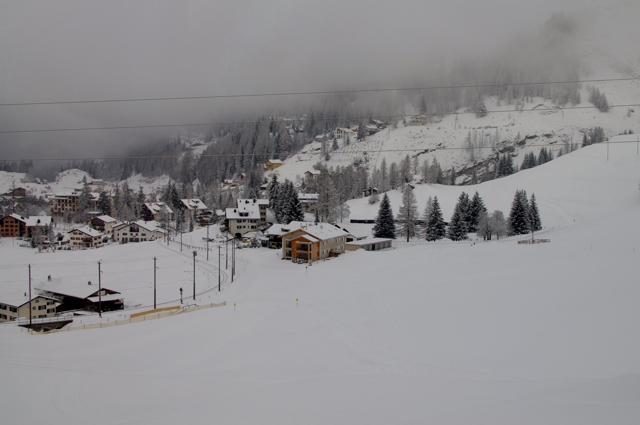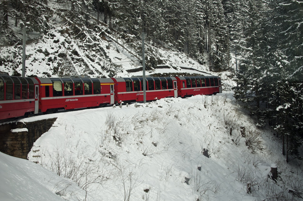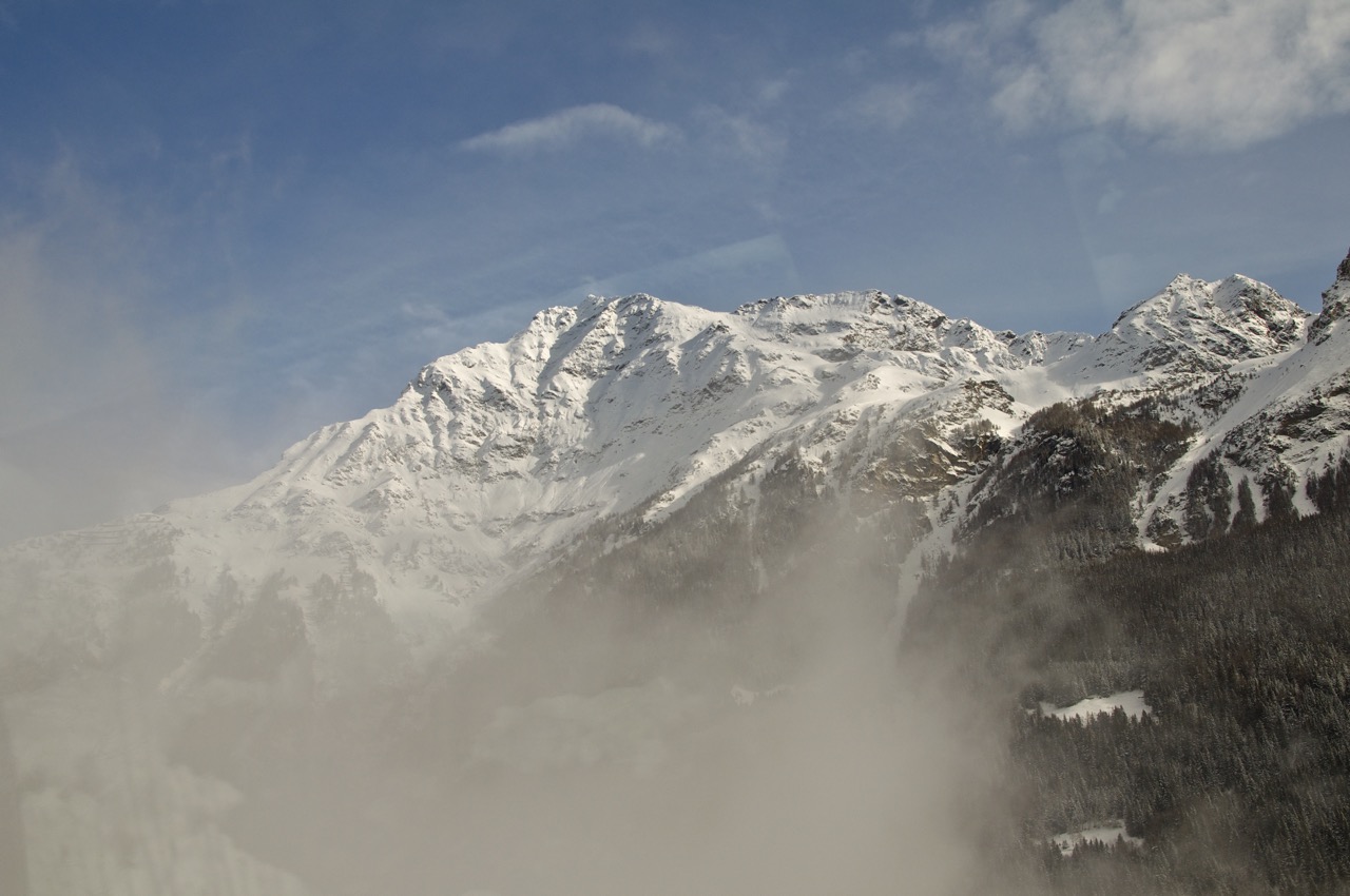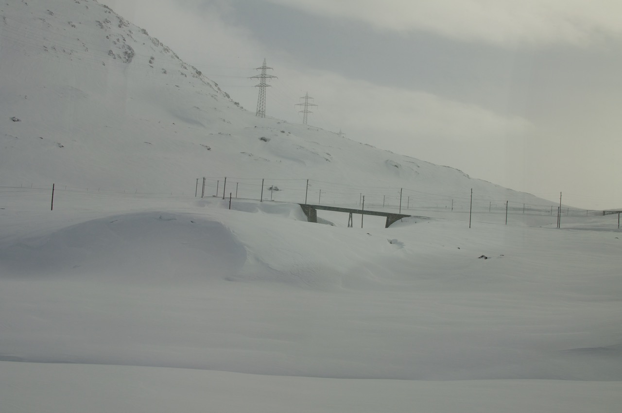 Als es nach vier Tagen über Nacht etwas schneite und die Schlittelbahn deshalb langsamer wurde, nutzen wir die Gelegenheit zu einem Ausflug mit dem Bernina Express nach Tirano (Italien). Auf 57 km Luftlinie überwindet die Albula- und Bernina-Linie mehr als 2.700 Höhenmeter von Bergün (1.367 m) über Ospizia Bernina (2.253 m) nach Tirano (429 m). Während man über den Berninapass an Gletschern und 4.000-ern vorbei fährt, wachsen am Zielort Palmen.