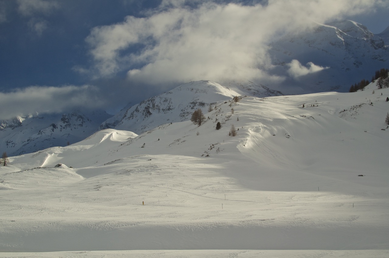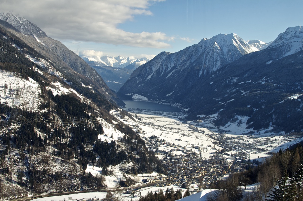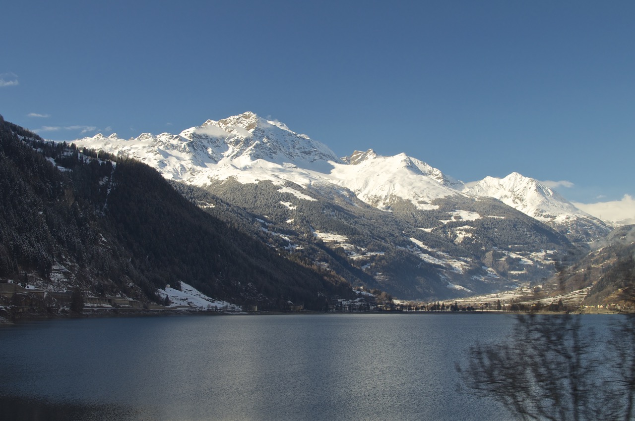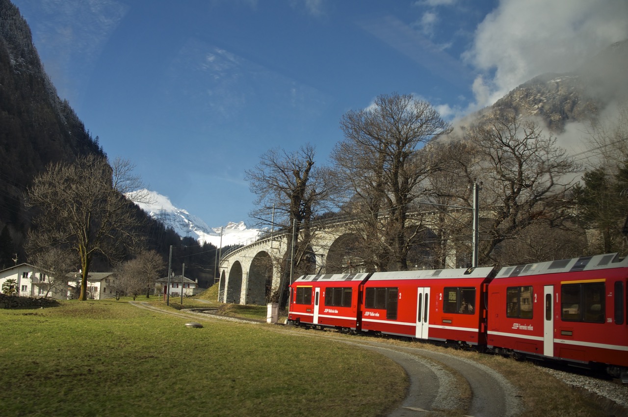 Als es nach vier Tagen über Nacht etwas schneite und die Schlittelbahn deshalb langsamer wurde, nutzen wir die Gelegenheit zu einem Ausflug mit dem Bernina Express nach Tirano (Italien). Auf 57 km Luftlinie überwindet die Albula- und Bernina-Linie mehr als 2.700 Höhenmeter von Bergün (1.367 m) über Ospizia Bernina (2.253 m) nach Tirano (429 m). Während man über den Berninapass an Gletschern und 4.000-ern vorbei fährt, wachsen am Zielort Palmen.