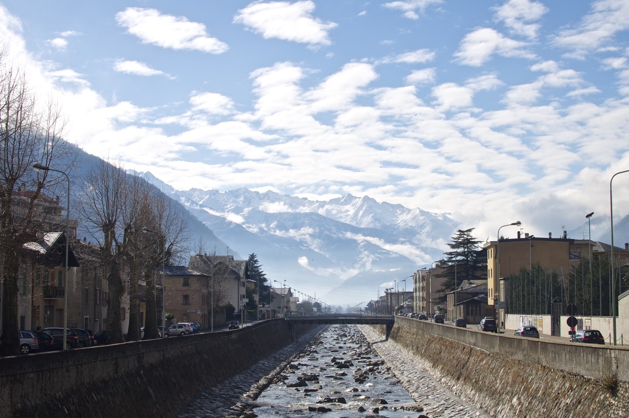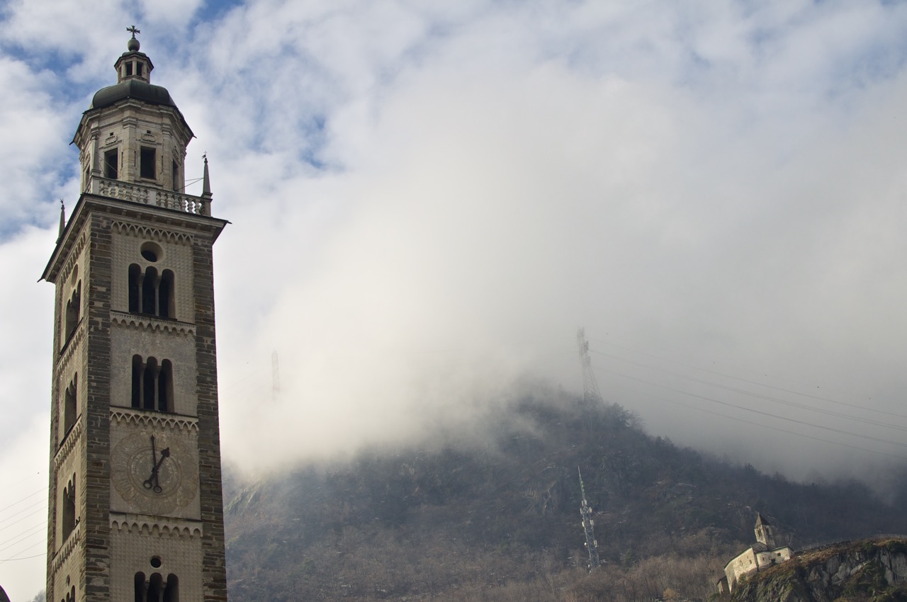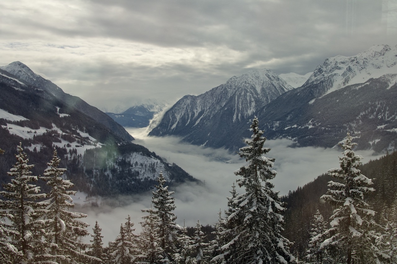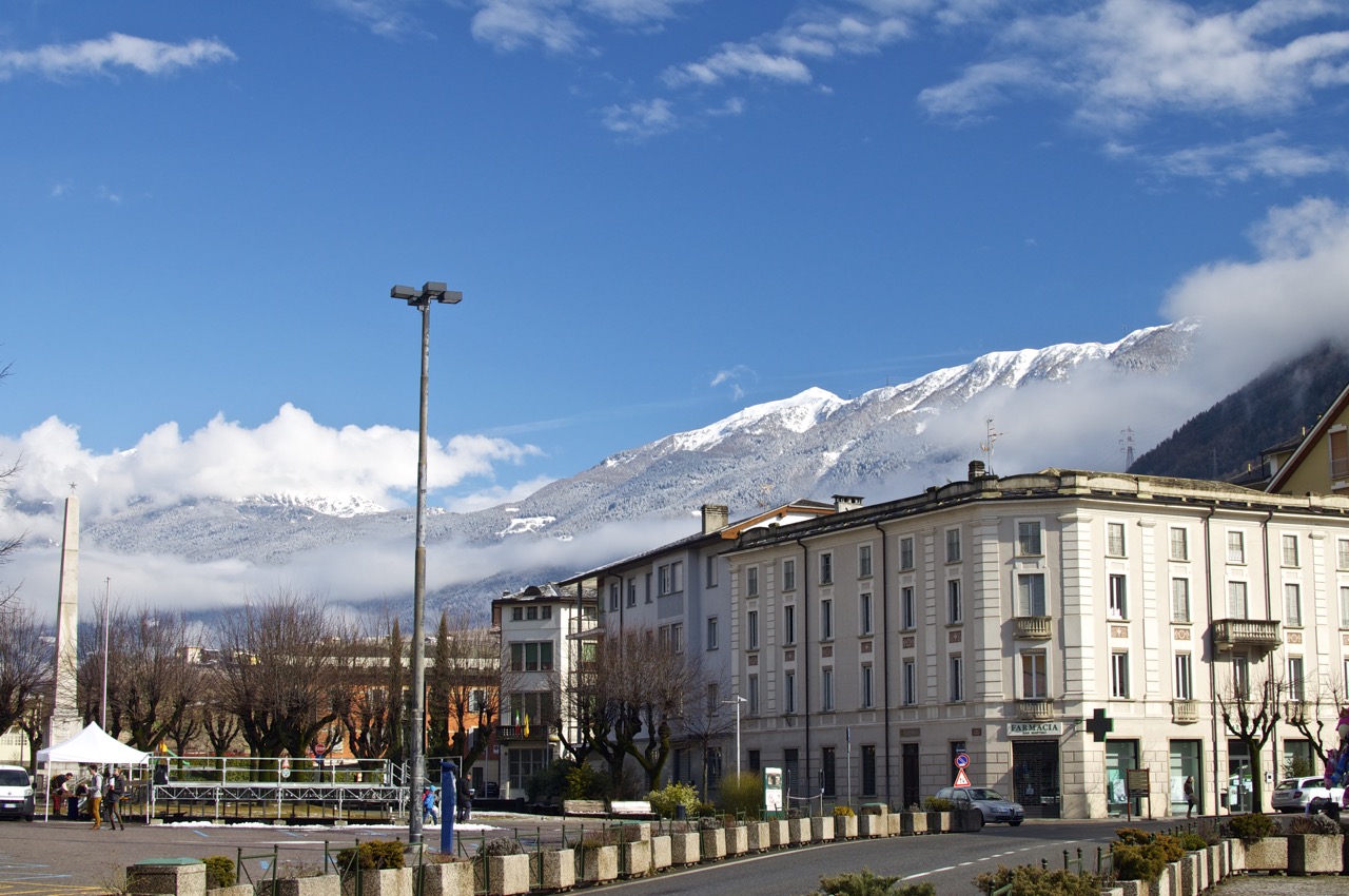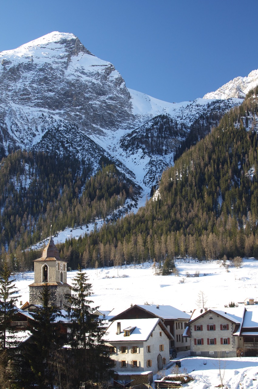 Als es nach vier Tagen über Nacht etwas schneite und die Schlittelbahn deshalb langsamer wurde, nutzen wir die Gelegenheit zu einem Ausflug mit dem Bernina Express nach Tirano (Italien). Auf 57 km Luftlinie überwindet die Albula- und Bernina-Linie mehr als 2.700 Höhenmeter von Bergün (1.367 m) über Ospizia Bernina (2.253 m) nach Tirano (429 m). Während man über den Berninapass an Gletschern und 4.000-ern vorbei fährt, wachsen am Zielort Palmen.