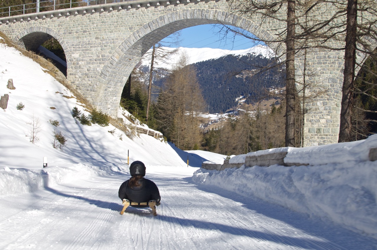 Schlittenfahren in Bergün sowie je ein Ausflug mit dem Bernina Express nach Tirano (Italien) sowie ins Oberengadin (St. Moritz)