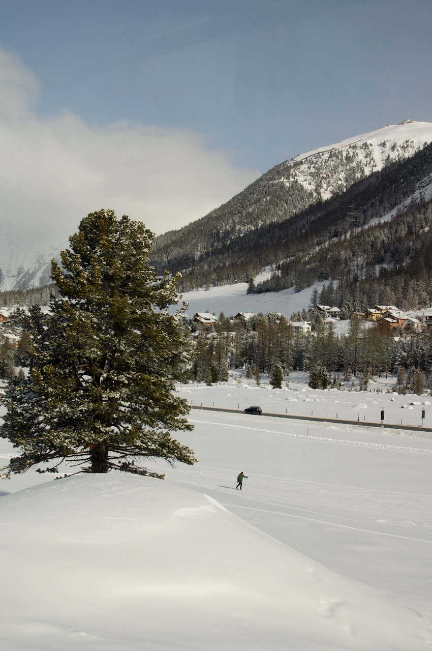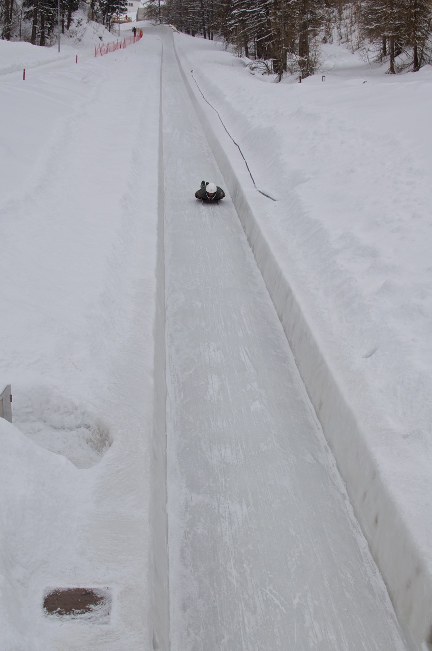 Am letzten Tag ging es nach abermaligem Schneefall zum Wandern ins Oberengadin (Samedan/St. Moritz), wo wir auf dem Olympia Bobrun St. Moritz–Celerina Skeleton-Fahrern zusahen und einen spektakulären Abflug aus dem Eiskanal (leider ohne Foto) beobachteten.