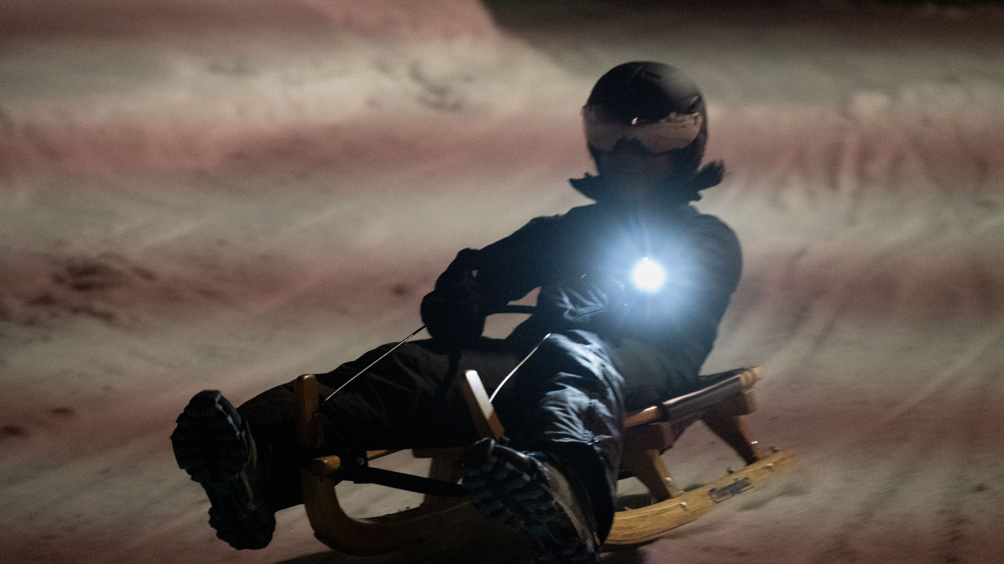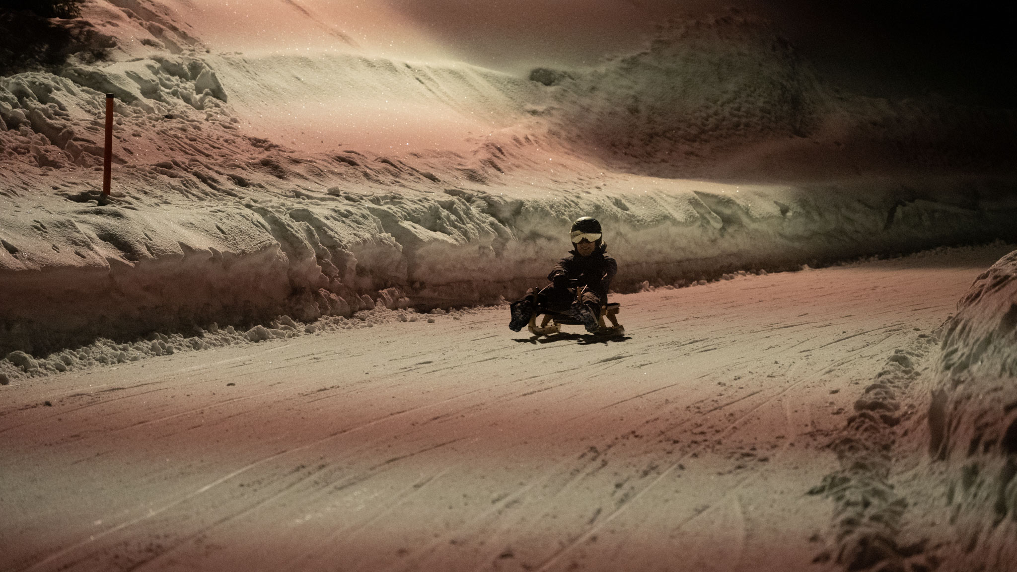 Das schöne Wetter mit viel Sonne hat uns fürchten lassen, dass die Bahn sehr weich und langsam ist. Allerdings hatte man uns beim Schlittenverleih am Nachmittag schon versprochen, dass die Bahn ziemlich flott ist und so war es dann auch – wir konnten die heutige Nachtfahrt voll genießen.