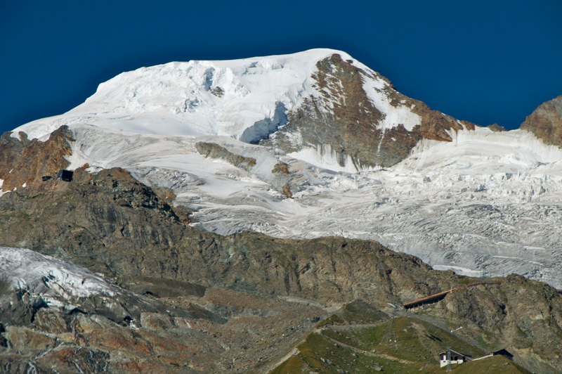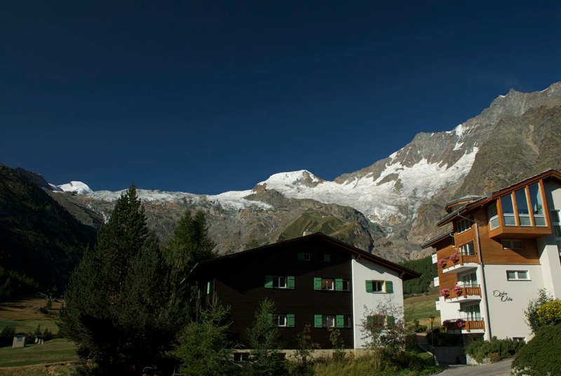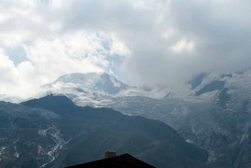 Unsere Ferienwohnung und die Aussicht von ihr. Am Ankunftstag (22. August) war die Aussicht auf die 4000-er noch nicht perfekt - es war einigermaßen bewölkt, doch schon am ersten Morgen (23. August) war die Aussicht so, wie wir uns dies vorgstellt hatten.
