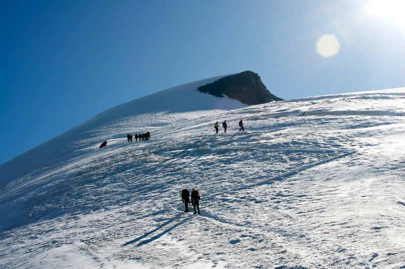 Heute gab es den Höhepunkt unseres Urlaubs: Die Sammlung der von uns bestiegenen Viertausender hat sich wieder einmal erweitert. Sie besteht nun (nach dem Breithorn in Zermatt vor drei Jahren) aus zwei Exemplaren ;-)