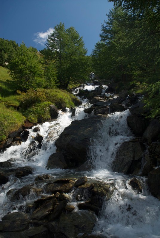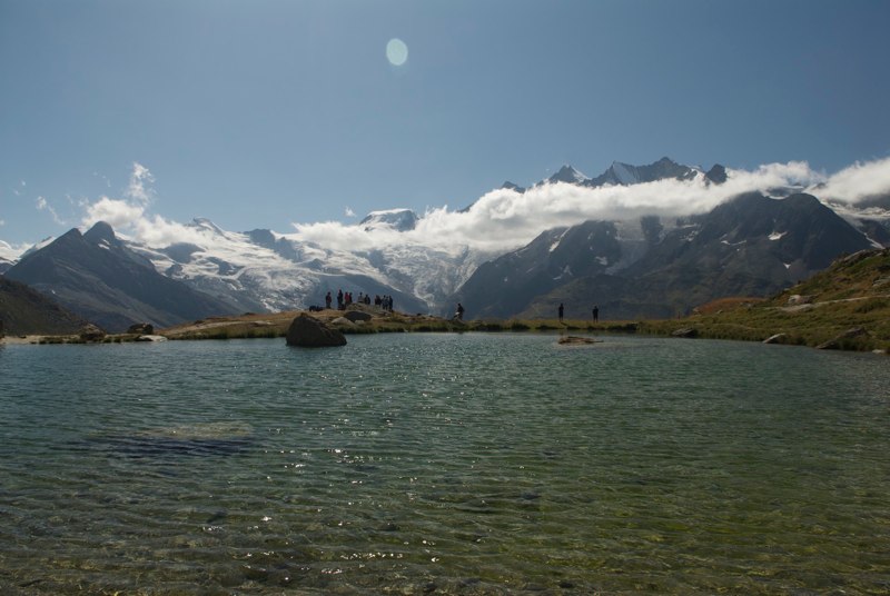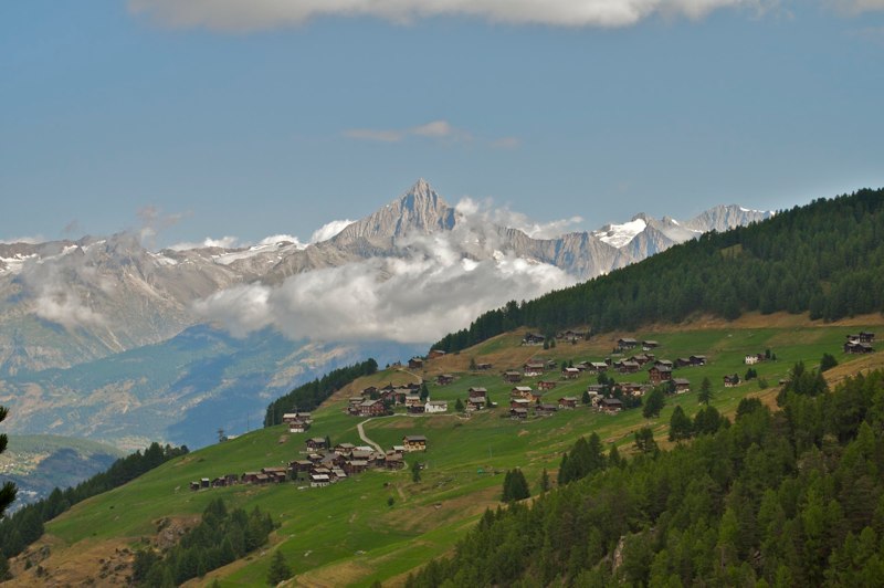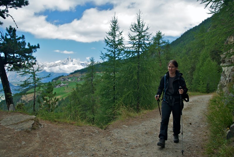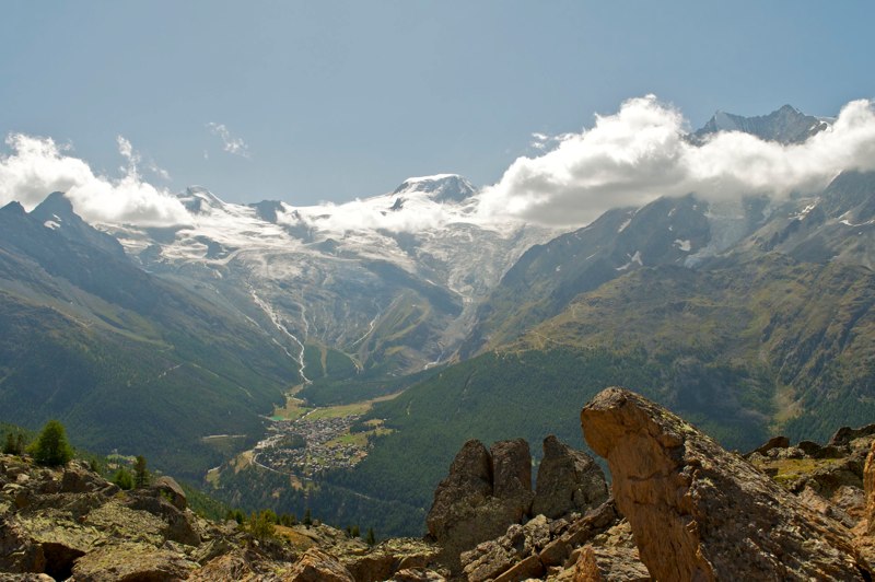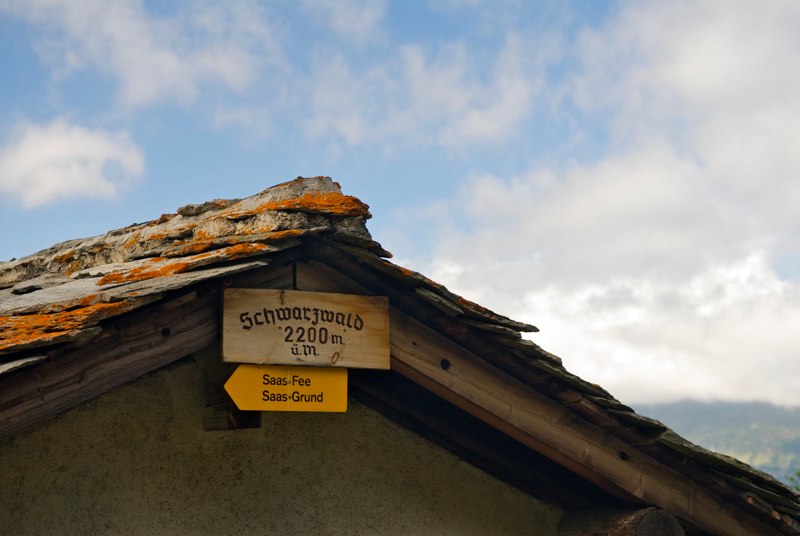 Heute ging es das gesamte Saastal am Osthang entlang. Gestartet sind wir in Gspon, oberhalb von Stalden (wo sich das Tal von Zermatt und das Saastal vereinen). Von dort zum Kreuzboden oberhalb von Saas-Grund geht es ziemlich konstant auf 2.000 - 2.500 m Höhe nach Süden, den Viertausendern des Saastals entgegen.