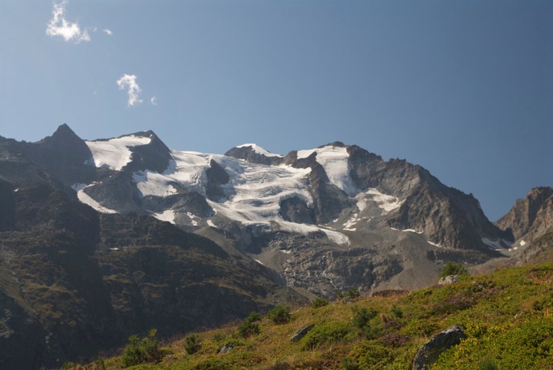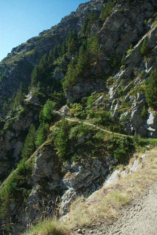 Der Weg war dann ein echter Höhenweg, von dem man gefühlte drei Stunden (es waren nur zwei) ein schmales Band im Fels entlang ging, das ca. 30-70 cm breit war, regelmäßig mit Seilsicherung versehen war und bei dem es links immer zwischen 500 und 1.000 Meter senkrecht nach unten ging. Immerhin wurden unsere Strapazen wieder einmal durch herrliches Wetter belohnt (schwitz), sowie am Start durch eine Aussicht aufs Matterhorn (das hatten wir bisher nur vom Allalinhorn aus gesehen) und durch eine tatsächlich um Nuancen andere Sicht auf all die Berge, die wir schon die vergangenen zehn Tage täglich gesehen haben ;-)