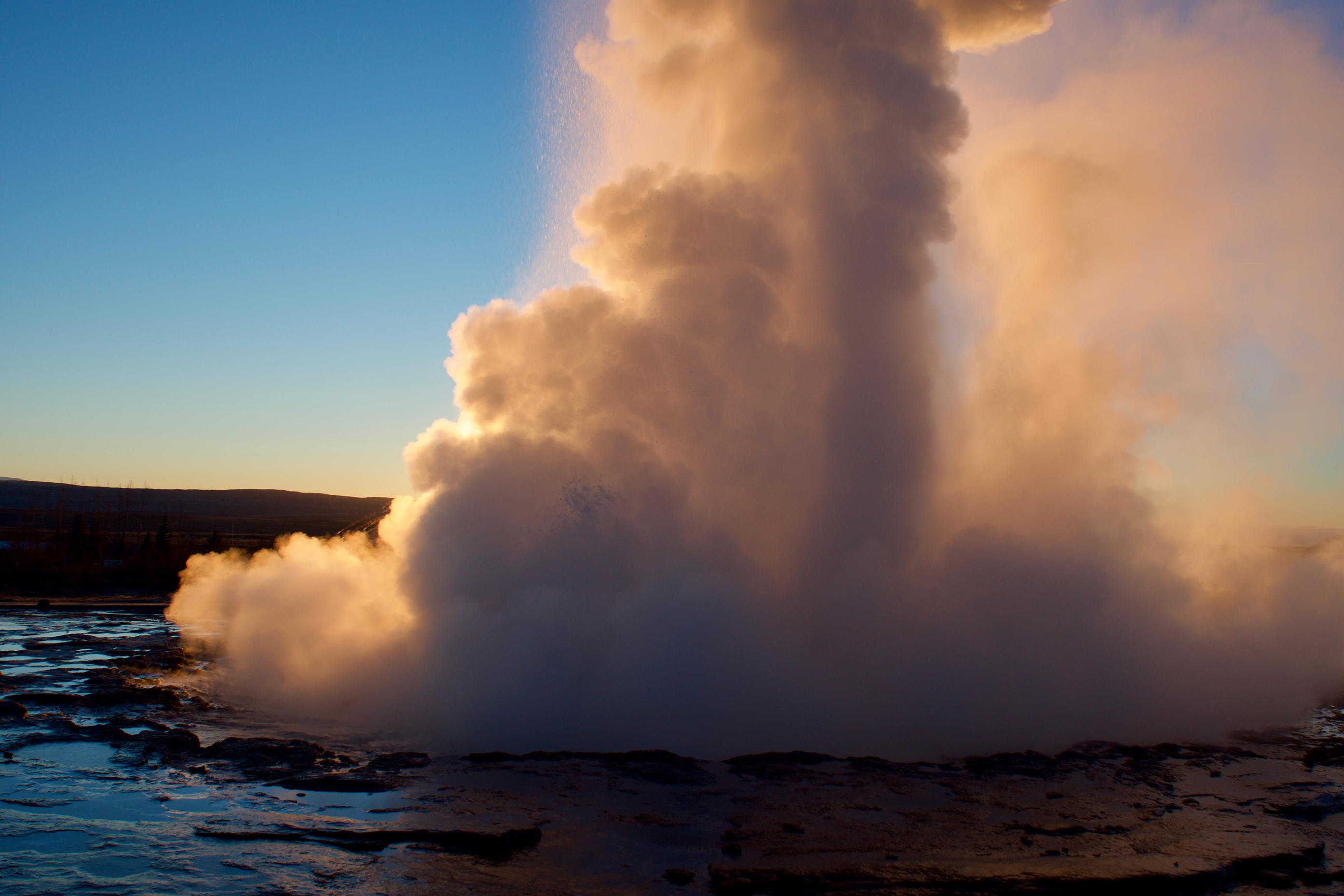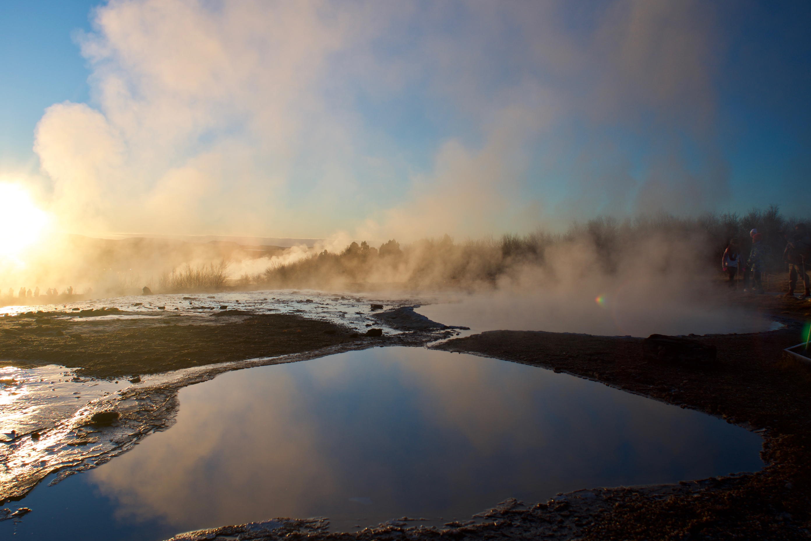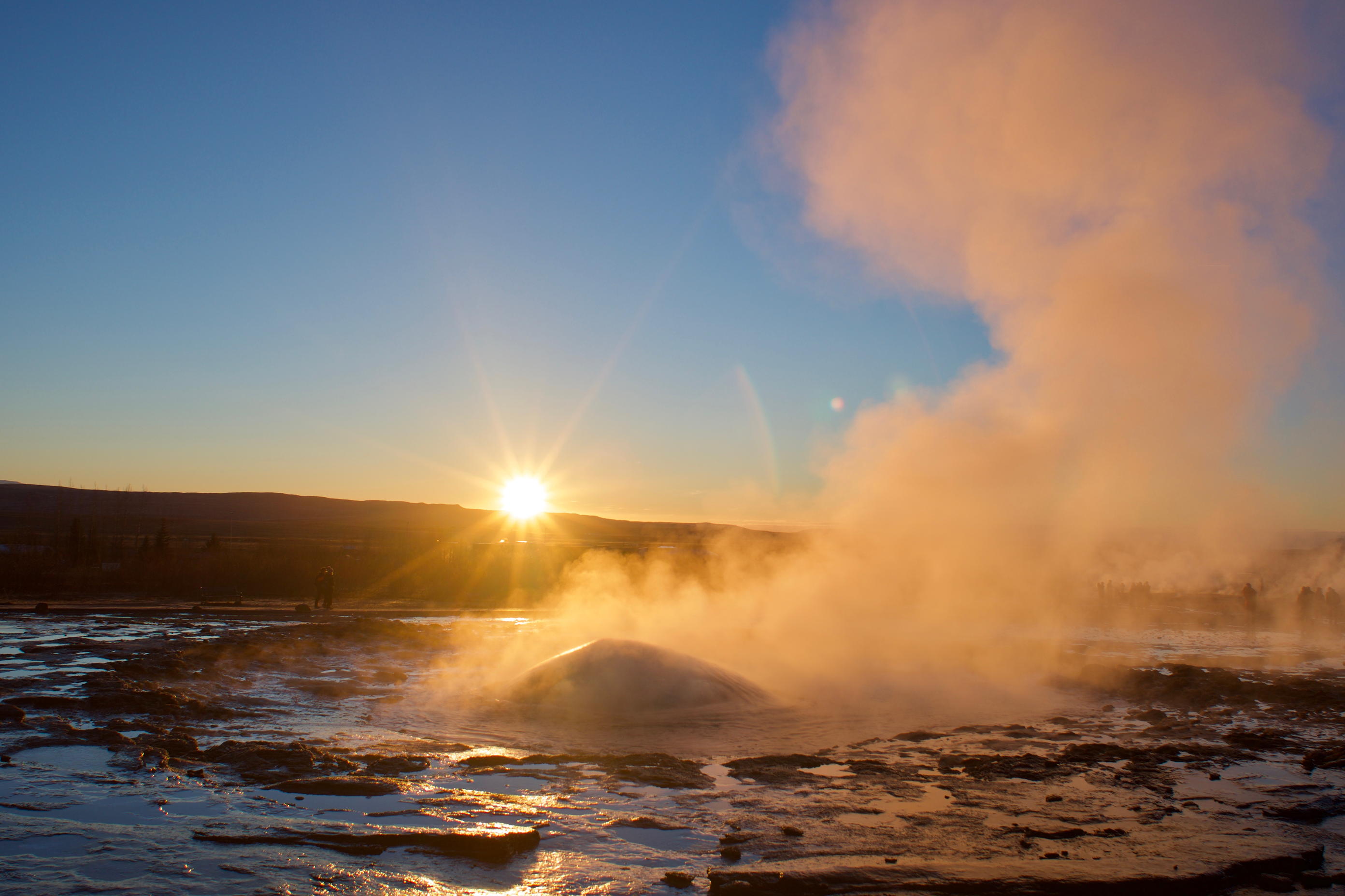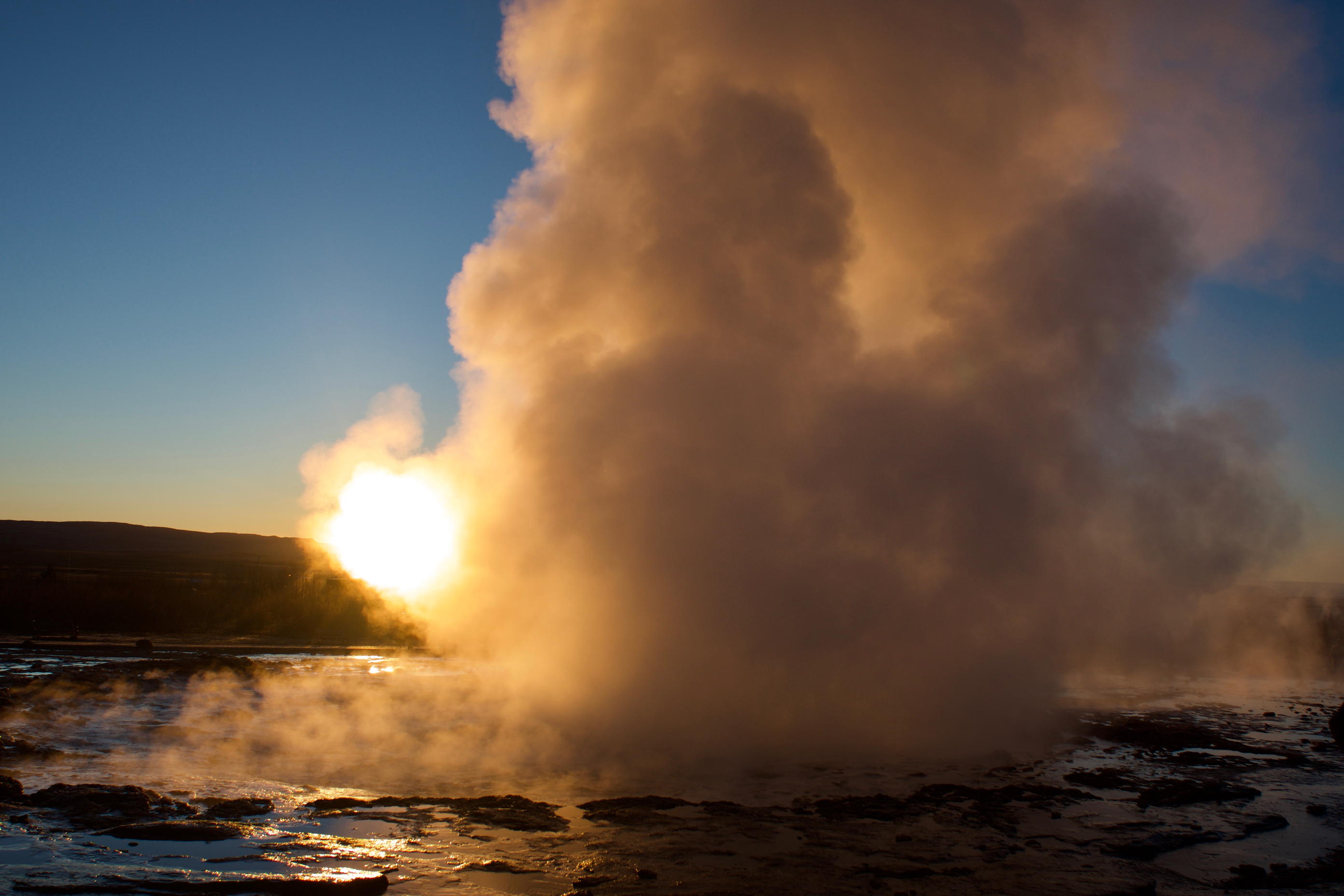 Im Geothermalgebiet Haukadalur liegt der "Geysir", der Namensgeber aller Geysire weltweit. Der "Geysir" ist allerdings nicht mehr aktiv, doch wenige Meter daneben gibt es den Strokkur, der alle 5-10 Minuten zuverlässig ausbricht und bei dem wir genau passend zum Sonnenaufgang angekommen sind.