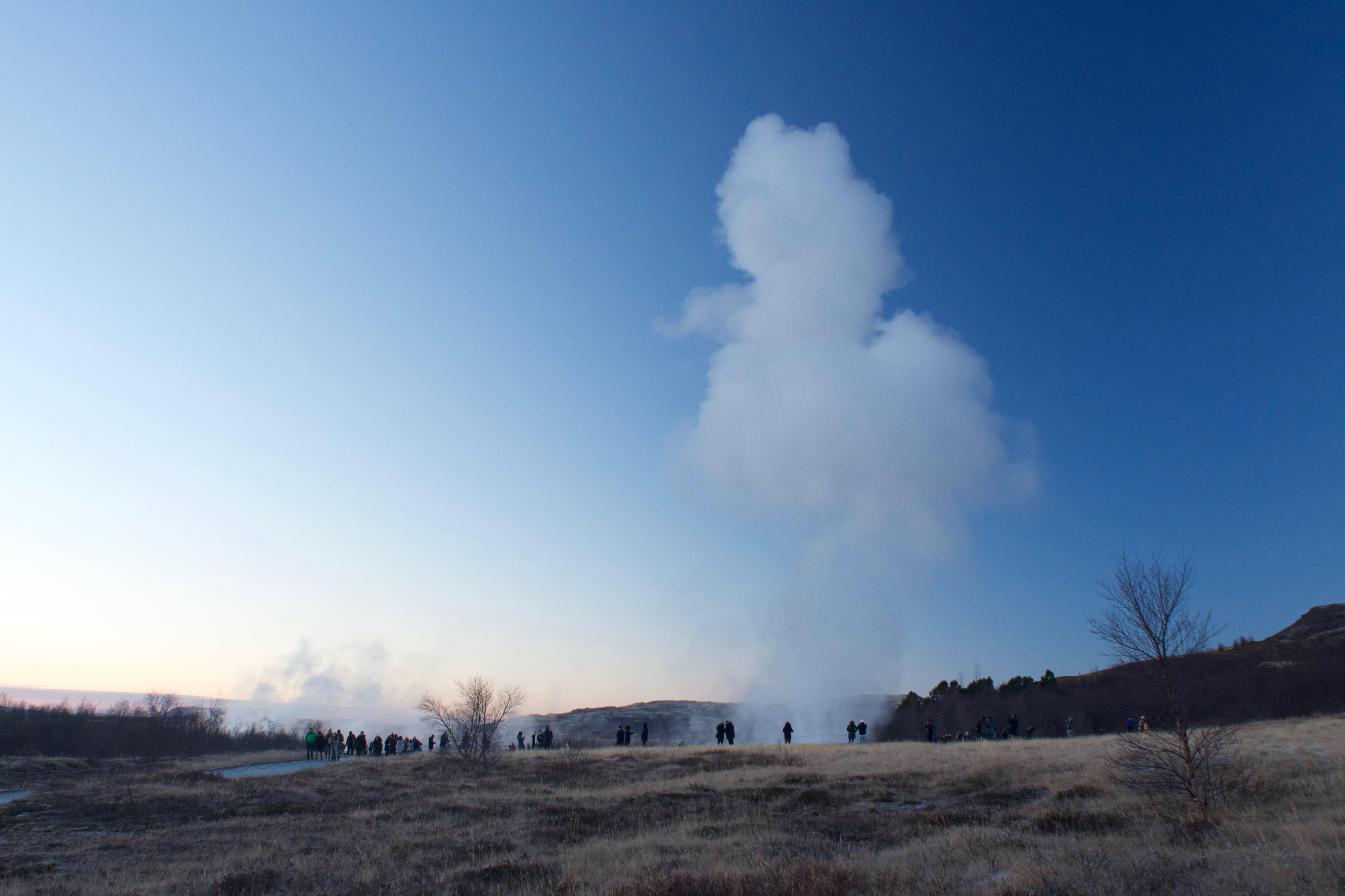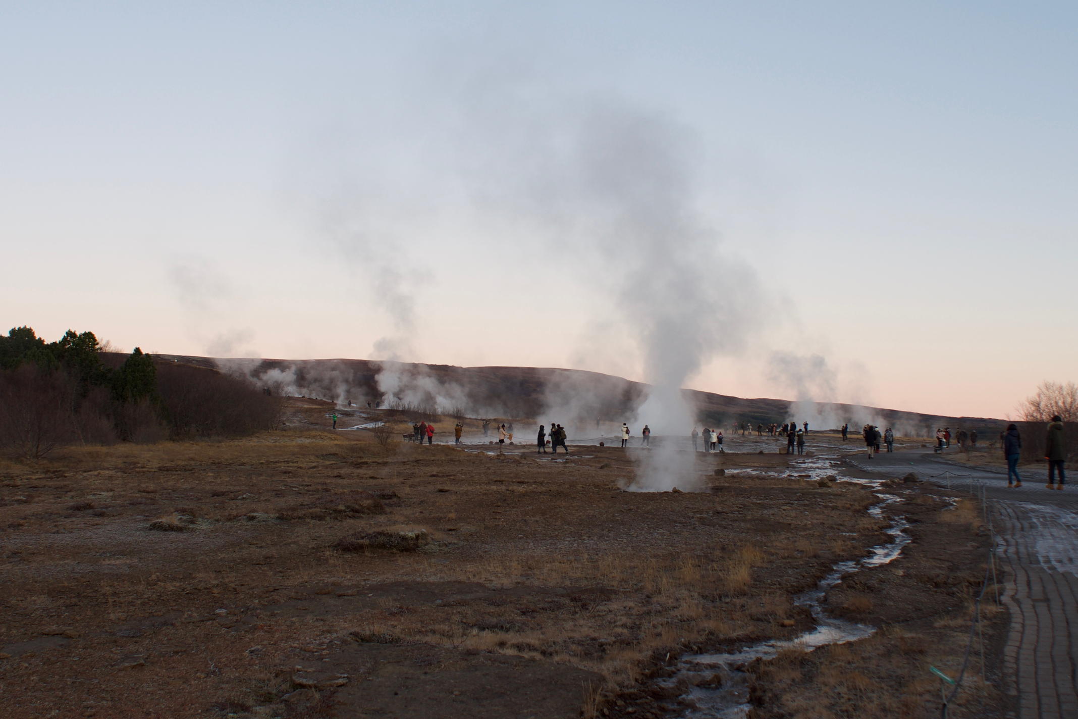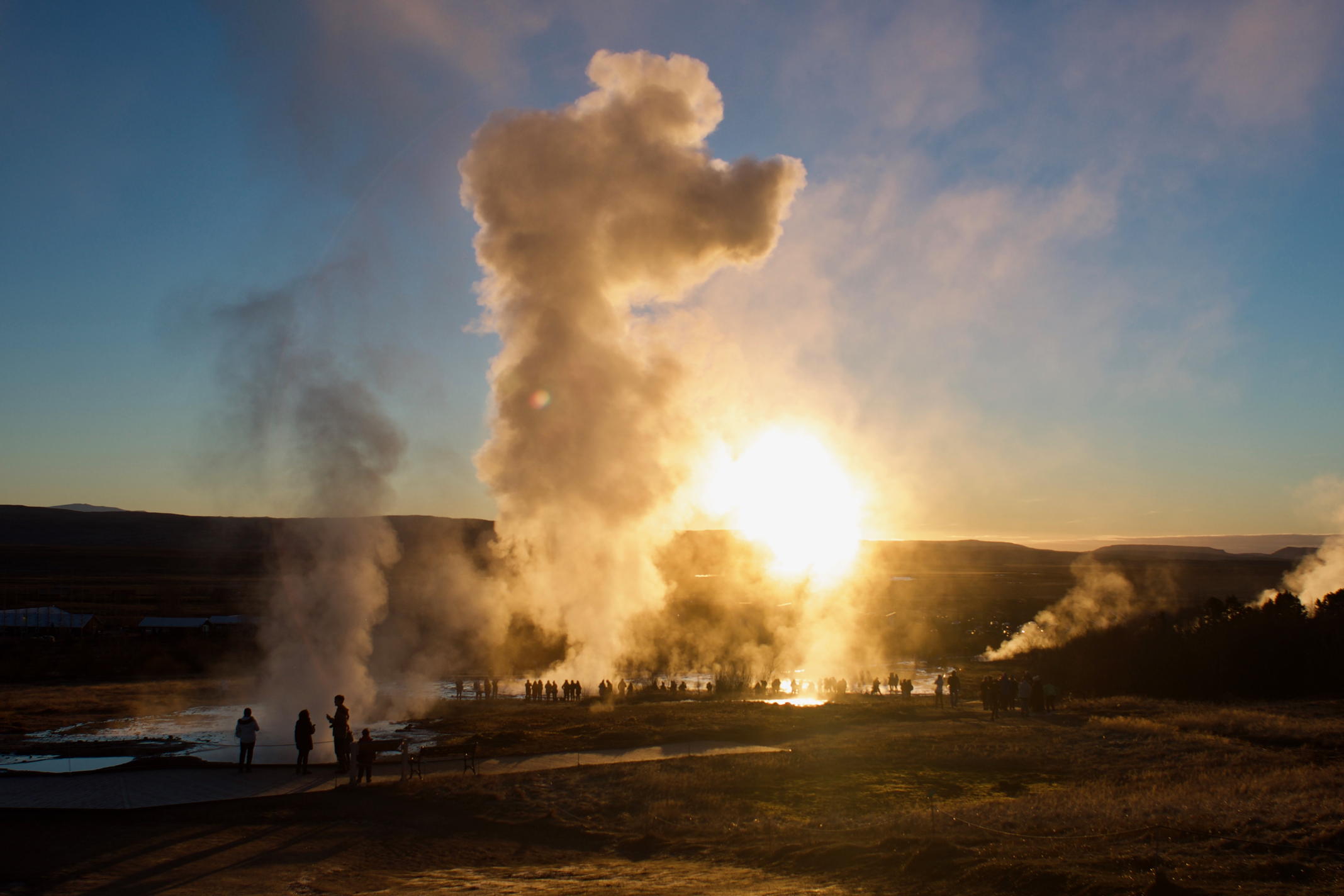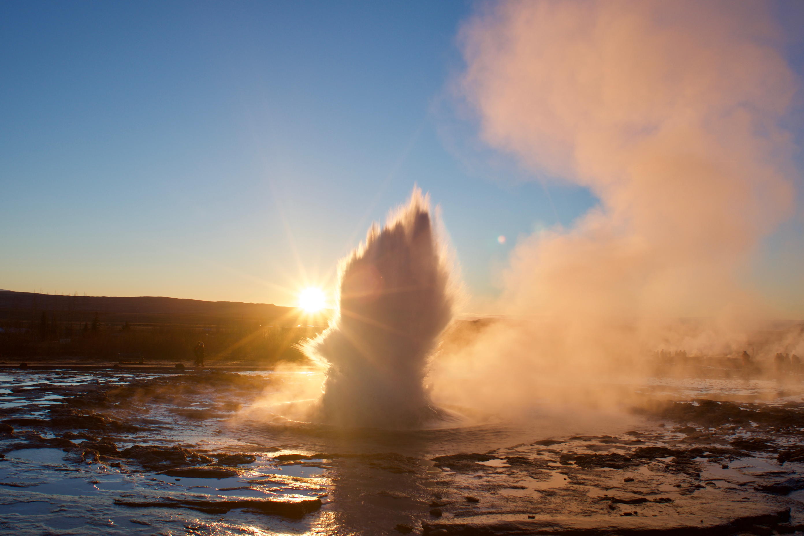 Im Geothermalgebiet Haukadalur liegt der "Geysir", der Namensgeber aller Geysire weltweit. Der "Geysir" ist allerdings nicht mehr aktiv, doch wenige Meter daneben gibt es den Strokkur, der alle 5-10 Minuten zuverlässig ausbricht und bei dem wir genau passend zum Sonnenaufgang angekommen sind.