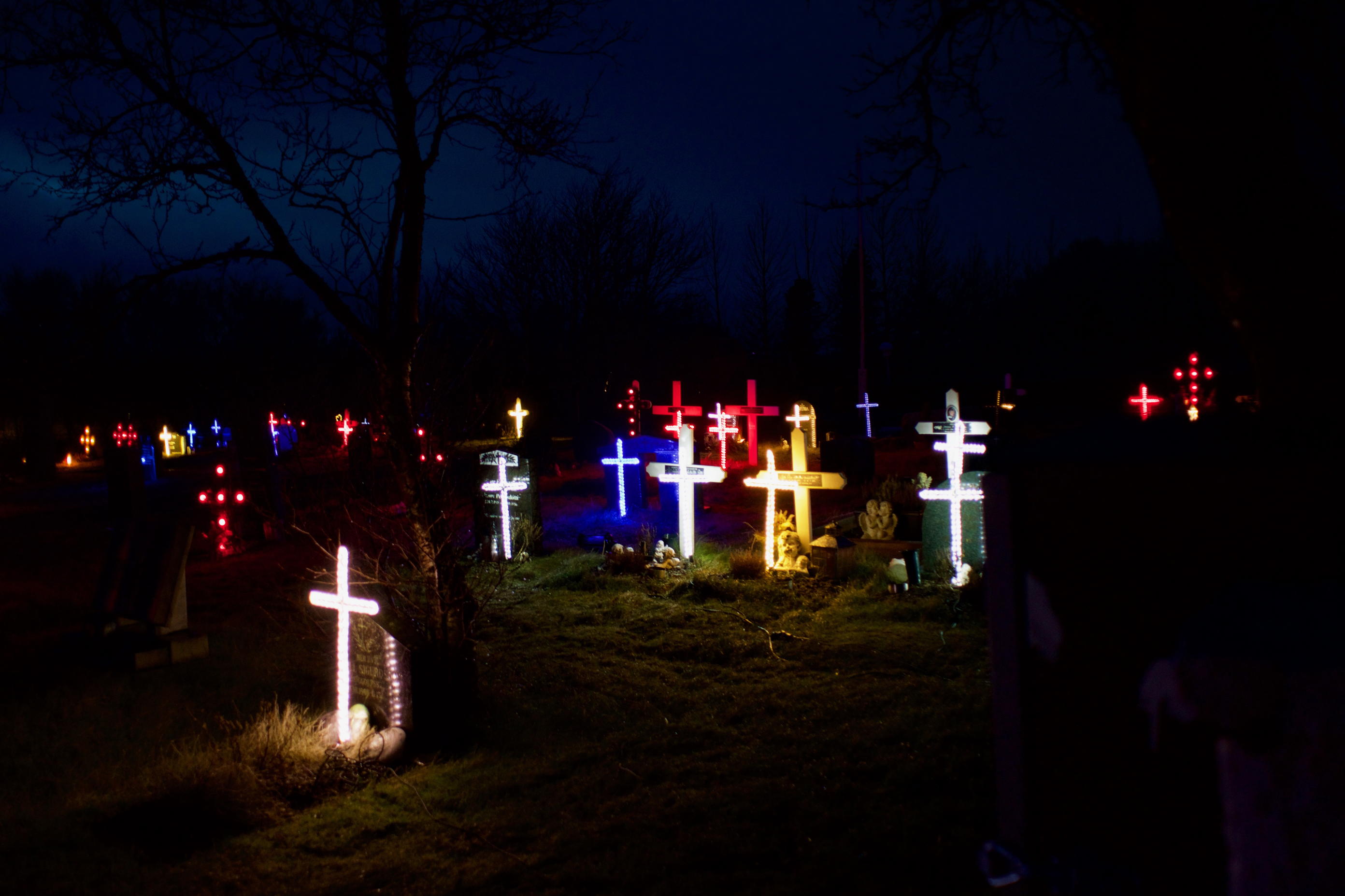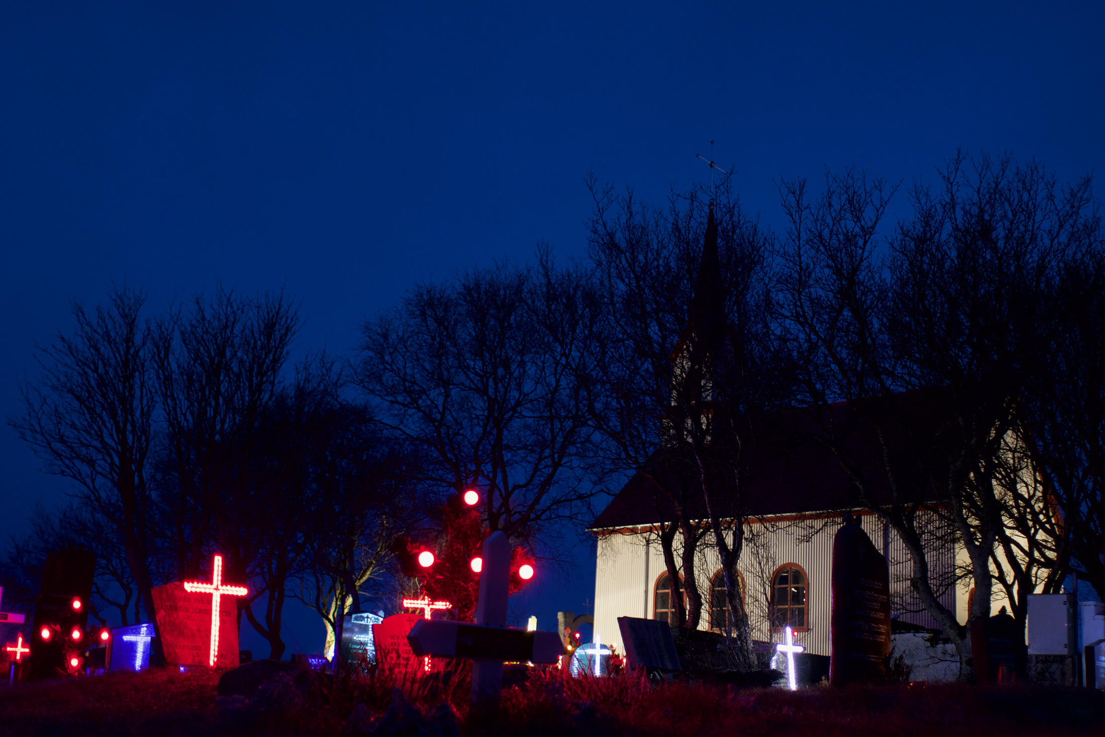 Abschließend haben wir kurz vor Reykjavík noch bei einem Friedhof angehalten. In der Weihnachtszeit sind auf Island nämlich nicht nur Häuser viel mehr weihnachtlich geschmückt als bei uns, sondern auch die Gräber auf Friedhöfen sind festlich beleuchtet.