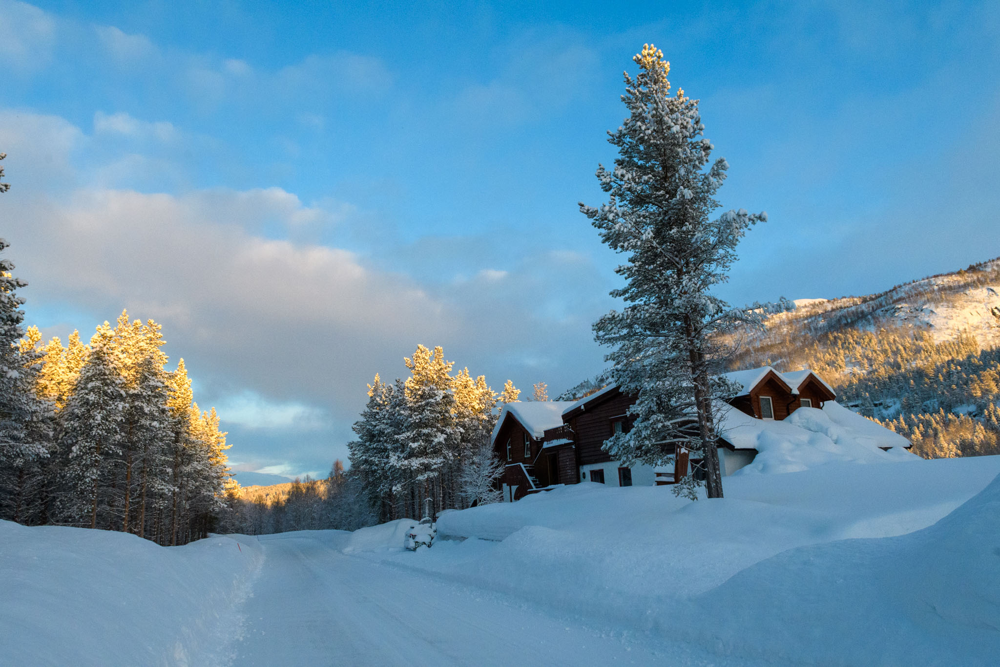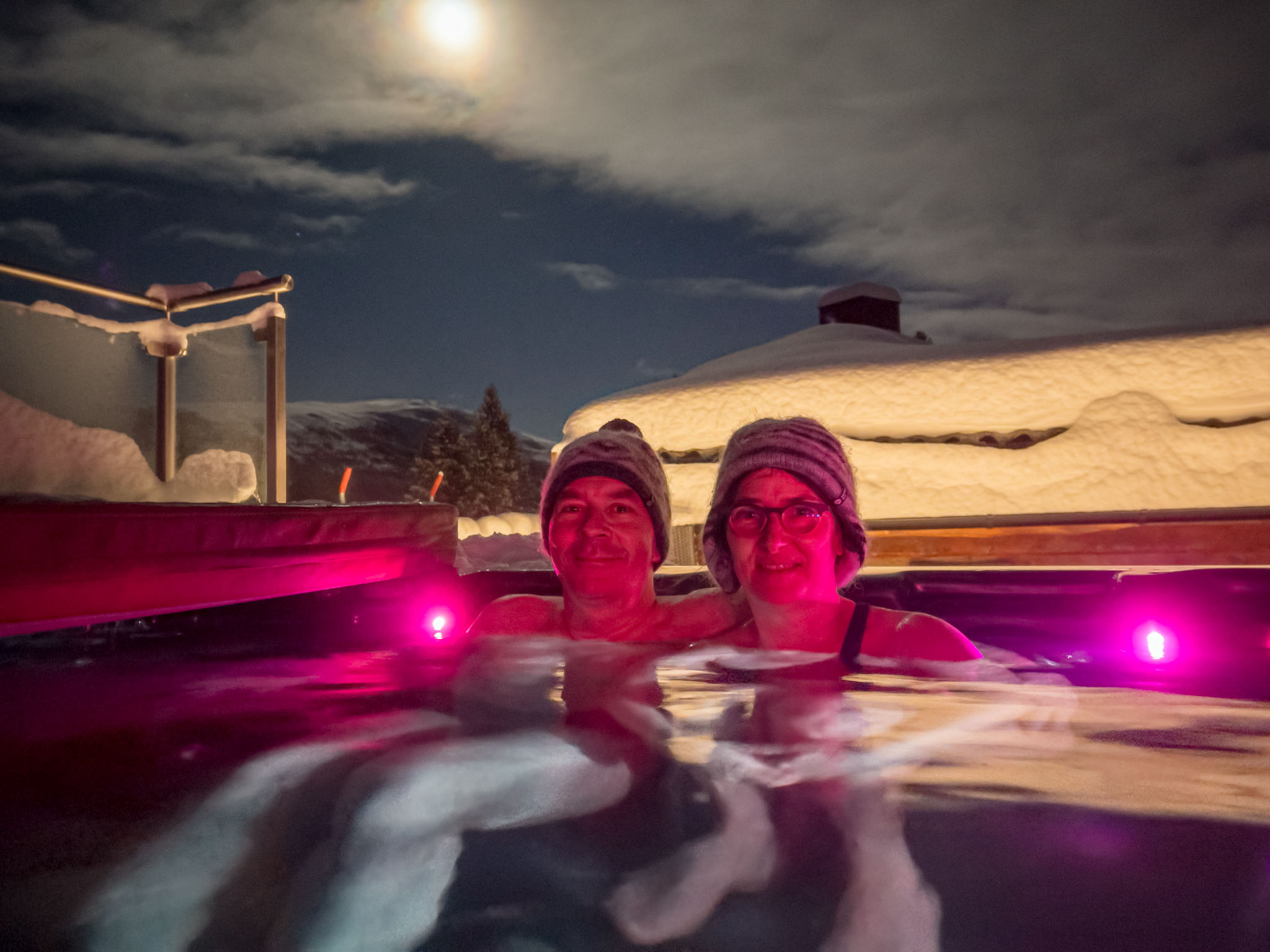 Kurz nach Sonnenuntergang waren wir wieder am Auto zurück. Nach dem Abendessen haben wir uns noch ins Jacuzzi unserer Lodge gelegt. Im 40 °C warmen Wasser konnte man den Vollmond bei -13 °C Außentemperatur recht angenehm genießen. Das Jacuzzi haben wir übrigens kostenlos bekommen – als Entschädigung, weil der Griff der Kühlschranktür kaputt ist und die Eingangstür gestern klemmte und erst repariert werden musste – regulär hätte es 1.000 Kronen (100 EUR) gekostet.
