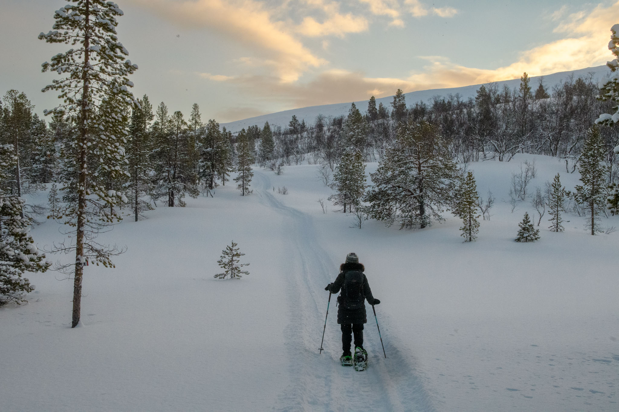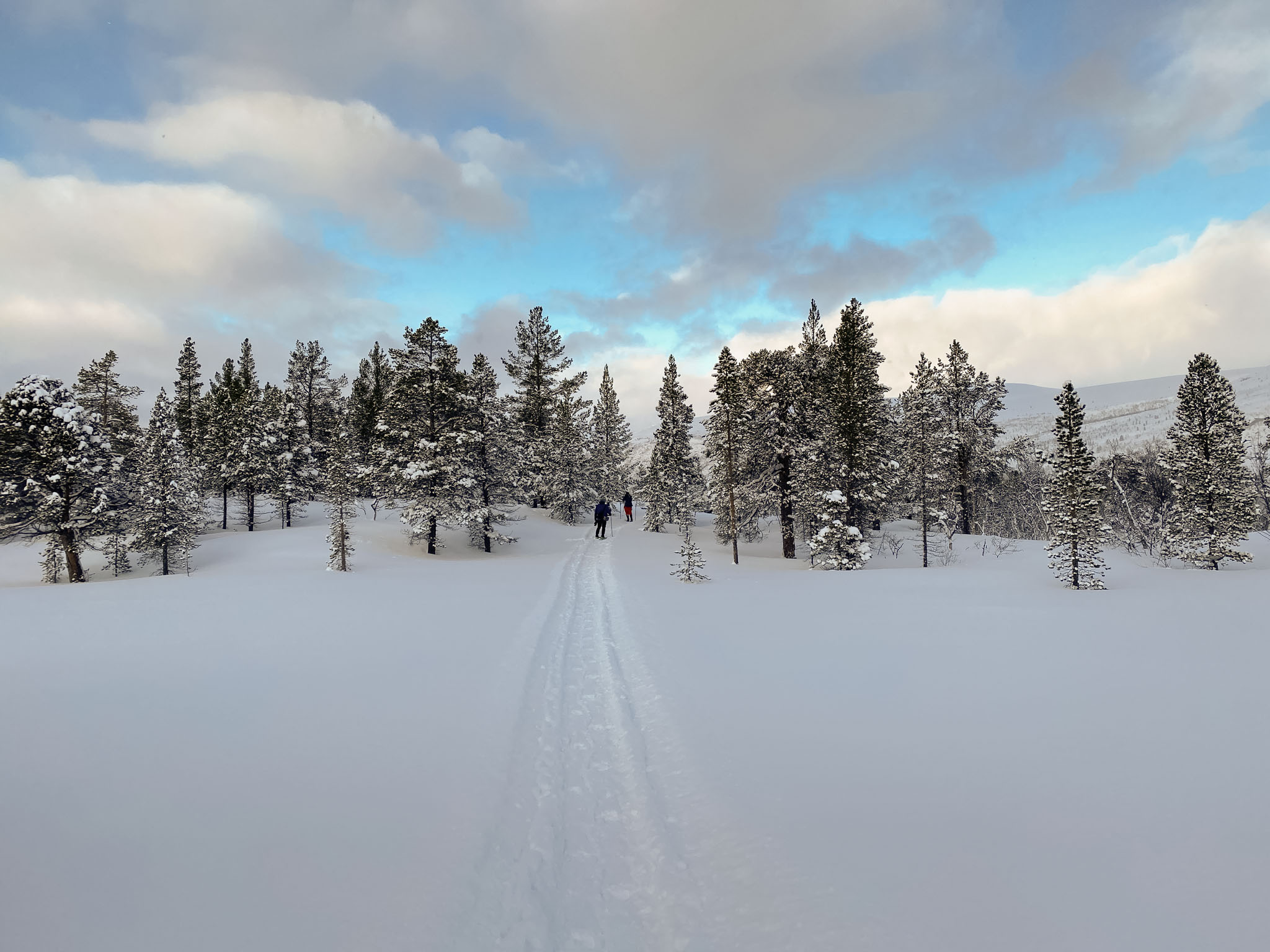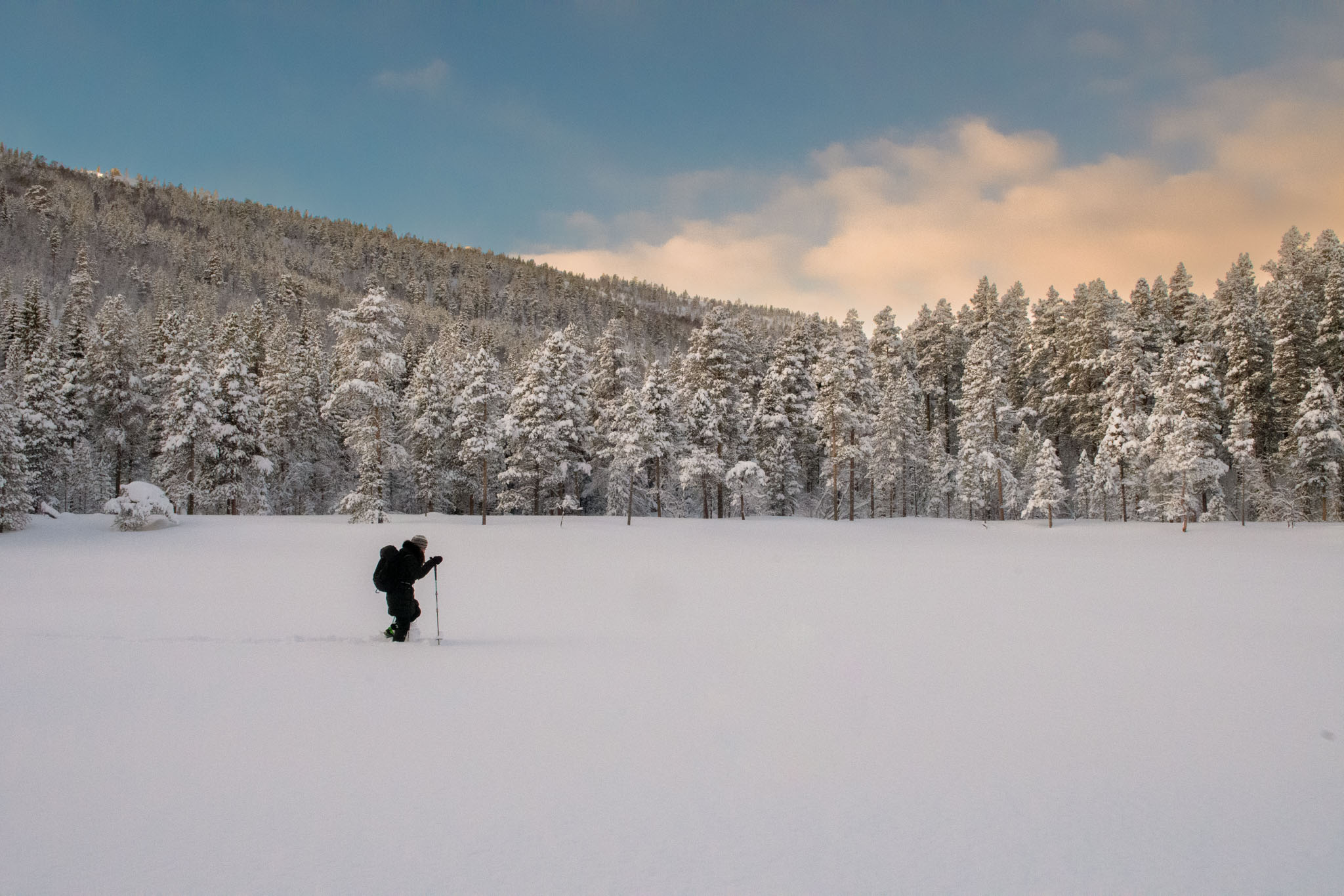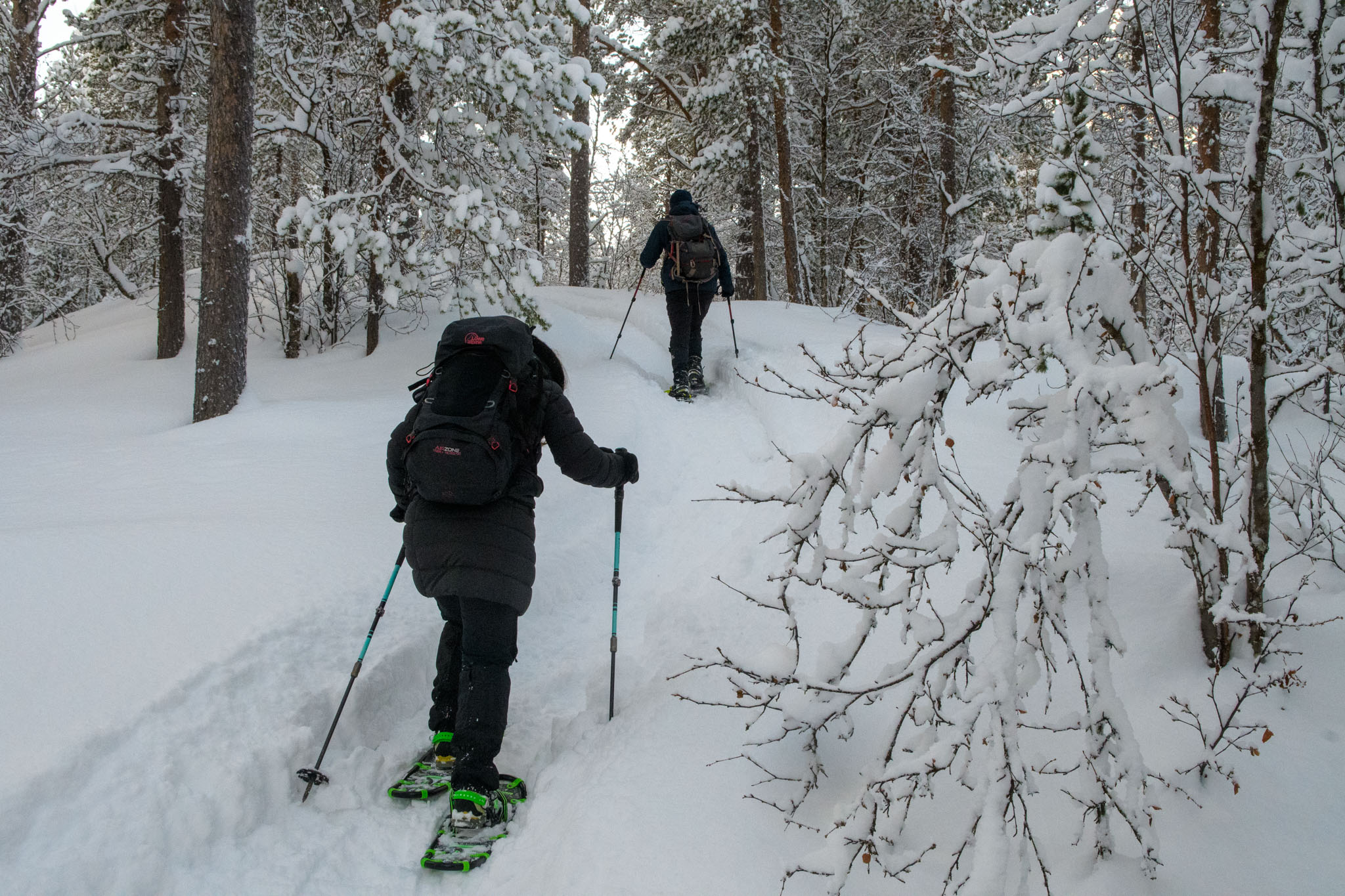 Nachdem wir vergangene Nacht noch erfolglos nach Polarlichtern Ausschau gehalten hatten, haben wir heute ausgeschlafen und sind nach einem gemütlichen Frühstück ganz in den Süden bis zum Talende gefahren, haben dort unser Auto abgestellt und sind zu einer Schneeschuhtour aufgebrochen, auf der wir nicht einen einzigen anderen Menschen gesehen haben. (Nicht einmal am "Parkplatz" stand ein weiteres Auto.) Netterweise hatte offensichtlich am Morgen ein Schneemobil einen Weg geschaffen, dem wir folgen konnten, denn ohne wäre es bei dem vielen Neuschnee selbst mit Schneeschuhen kaum möglich gewesen, durchzukommen – zumindest nicht so weit und lange.