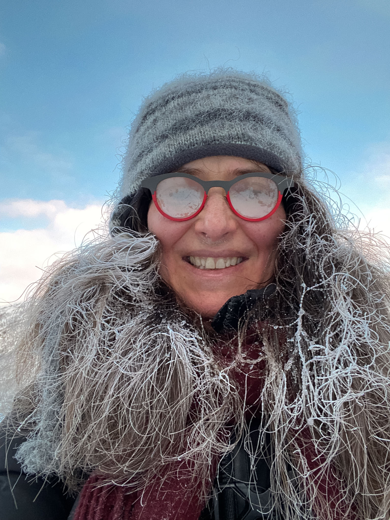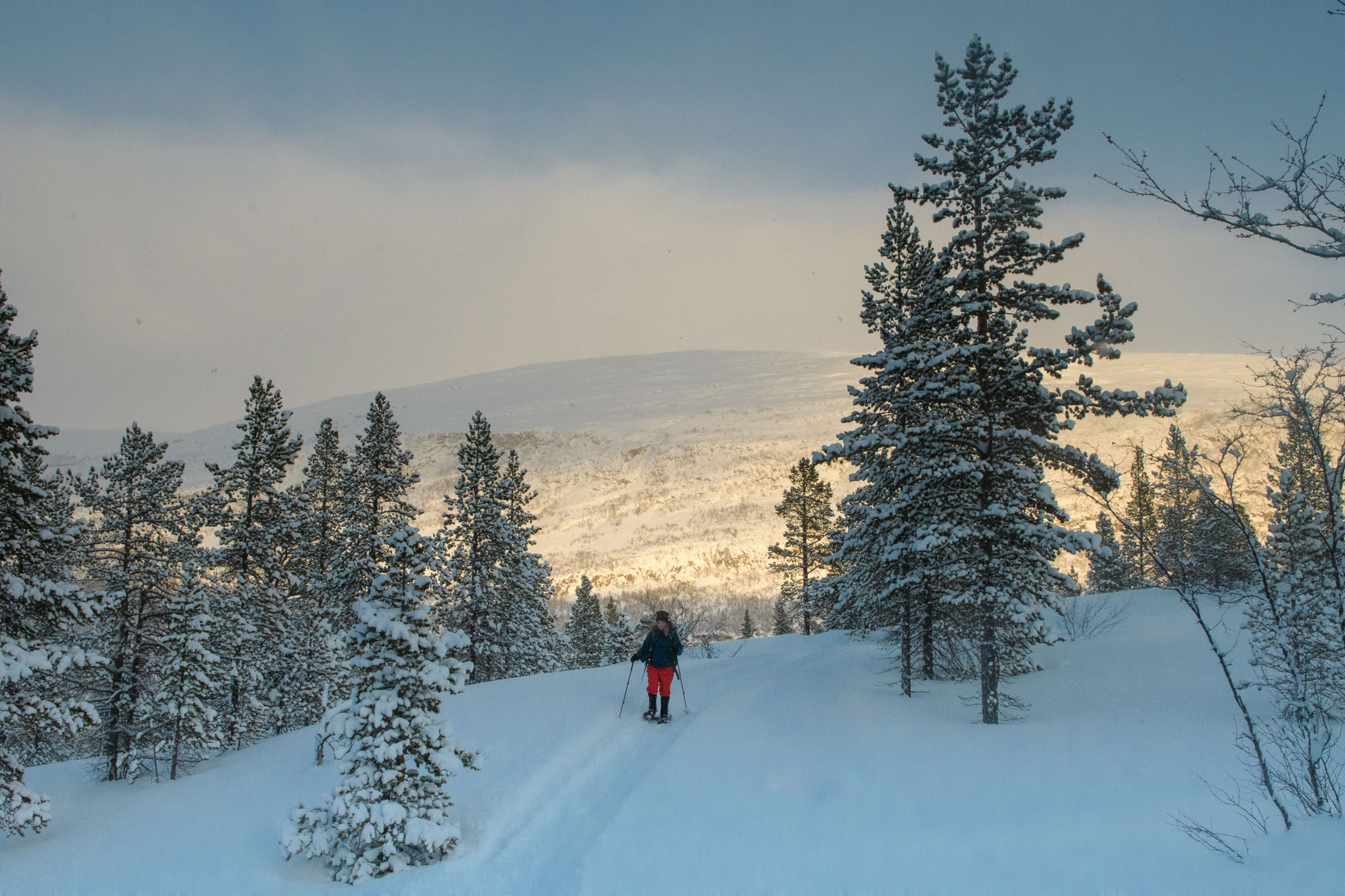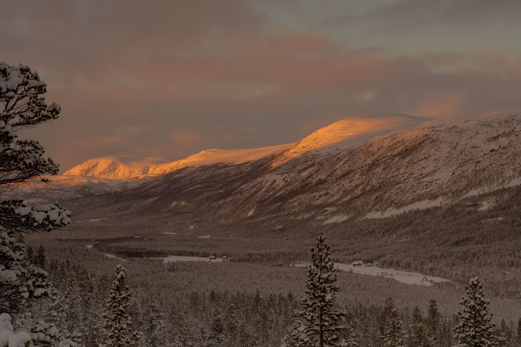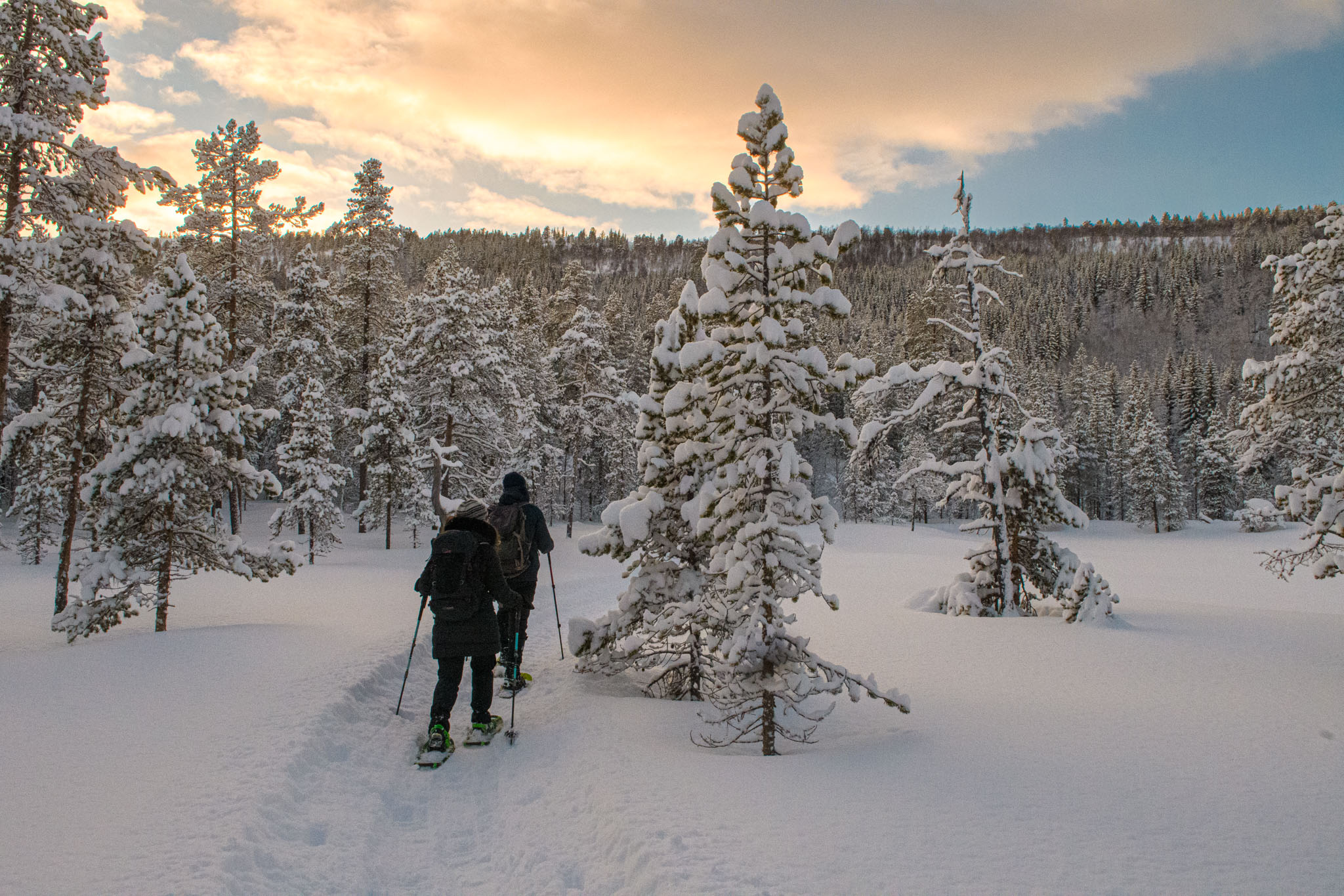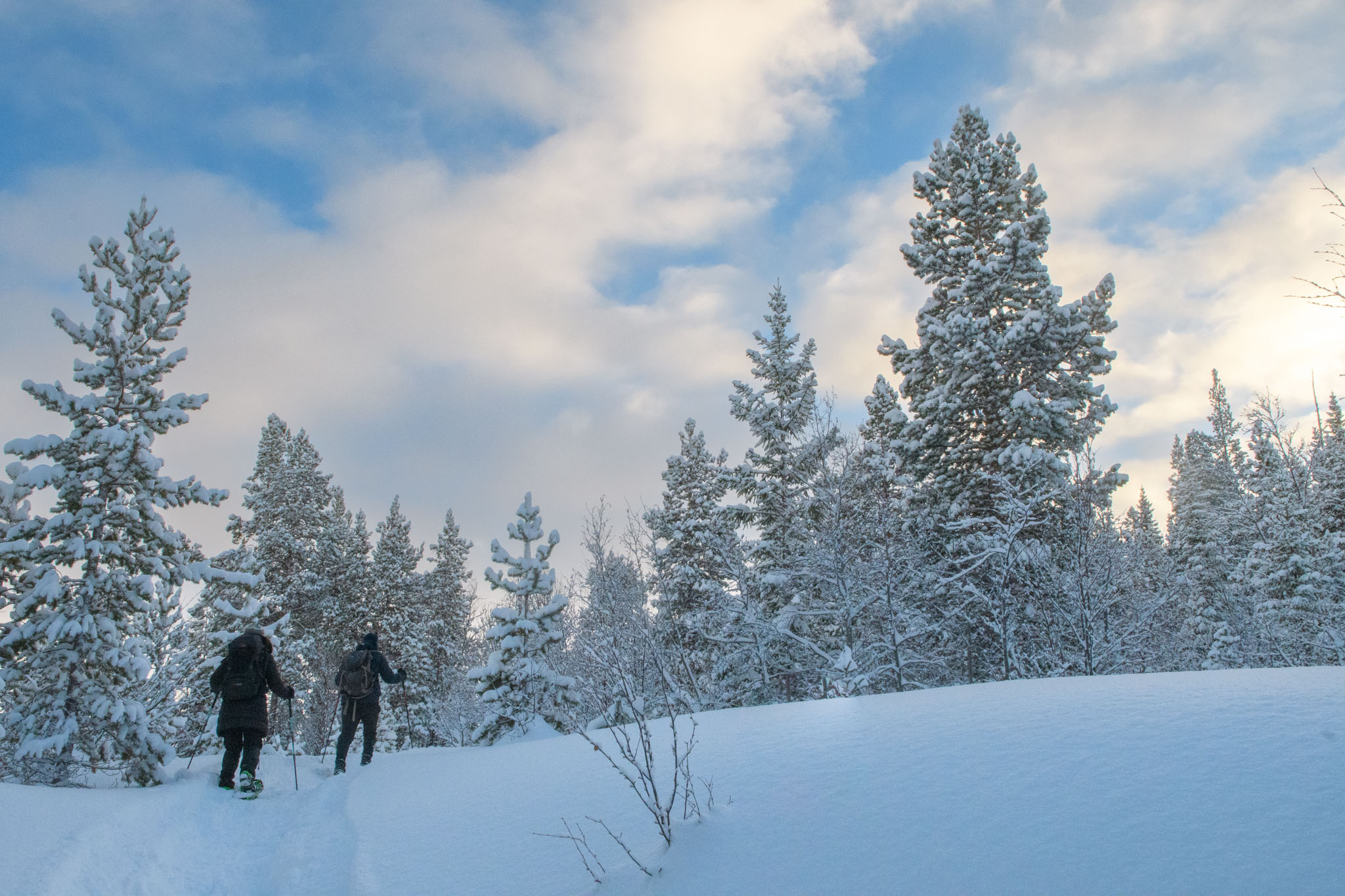 Nachdem wir vergangene Nacht noch erfolglos nach Polarlichtern Ausschau gehalten hatten, haben wir heute ausgeschlafen und sind nach einem gemütlichen Frühstück ganz in den Süden bis zum Talende gefahren, haben dort unser Auto abgestellt und sind zu einer Schneeschuhtour aufgebrochen, auf der wir nicht einen einzigen anderen Menschen gesehen haben. (Nicht einmal am "Parkplatz" stand ein weiteres Auto.) Netterweise hatte offensichtlich am Morgen ein Schneemobil einen Weg geschaffen, dem wir folgen konnten, denn ohne wäre es bei dem vielen Neuschnee selbst mit Schneeschuhen kaum möglich gewesen, durchzukommen – zumindest nicht so weit und lange.