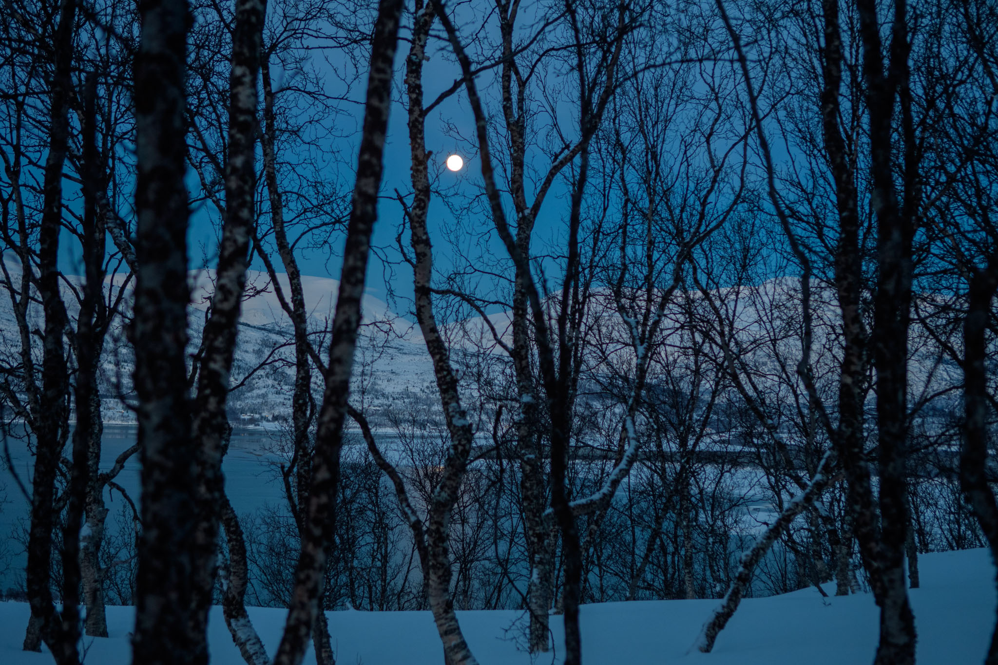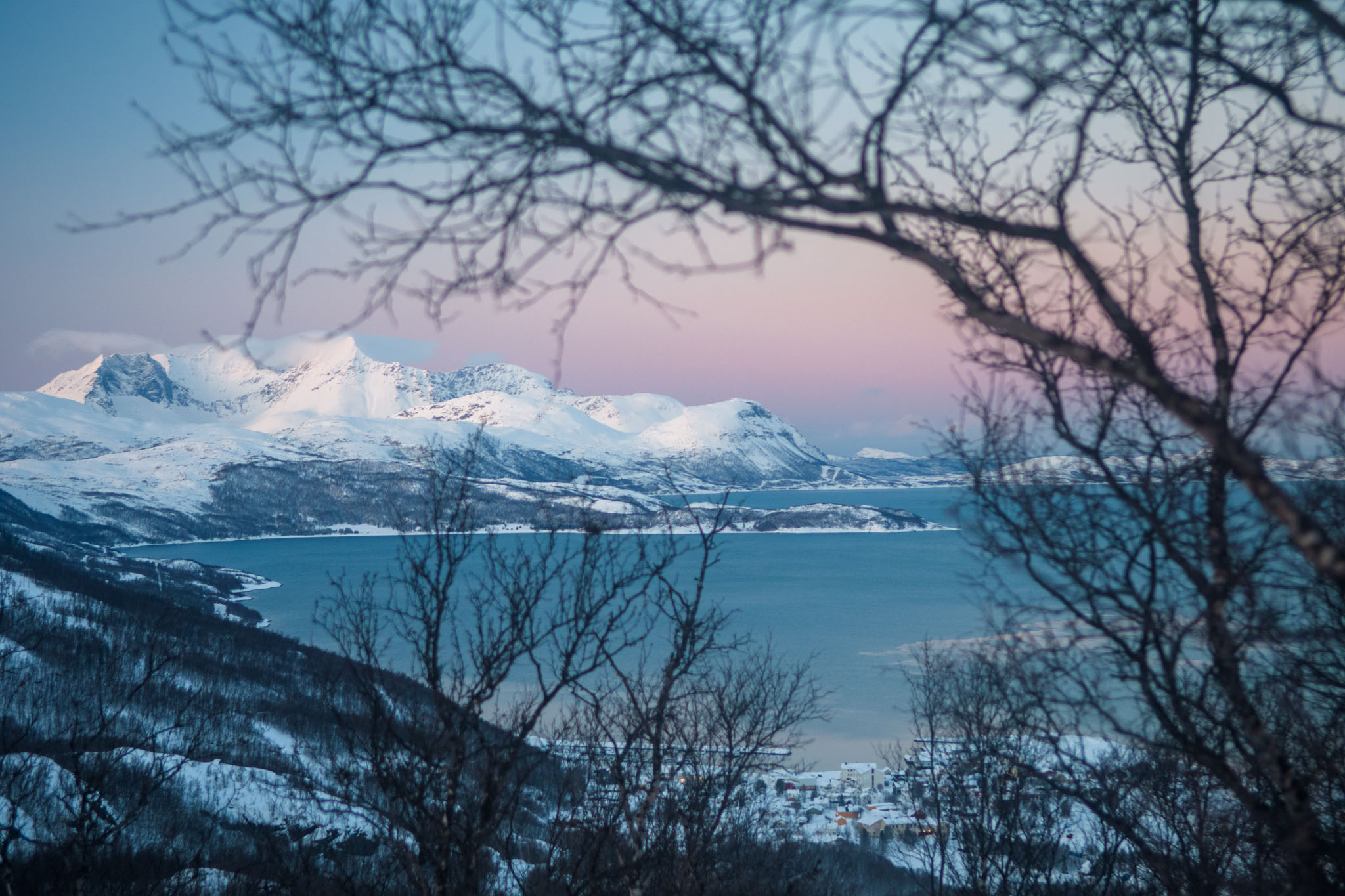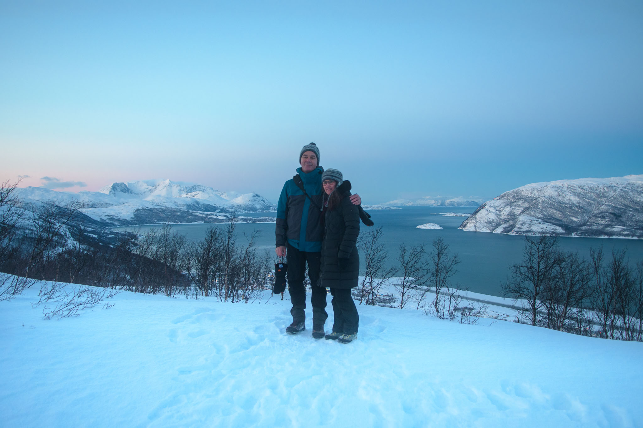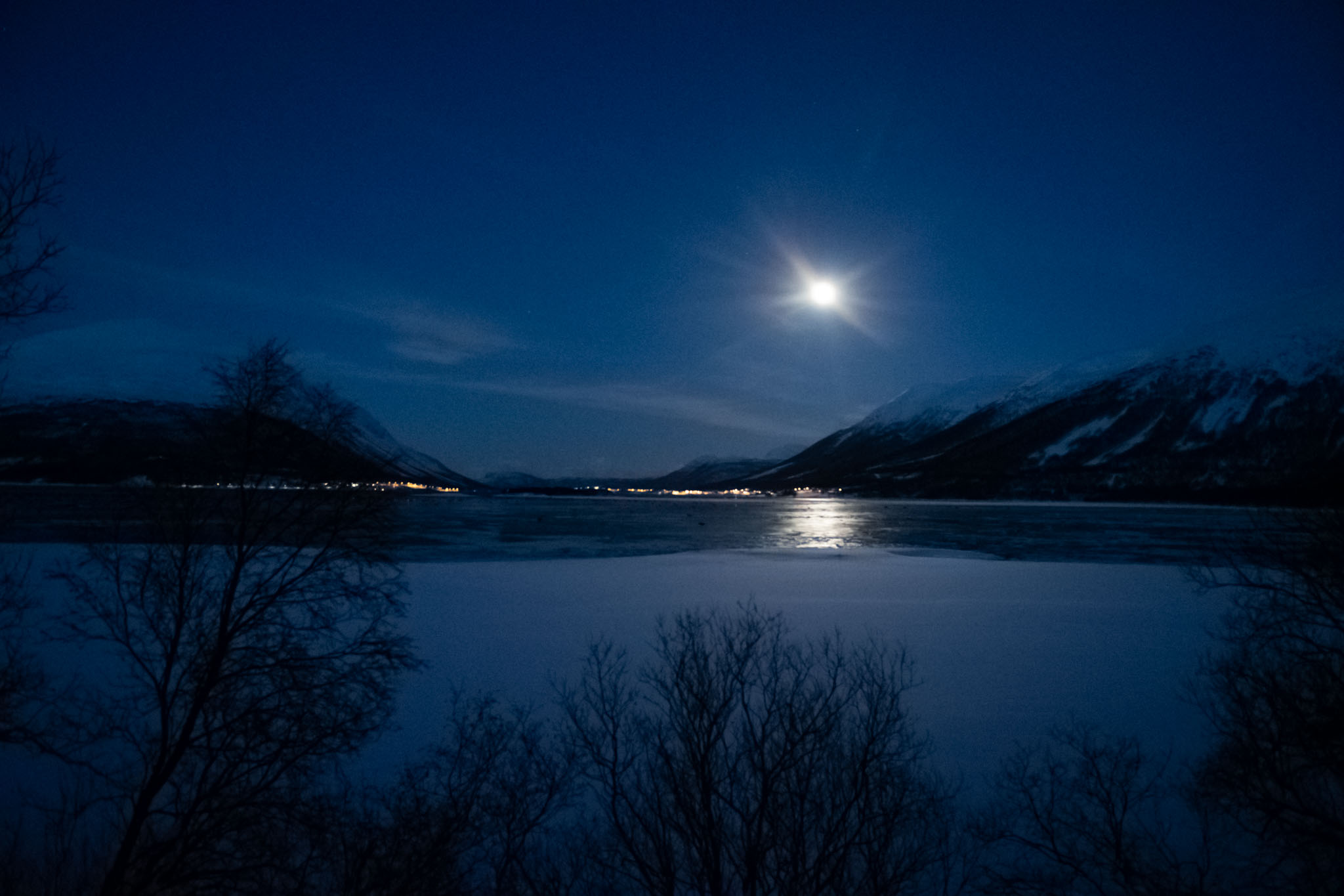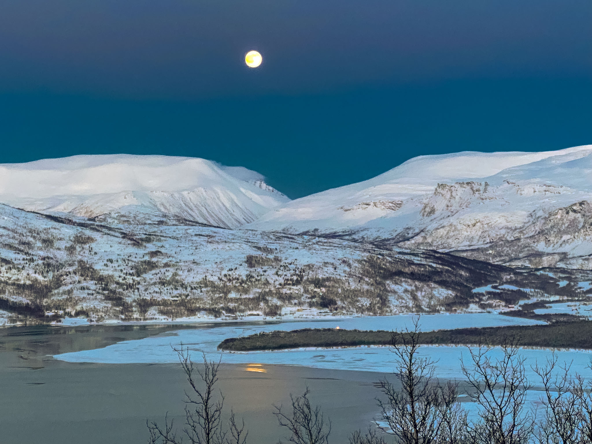 Anschließend sind wir ein kurzes Stück raus aus Storslett gefahren und haben dort eine Wanderung hoch zu einer wirklich schönen Aussicht über die Fjordlandschaft gemacht. Der Weg war gut begehbar, so dass wir die Schneeschuhe im Kofferraum gelassen haben und wir nur mit Bergschuhen losgezogen sind. Zurück waren wir erst, als längst die Sonne untergegangen war, doch die Dämmerung dauert hier oben sehr viel länger als bei uns daheim und bei wolkenlosem Himmel und Vollmond in einer weißen Schneelandschaft war das nicht das geringste Problem. Die Stirnlampe, die wir dabei hatten, durfte im Rucksack bleiben.