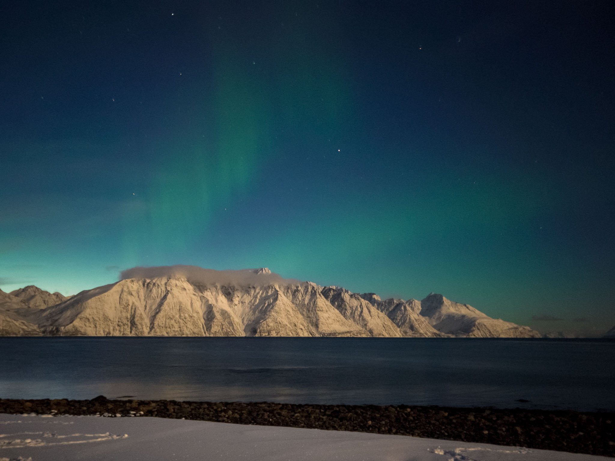 Nach unserer Winterwandung sind wir noch ein Stück weiter an der Küste entlang gefahren, wo es schöne Fotoaussichten geben sollte. Inzwischen war es aber stockfinster, so dass das mit dem Fotografieren nichts mehr war – bis auf das letzte Foto im letzten Blogeintrag. Wir wollten also den Tag schon fast beenden und (mit einem Stopp am Supermarkt) zurück zu unserer Lodge fahren, als wir plötzlich Polarlichter sahen – und anders als in der Nacht davor waren sie diesmal richtig gut.