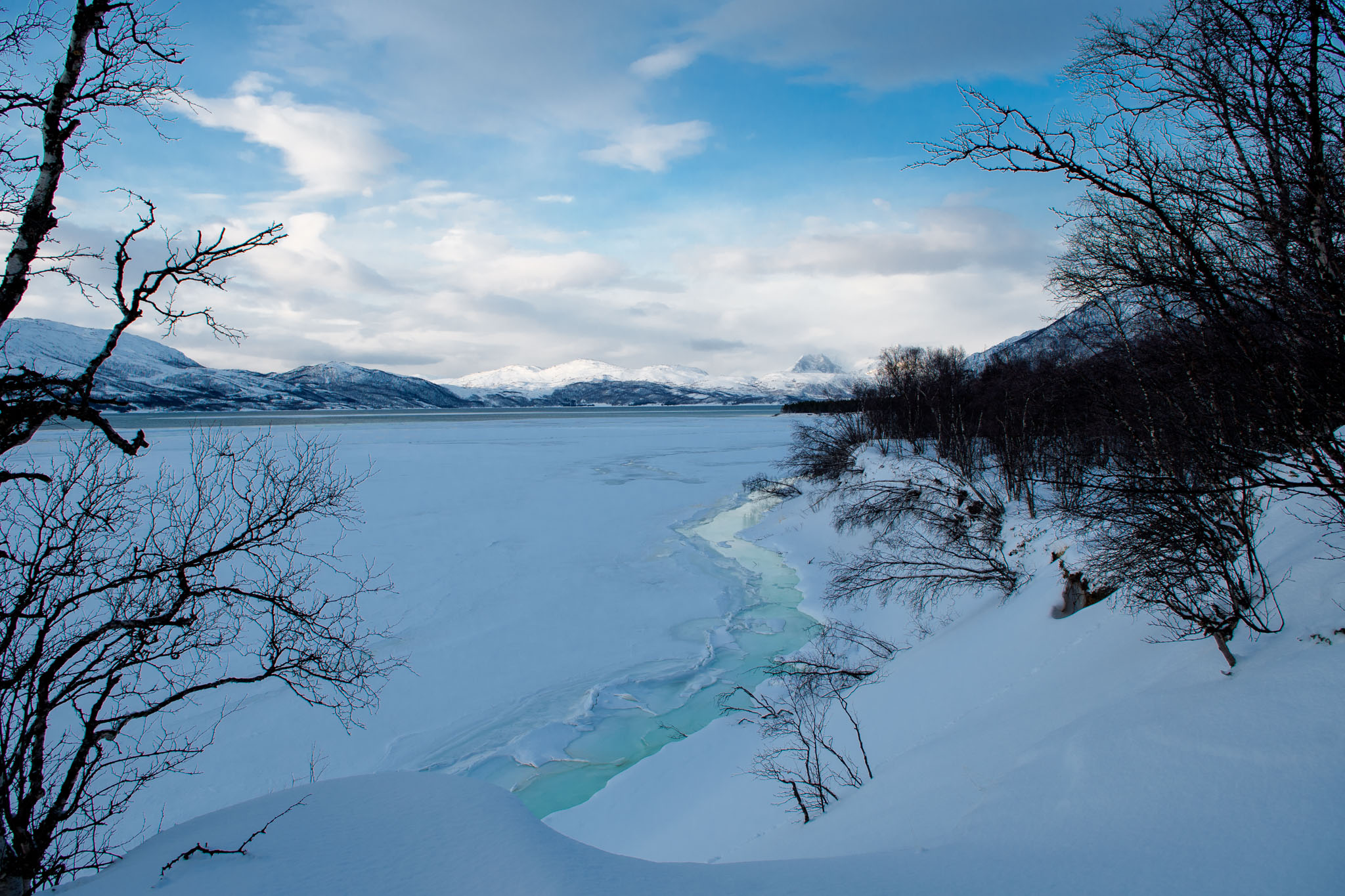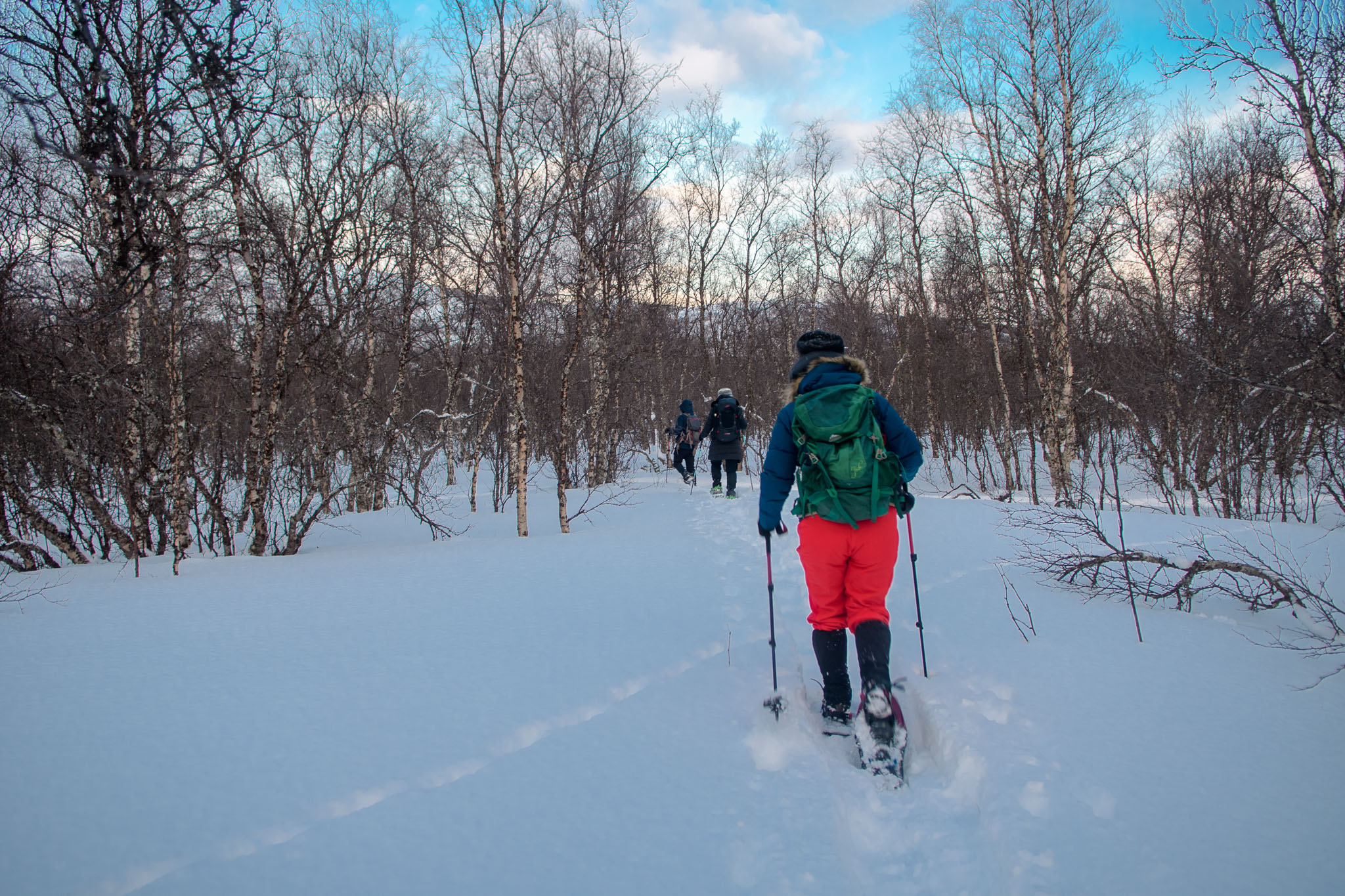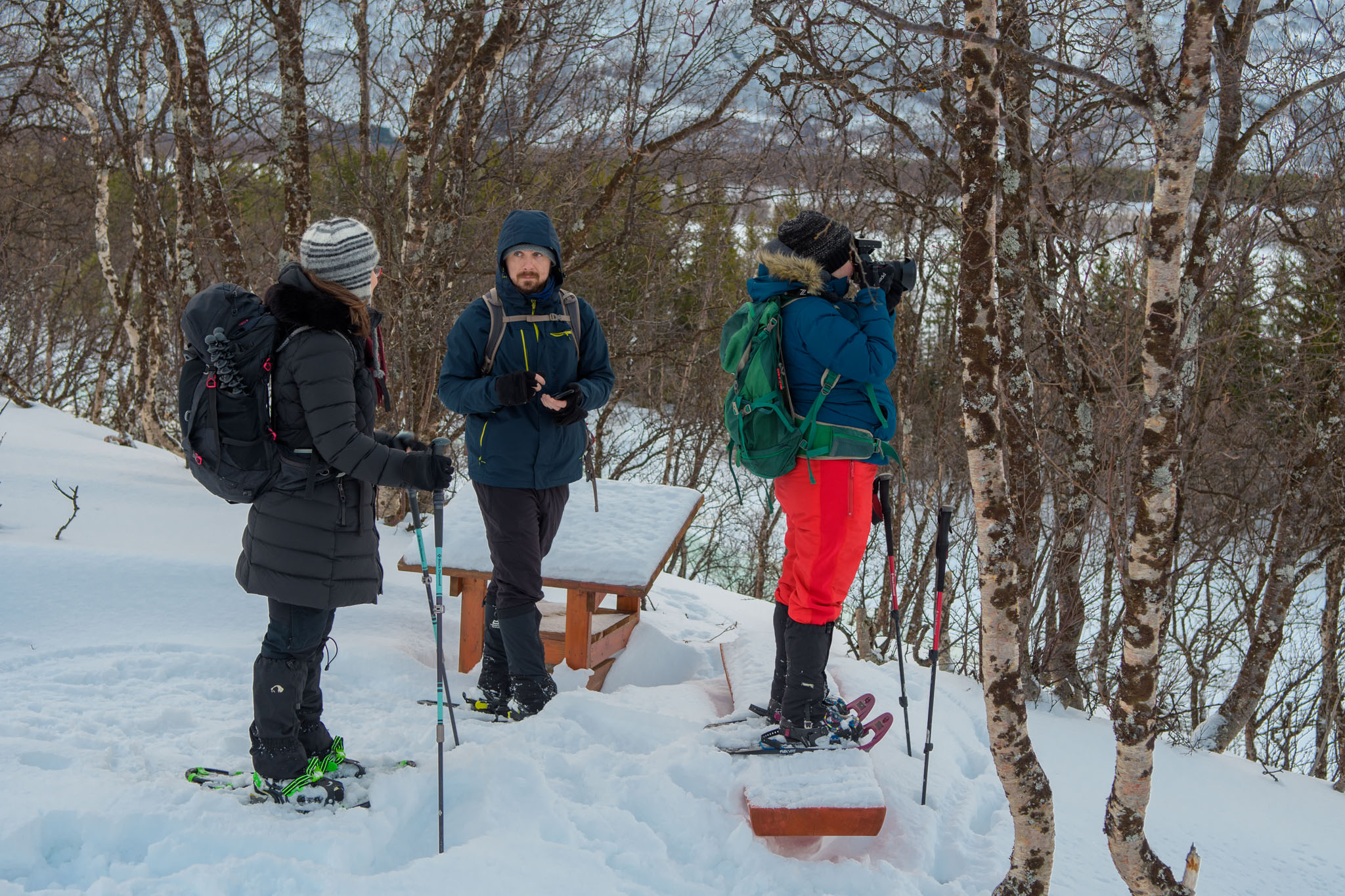 Nach einem erneut gemütlichen Vormittag in der Lodge sind wir mittags wieder nach Storslett aufgebrochen und haben dort eine Schneeschuhtour gemacht, die uns gestern empfohlen wurde. Es war heute deutlich bewölkter als gestern, doch schön war es trotzdem.