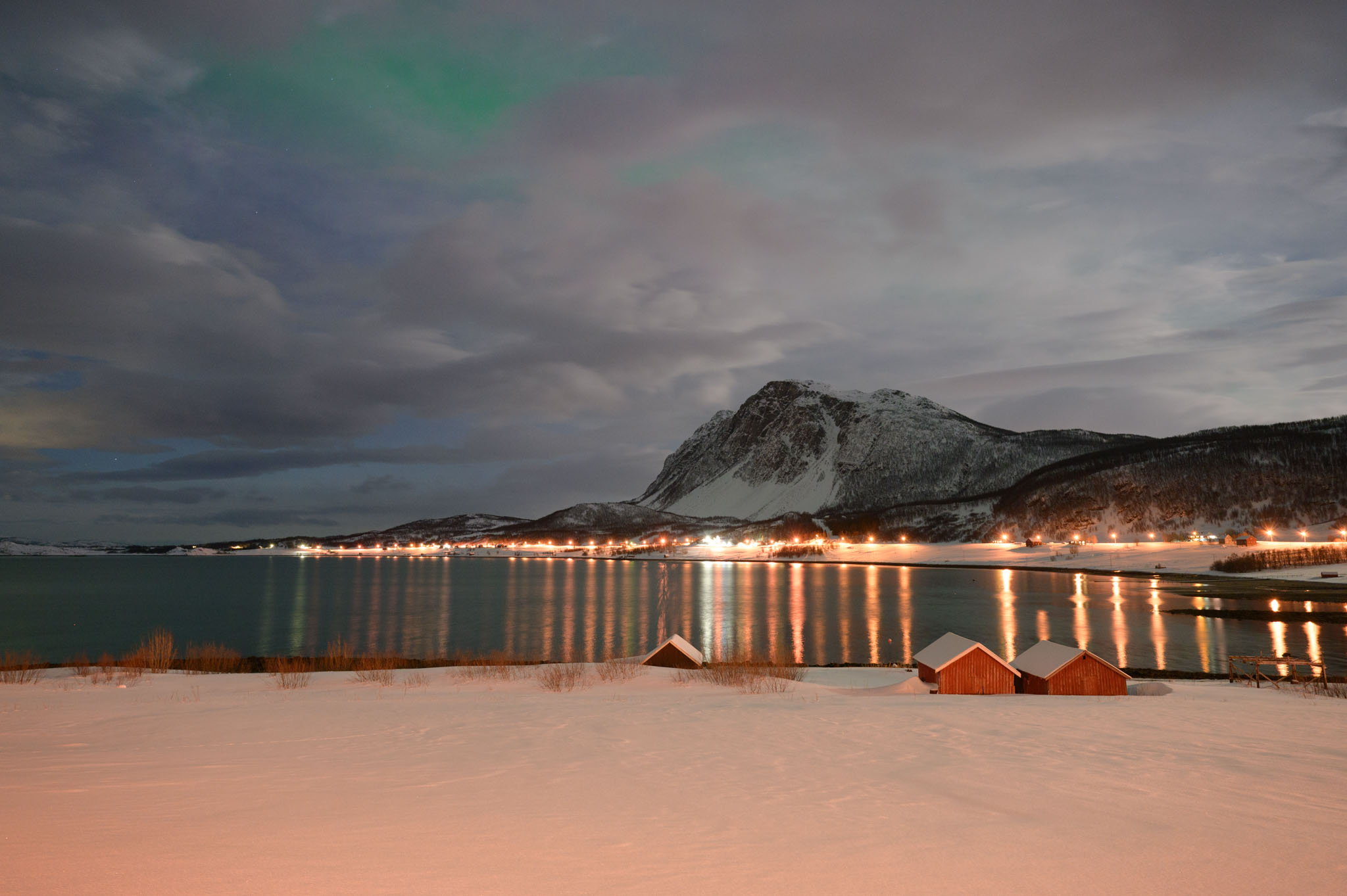 An einem schönen Sandstrand in der Nähe haben wir eine gute Fotolokation mit passender Landschaft Richtung Norden gefunden. Leider waren die Polarlichtaktivitäten heute nicht sehr stark und zusätzlich war es auch noch ziemlich bewölkt, so dass wir einfach ein paar Landschafts-Nachtfotos gemacht haben – um plötzlich festzustellen, dass da doch etwas Grün am Himmel ist (s. letztes Foto unten).