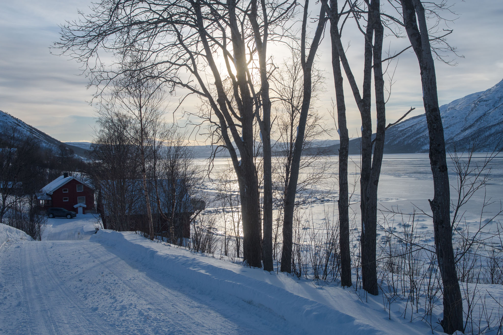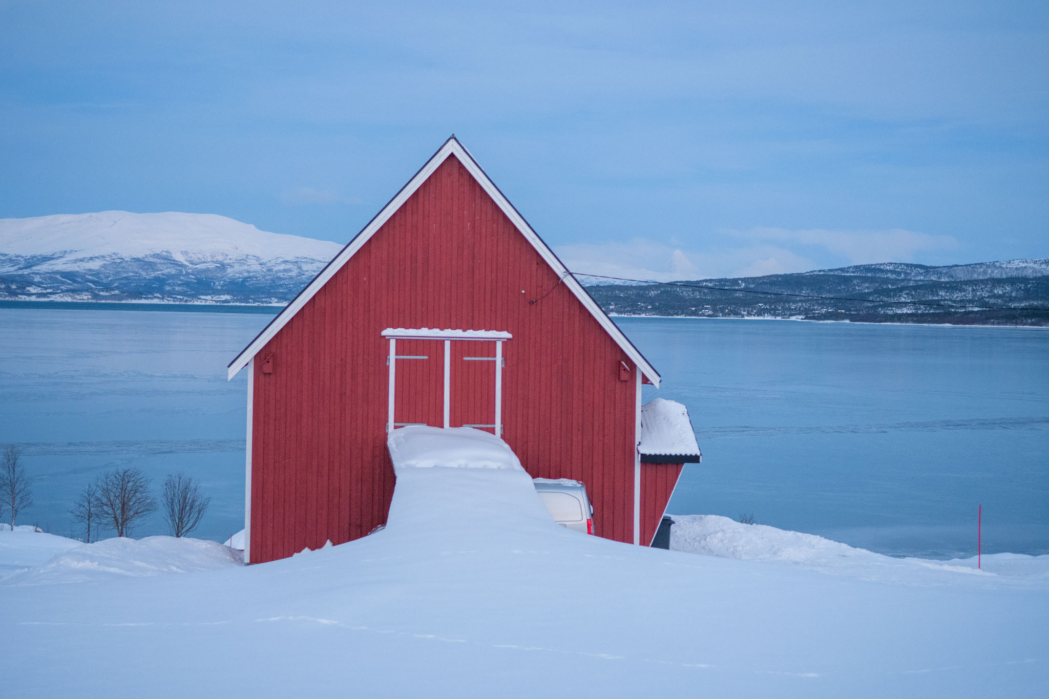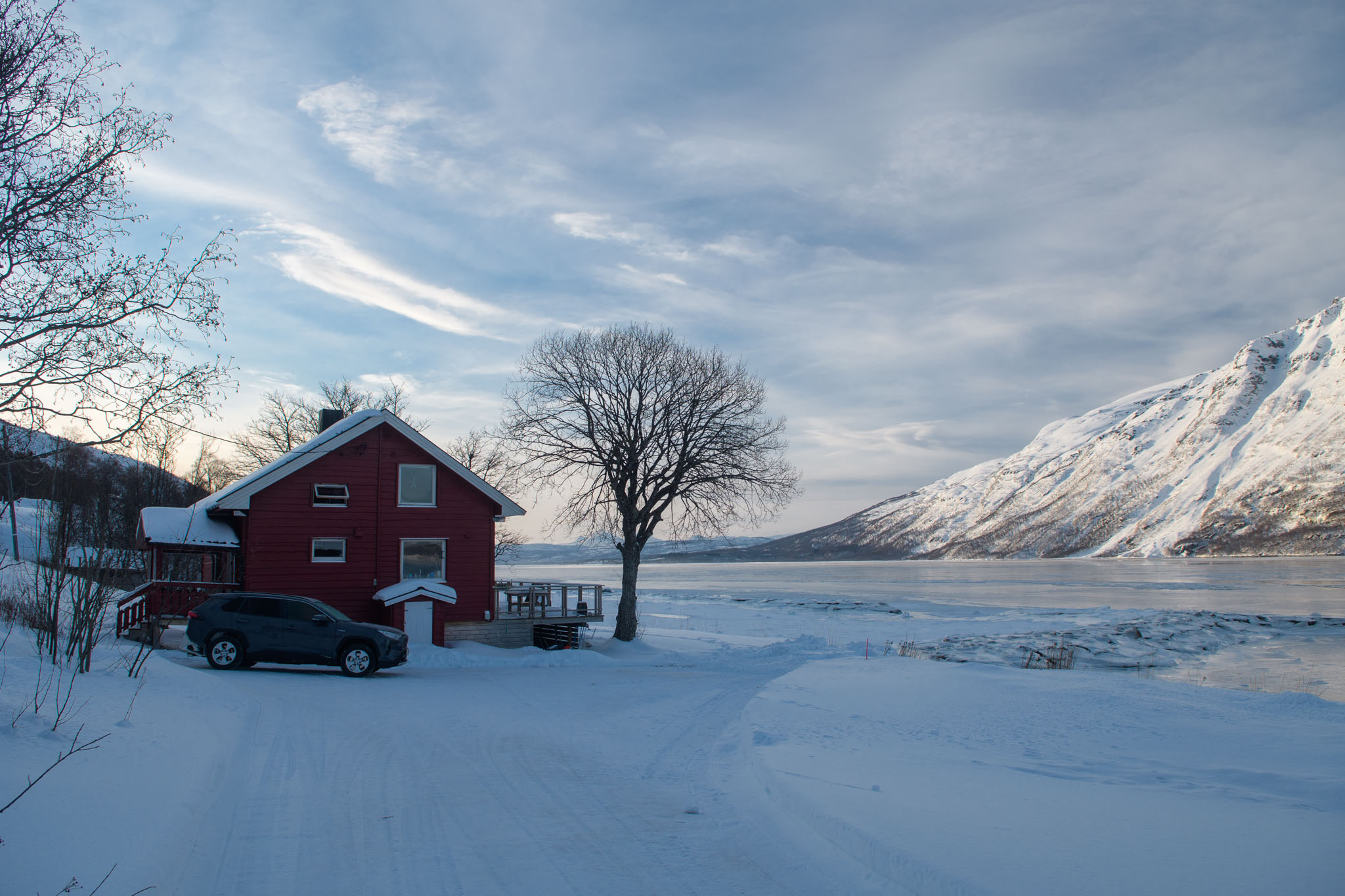 The Red Fjordhouse ist der Name unseres Ferienhauses (s. Fotos #1 und #4 unten). Es ist das ehemalige Schulhaus von Målsnes und bereits Anfang des 20. Jahrhunderts erbaut worden. Das merkt man auch daran, dass die beiden Schlafzimmer im oberen Stockwerk nur etwa 1,9 m hoch sind. Das Haus ist aber perfekt in Schuss und zusätzlich ist es eine der am besten ausgestatteten Ferienwohnungen, die wir je hatten. Dass kostenlose Schneeschuhe dabei sind, wussten wir bereits vorher. Dass die Küche nahezu perfekt ausgestattet ist, haben wir gestern Abend sehr schnell gemerkt. Über den Drucker in der Wohnung haben wir uns zunächst gewundert. Abends haben wir dann noch bemerkt, dass uns ein großes MacBook Pro zur Verfügung steht. Wir alle dachten, dass dies Julias sei, bis sie es genommen hat, um es zu nutzen und dabei merkte, dass es gar nicht ihr eigenes ist.