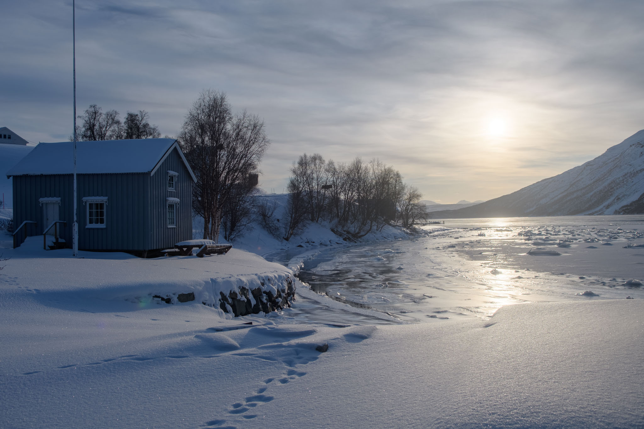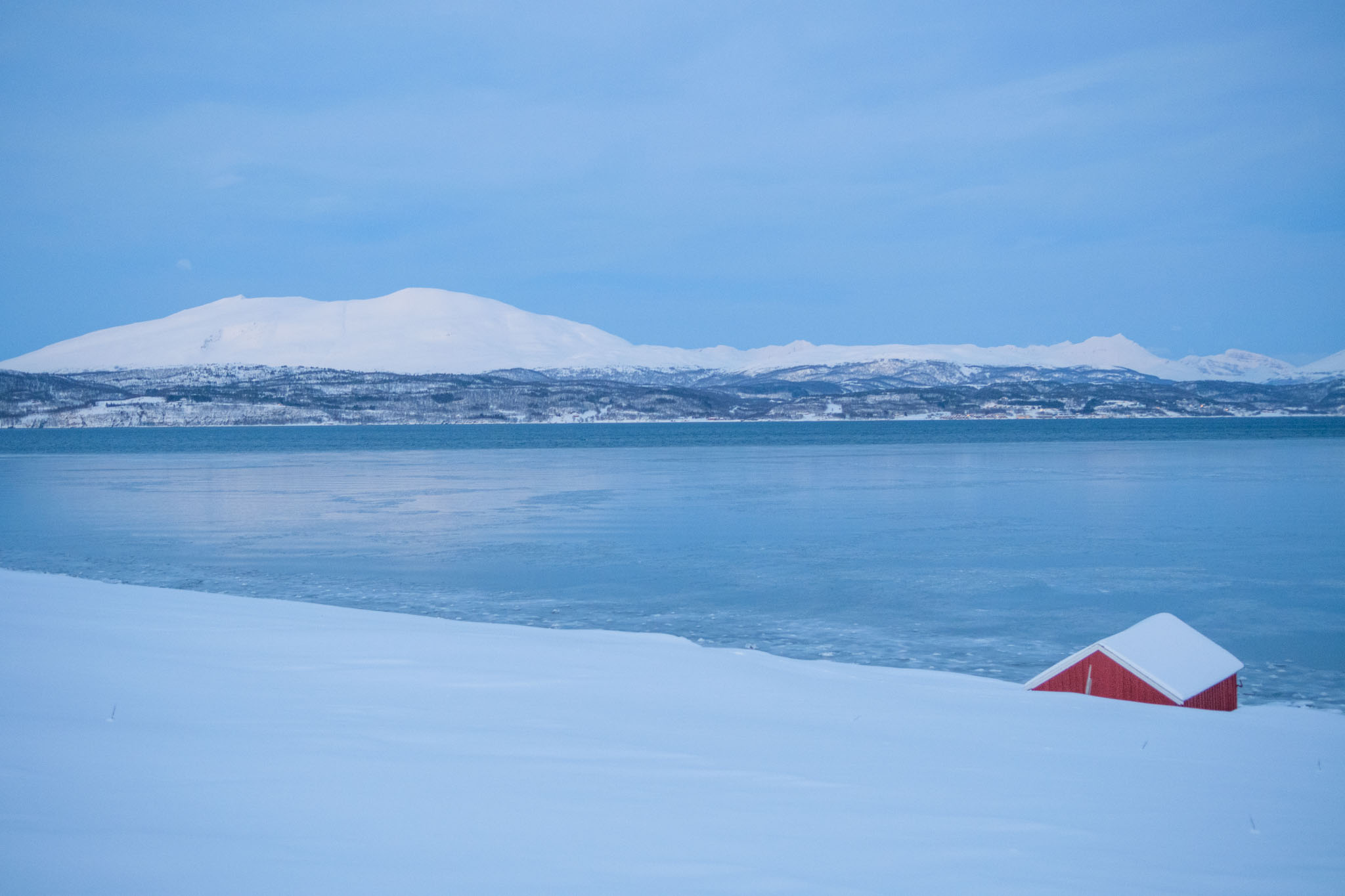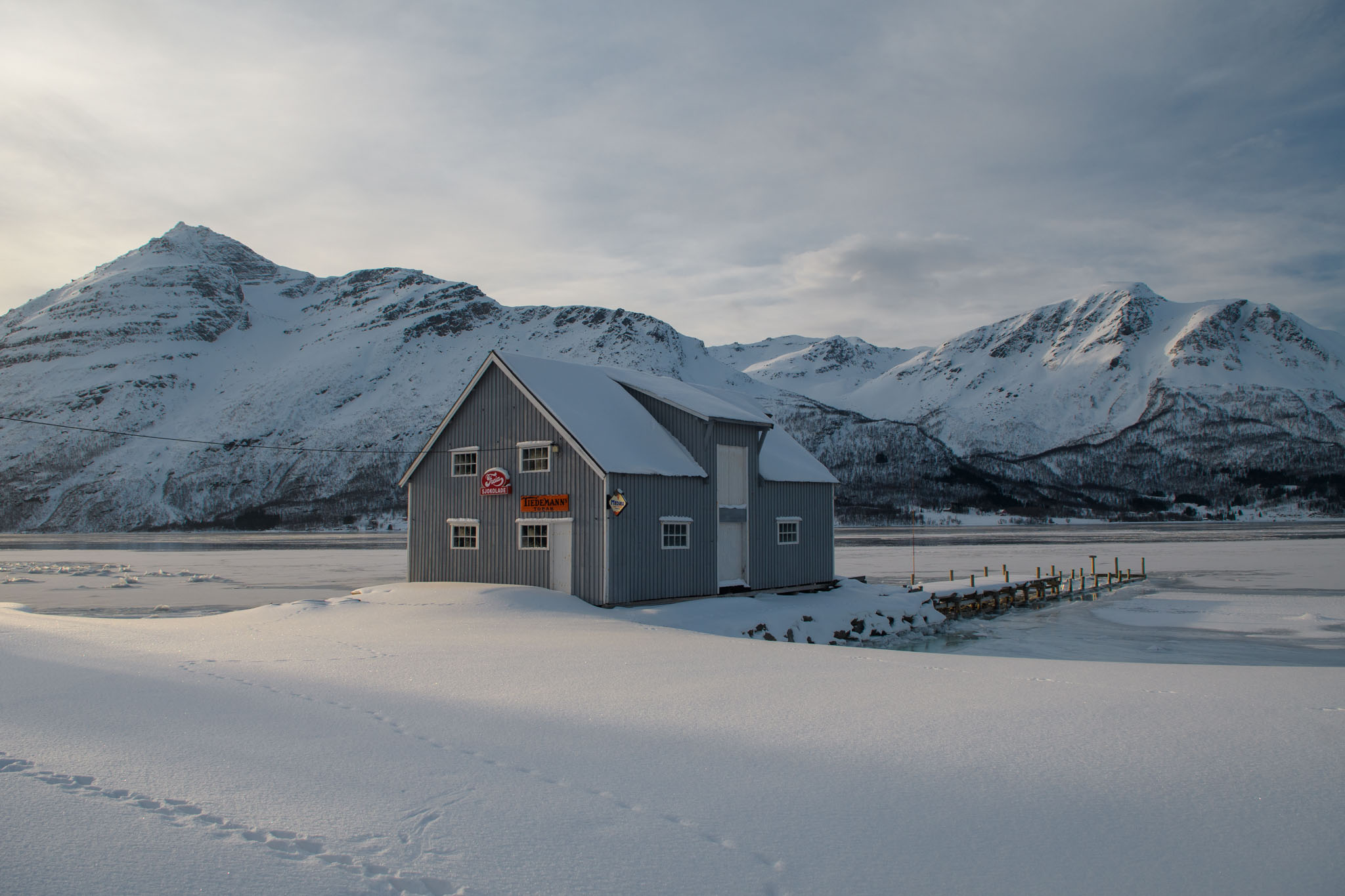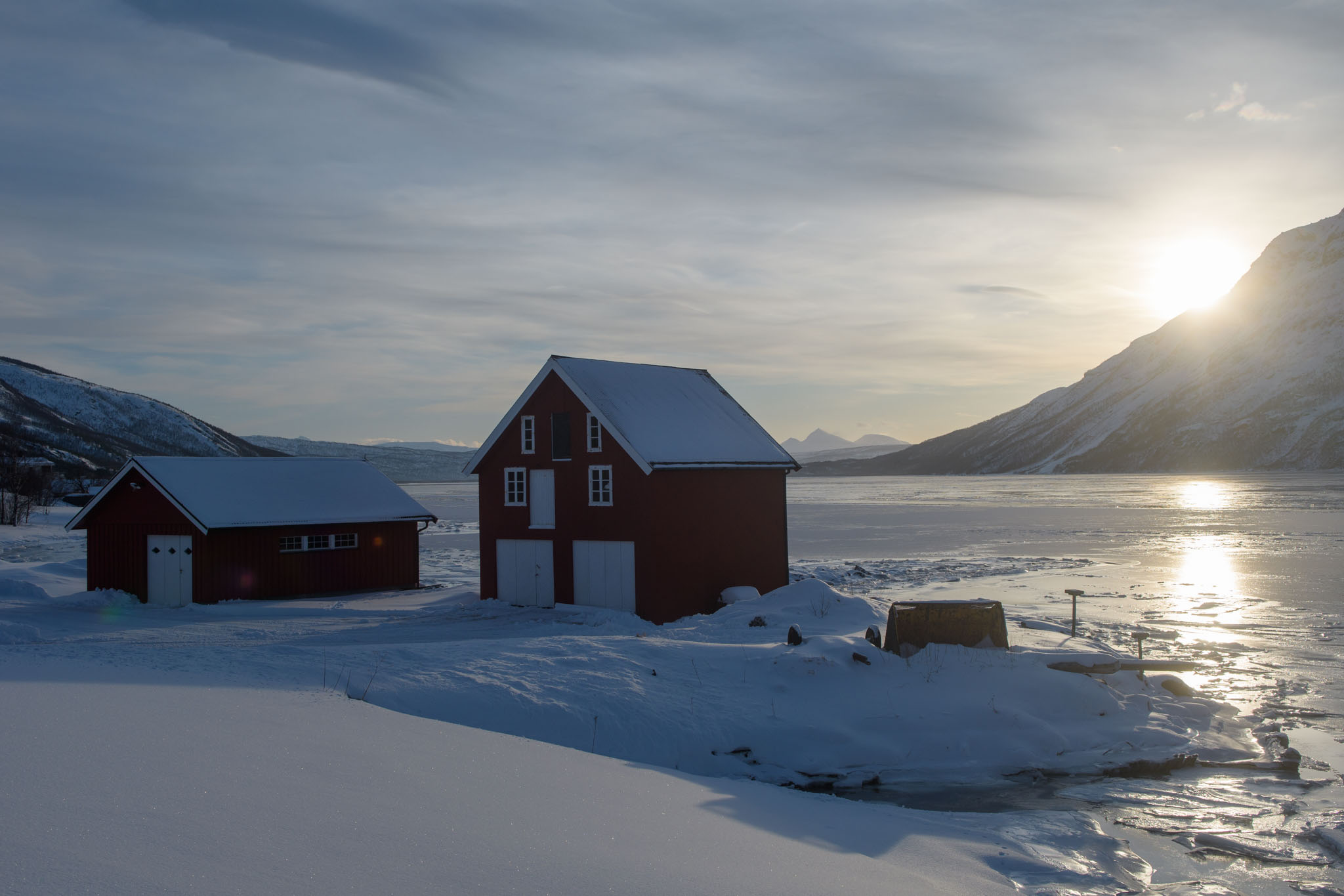 The Red Fjordhouse ist der Name unseres Ferienhauses (s. Fotos #1 und #4 unten). Es ist das ehemalige Schulhaus von Målsnes und bereits Anfang des 20. Jahrhunderts erbaut worden. Das merkt man auch daran, dass die beiden Schlafzimmer im oberen Stockwerk nur etwa 1,9 m hoch sind. Das Haus ist aber perfekt in Schuss und zusätzlich ist es eine der am besten ausgestatteten Ferienwohnungen, die wir je hatten. Dass kostenlose Schneeschuhe dabei sind, wussten wir bereits vorher. Dass die Küche nahezu perfekt ausgestattet ist, haben wir gestern Abend sehr schnell gemerkt. Über den Drucker in der Wohnung haben wir uns zunächst gewundert. Abends haben wir dann noch bemerkt, dass uns ein großes MacBook Pro zur Verfügung steht. Wir alle dachten, dass dies Julias sei, bis sie es genommen hat, um es zu nutzen und dabei merkte, dass es gar nicht ihr eigenes ist.