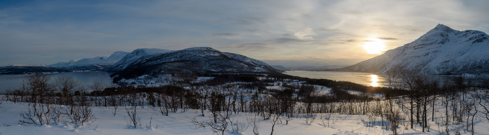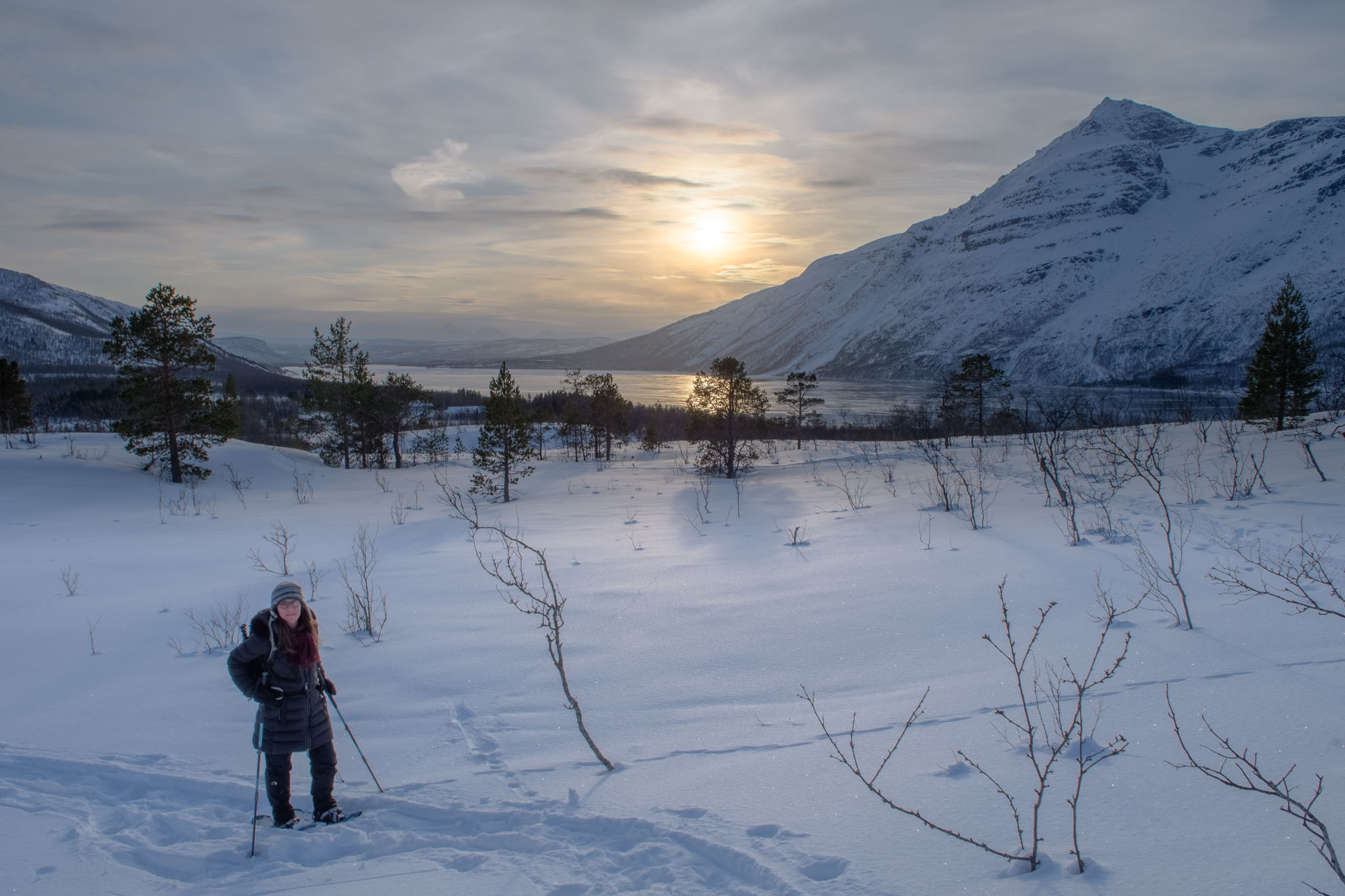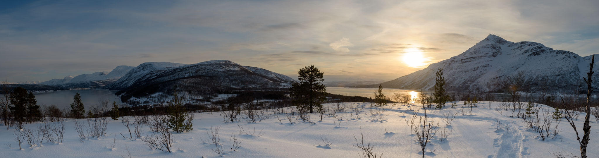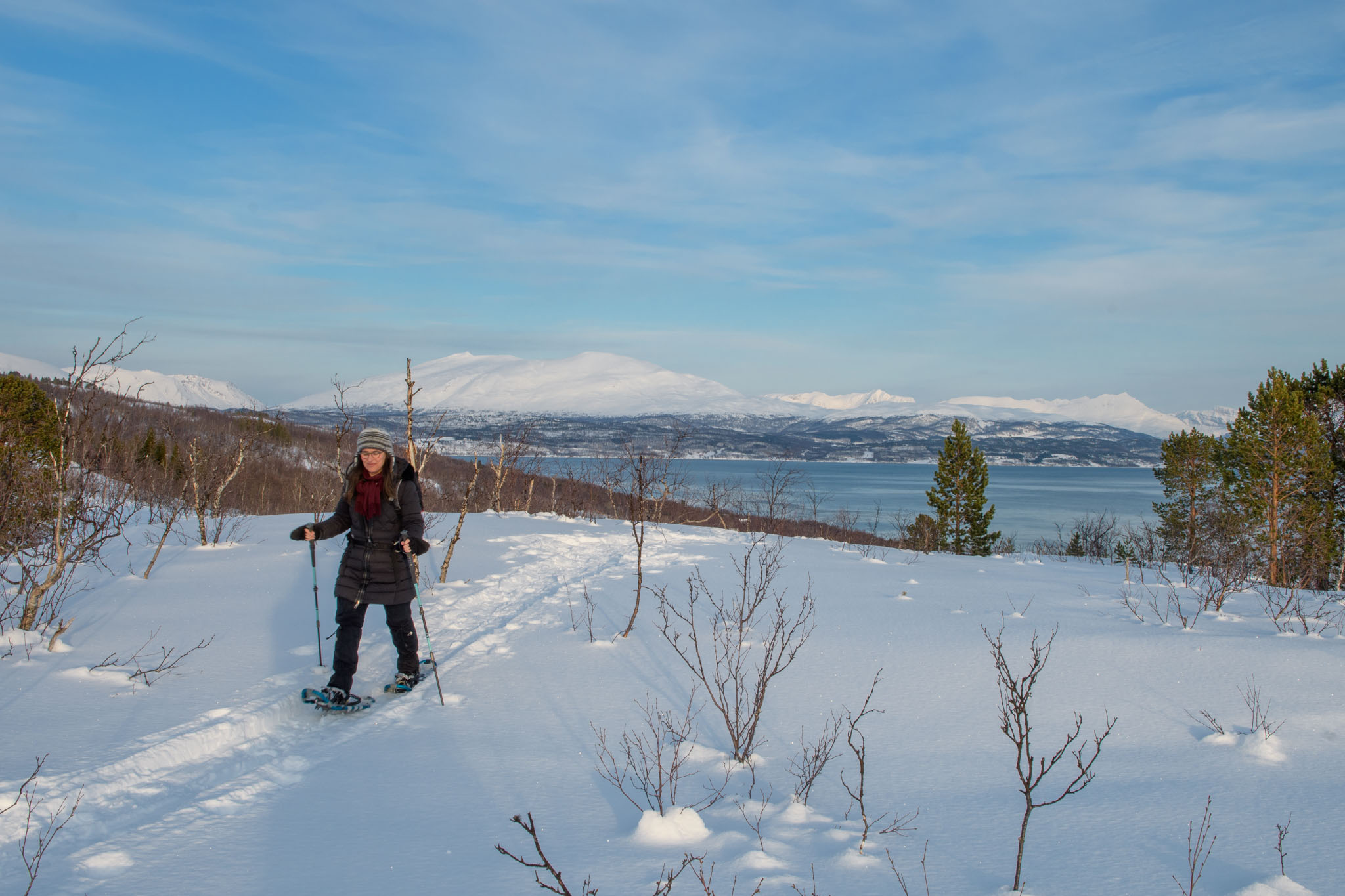 Heute war Gammeltag. Erst um 14 Uhr sind wir zu einer Schneeschuhwanderung aufgebrochen, und zwar nur wir beide. Wir waren auf der Anhöhe inmitten der Halbinsel, auf der wir Quartier bezogen haben. Von dort oben hat man eine schöne Aussicht über beide Fjorde, westlich und östlich der Halbinsel.