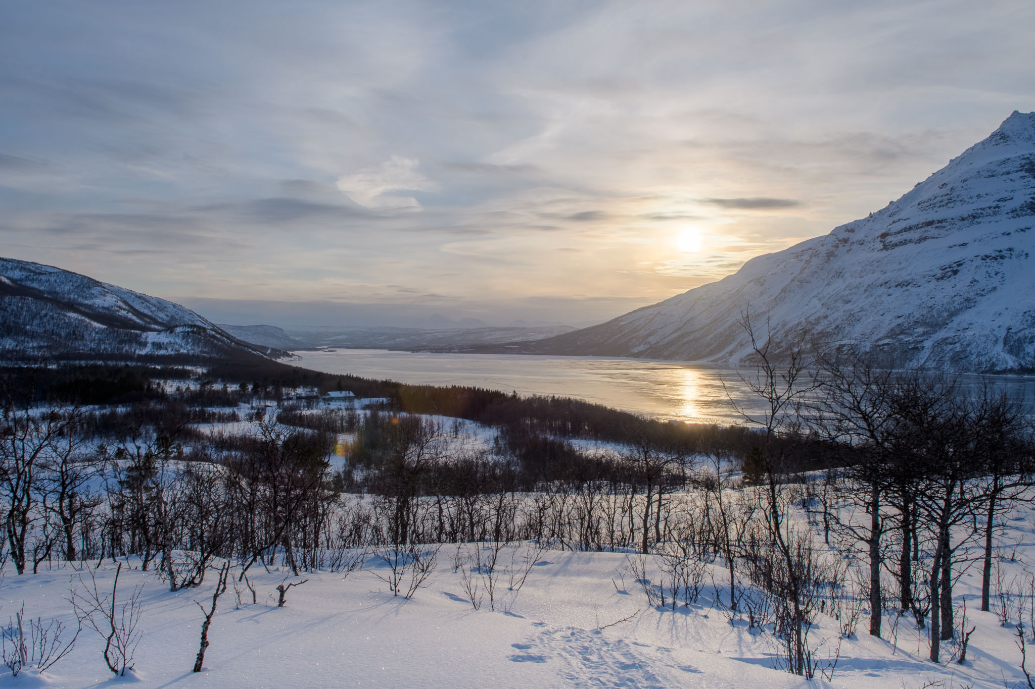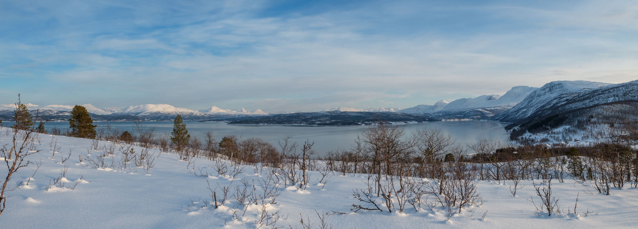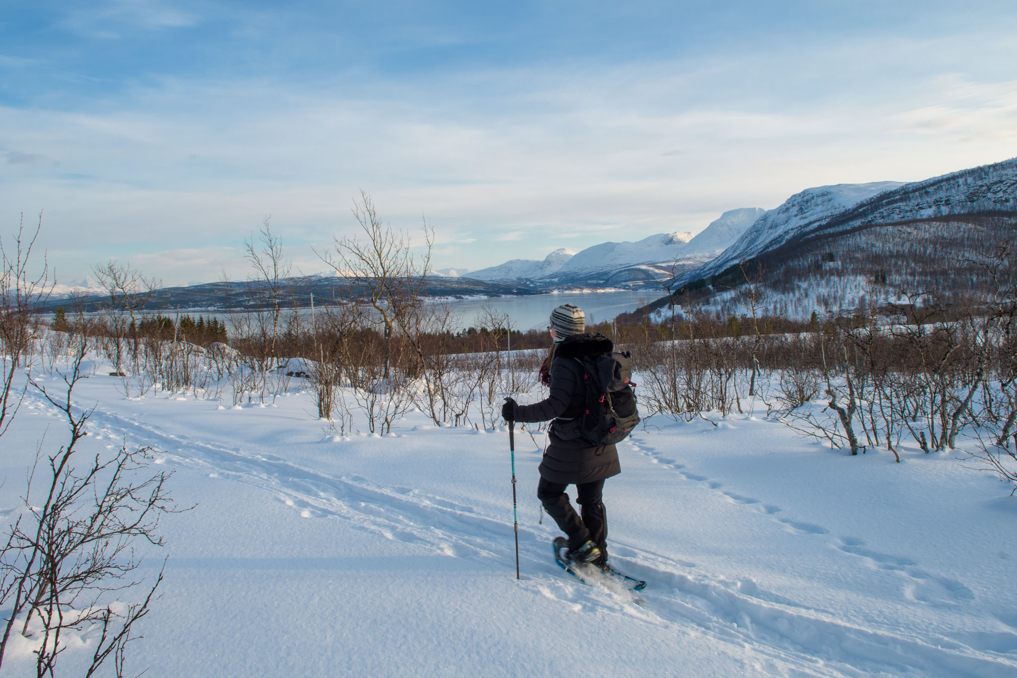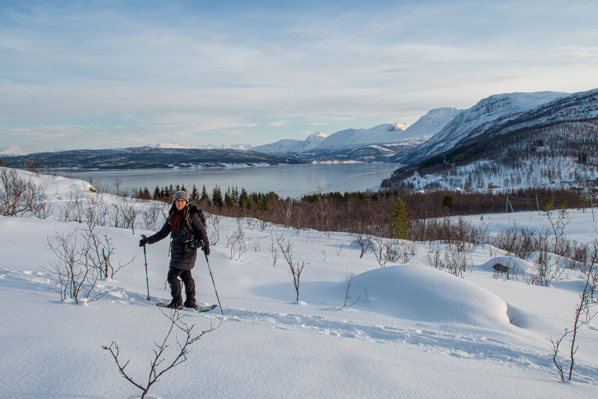 Heute war Gammeltag. Erst um 14 Uhr sind wir zu einer Schneeschuhwanderung aufgebrochen, und zwar nur wir beide. Wir waren auf der Anhöhe inmitten der Halbinsel, auf der wir Quartier bezogen haben. Von dort oben hat man eine schöne Aussicht über beide Fjorde, westlich und östlich der Halbinsel.