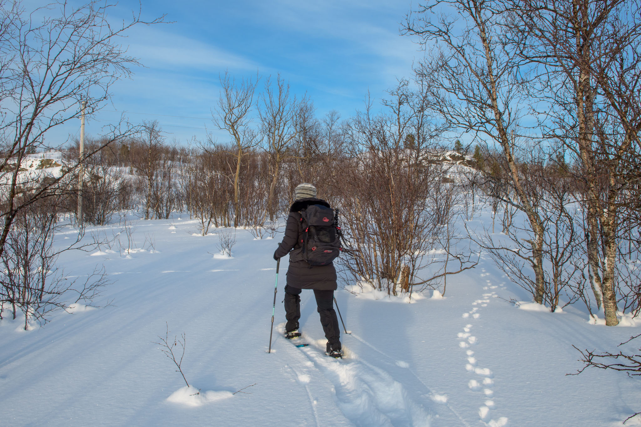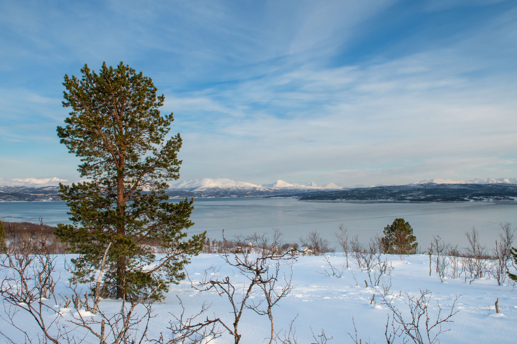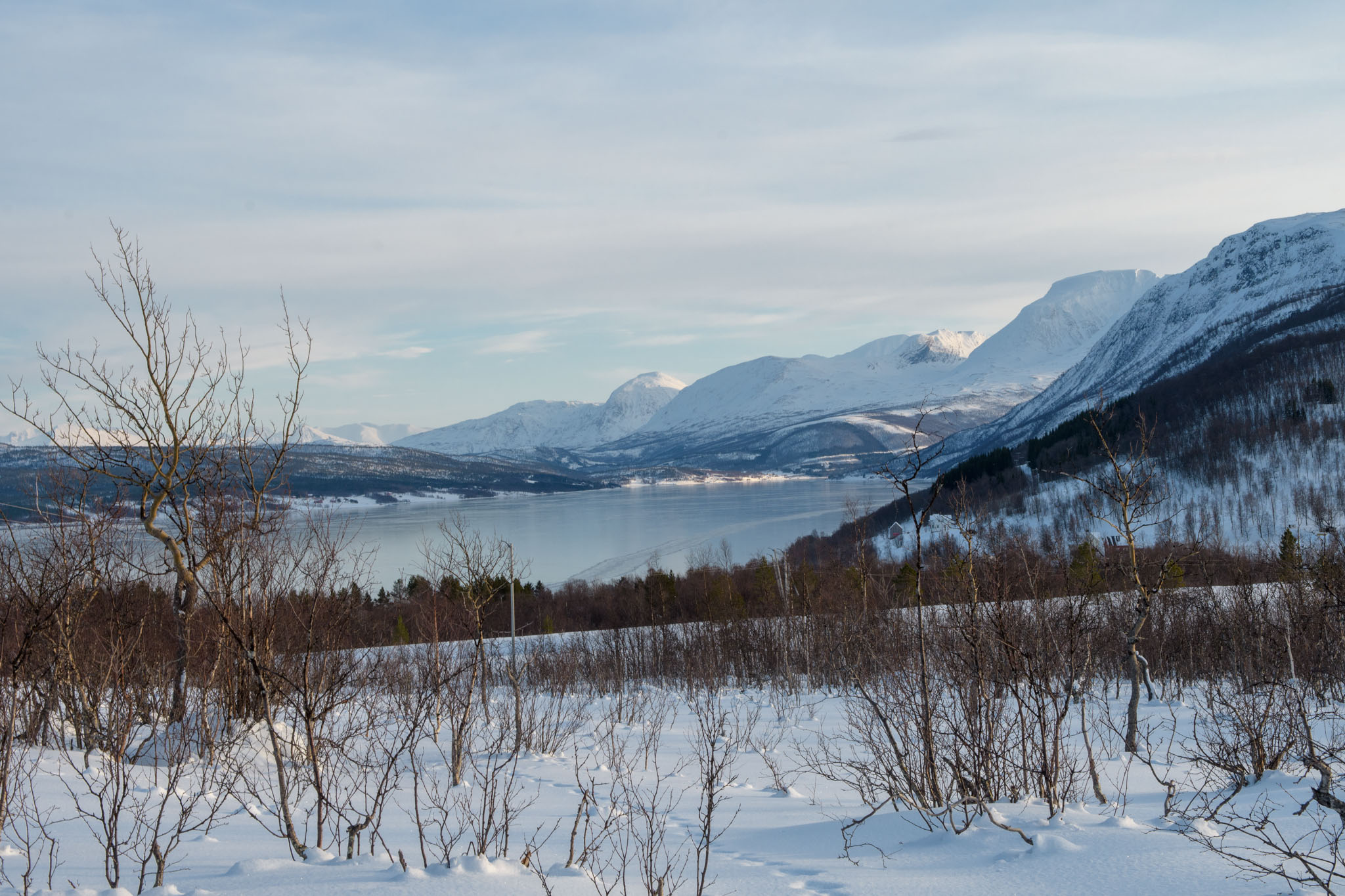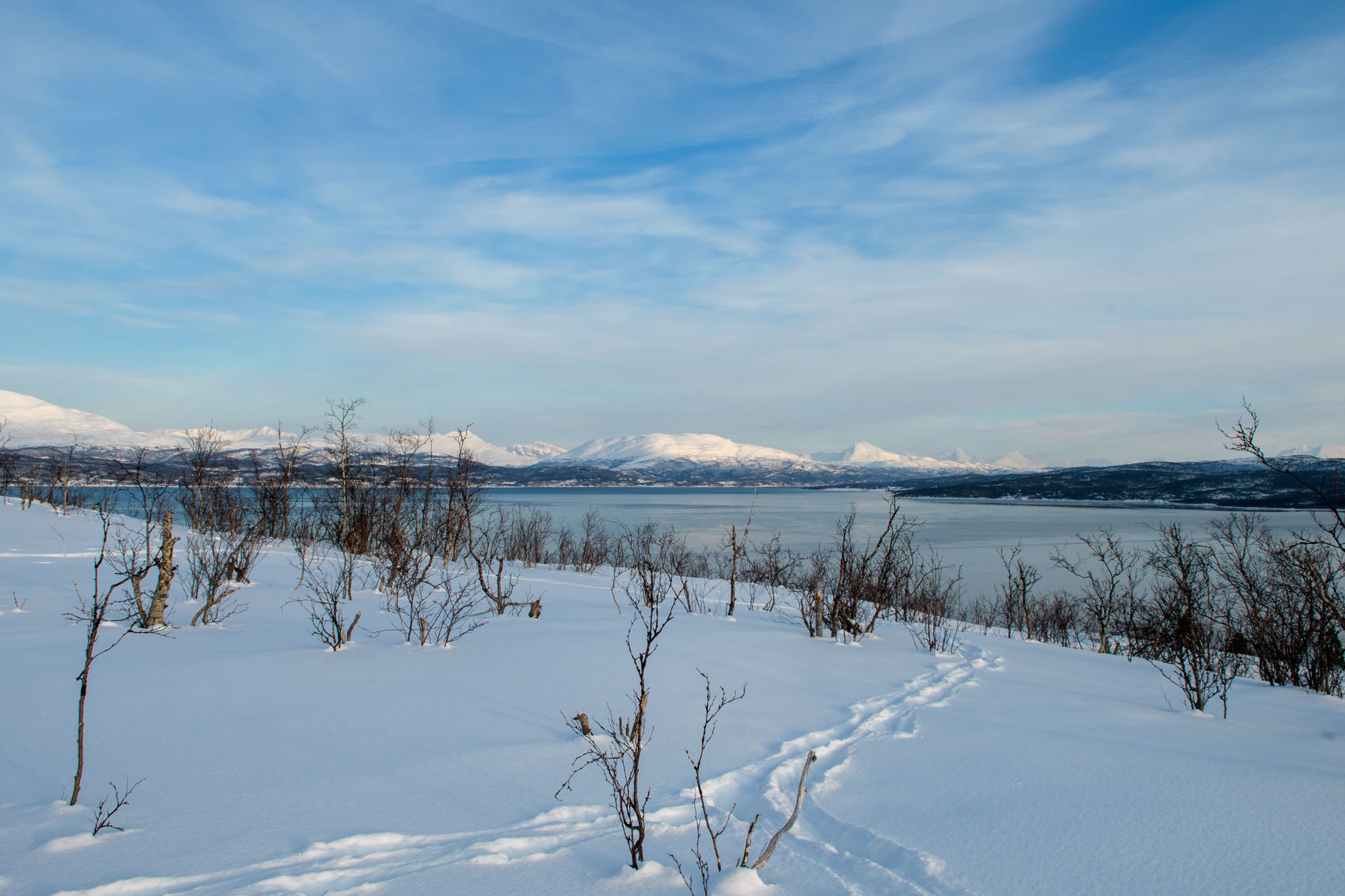 Heute war Gammeltag. Erst um 14 Uhr sind wir zu einer Schneeschuhwanderung aufgebrochen, und zwar nur wir beide. Wir waren auf der Anhöhe inmitten der Halbinsel, auf der wir Quartier bezogen haben. Von dort oben hat man eine schöne Aussicht über beide Fjorde, westlich und östlich der Halbinsel.