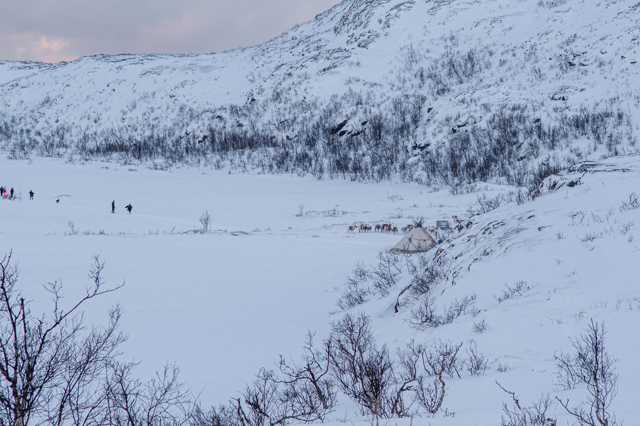 Nach dem Einkaufen haben wir noch ein Sami-Camp mit Rentierherde gesucht, das ganz nah an der Stelle ist, wo wir gestern mit dem Auto stecken geblieben sind. Mithilfe der Verkäuferinnen im Supermarkt und etwas Suchen haben wir es gefunden, haben aus der Ferne auch die Rentiere und ein Zelt gesehen (s. Foto #9) und sind durch den tiefen Schnee hingestapft. Wir durften leider nicht bis zur Herde, haben mit dem Sami aber ausgemacht, dass wir morgen Mittag auf dem Weg nach Tromsø mal vorbeischauen und hoffen, dass er mit seinen Tieren bereits da ist.