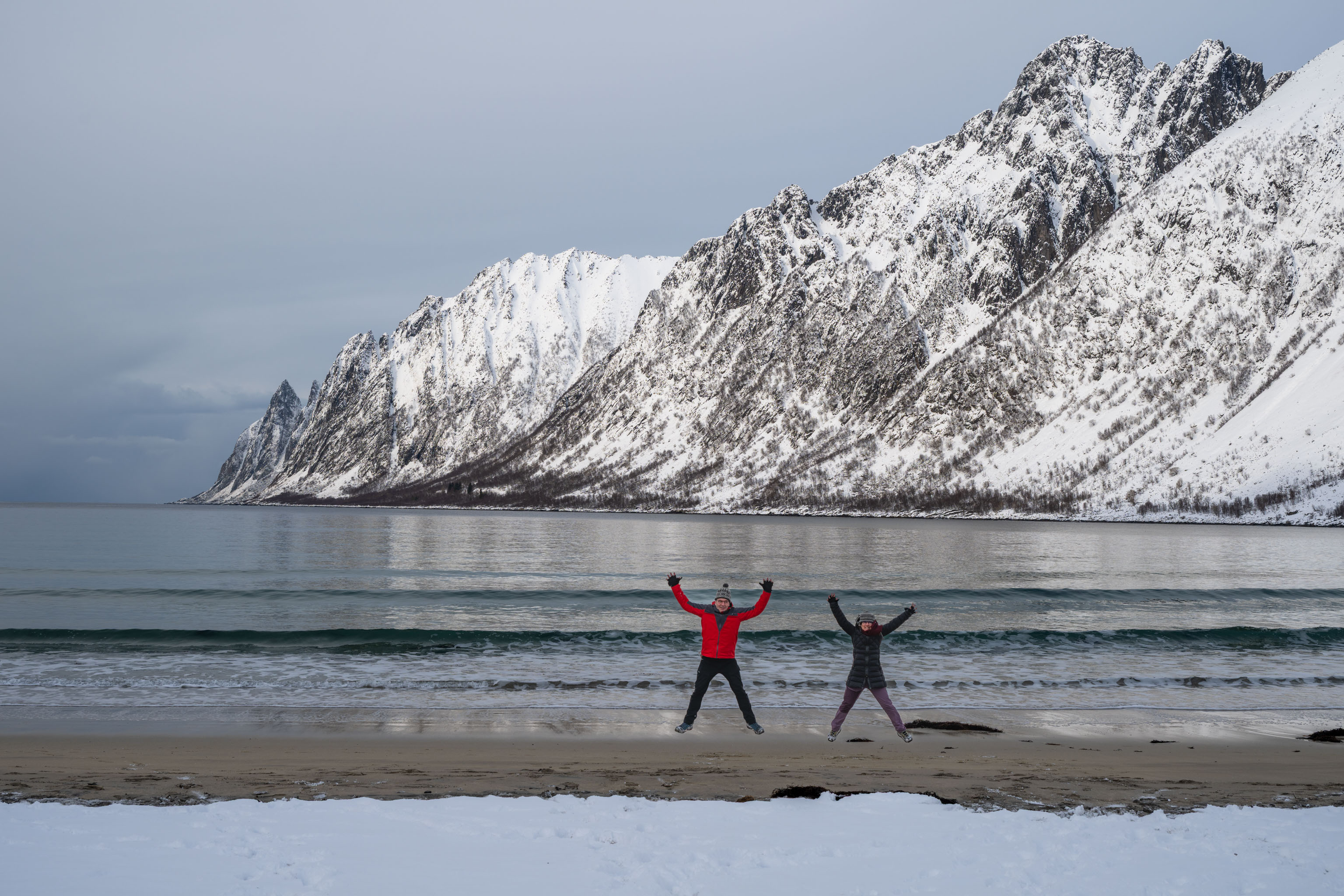Das erste Motiv aus der heutigen Bildergalerie kennt ihr natürlich schon: der Blick von einer der Serpentinen hinunter auf Husøy – wir dachten uns, es ist heute immer noch schön und zusätzlich waren gerade nette Französinnen zur Hand, die uns fotografieren konnten. Die nächsten vier Fotos sind aus Fjordgård und von der Fahrt dorthin. Dann kommen zwei Fotos von uns am Ersfjordstrand vor den Teufelszähnen und auf den letzten drei Fotos kann man die Teufelszähne von Tungeneset aus in ihrer vollen und bekannten Schönheit bestaunen.