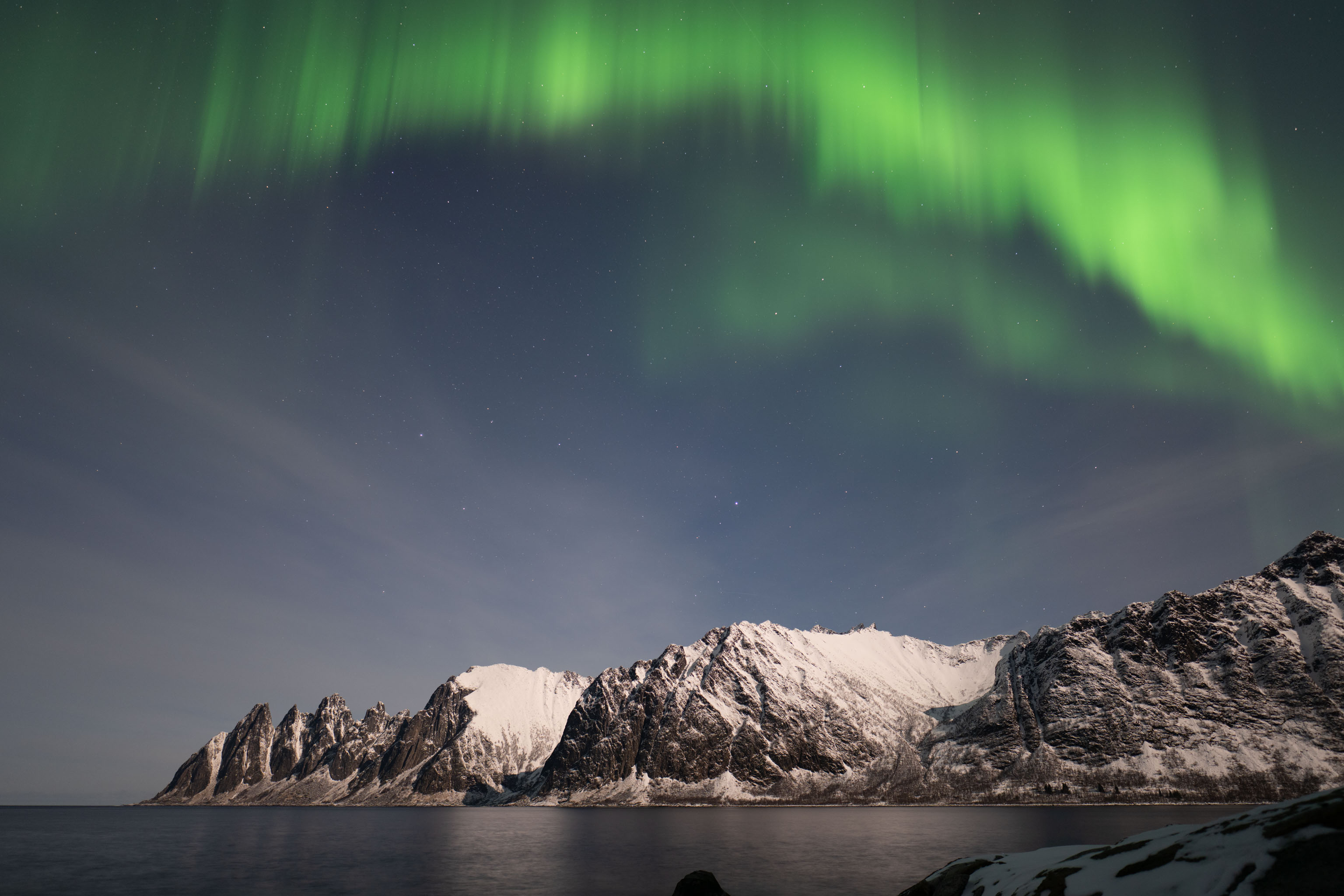 Von unserem Standort Tungeneset sind die Teufelszähne exakt im Norden, also die besten Voraussetzungen für Polarlichter darüber. Der Kp-Index war mit 5 sehr ordentlich und der Himmel war sowieso klar.