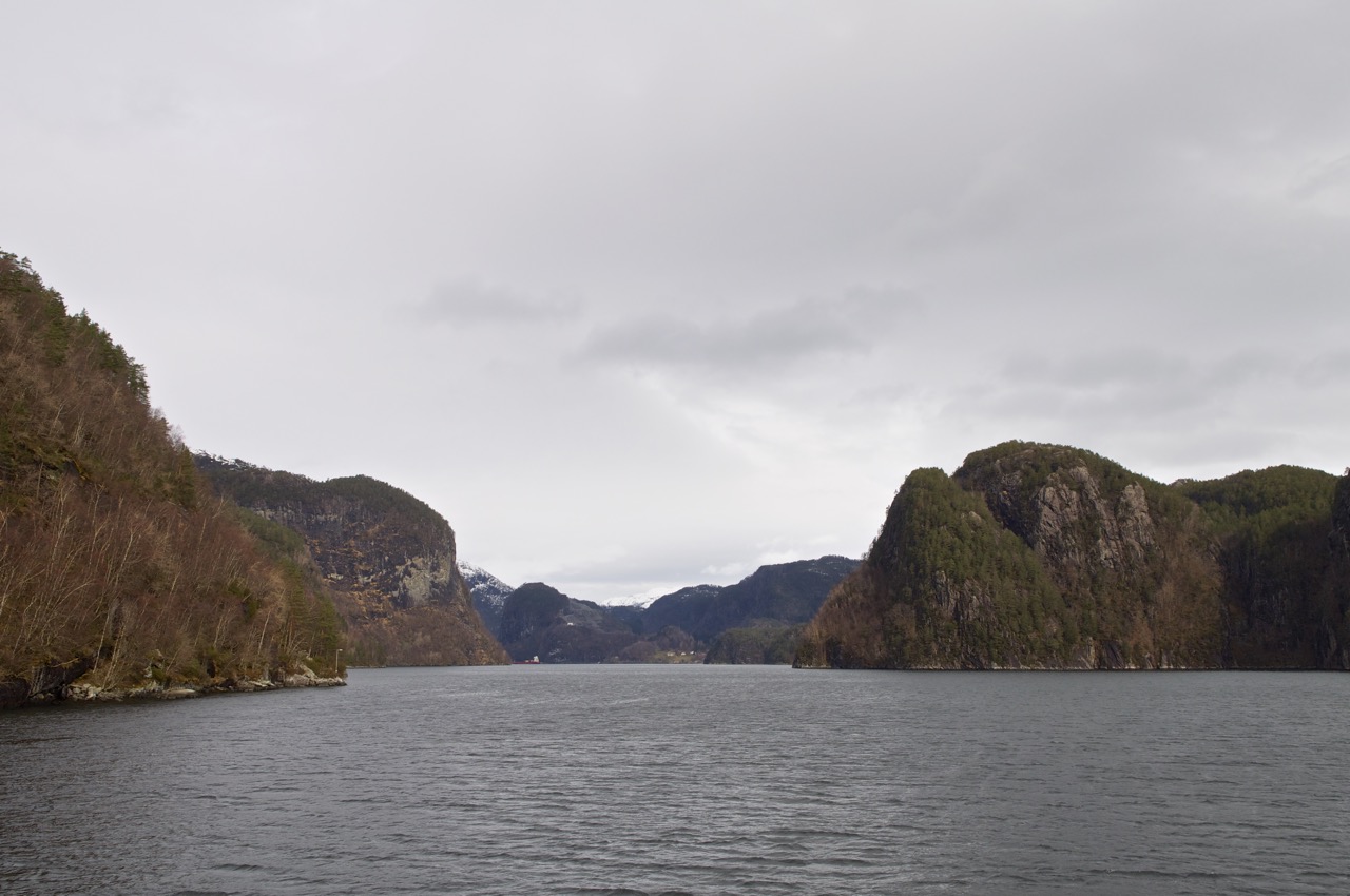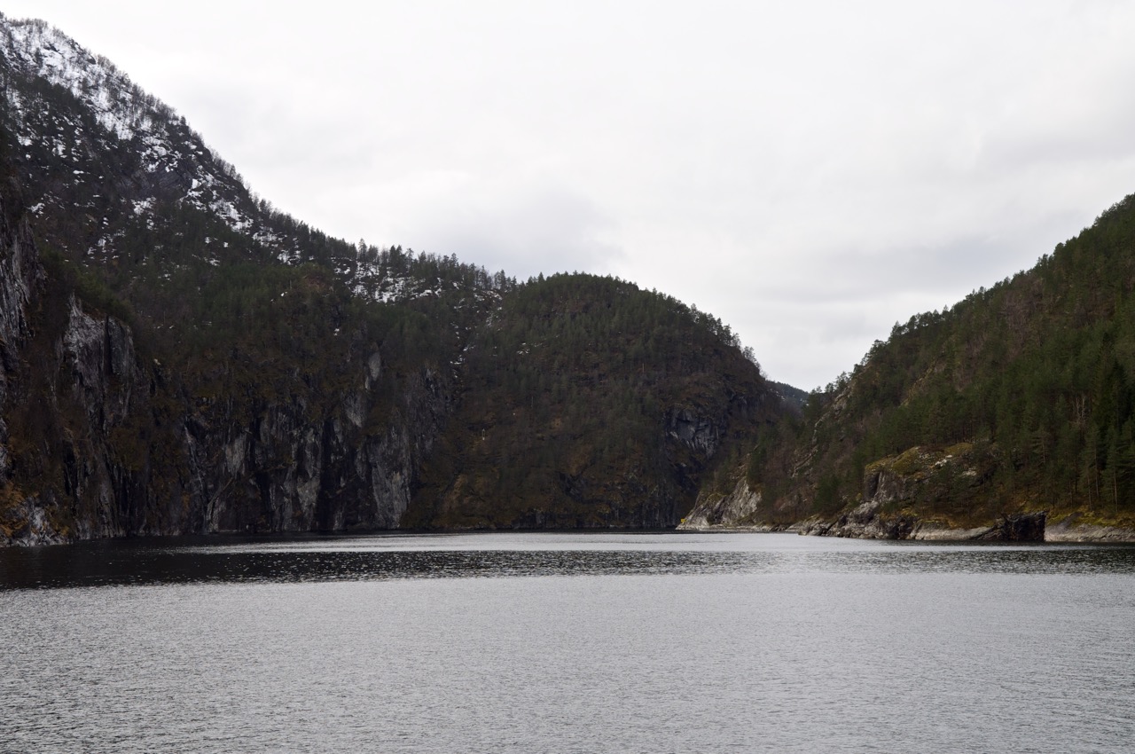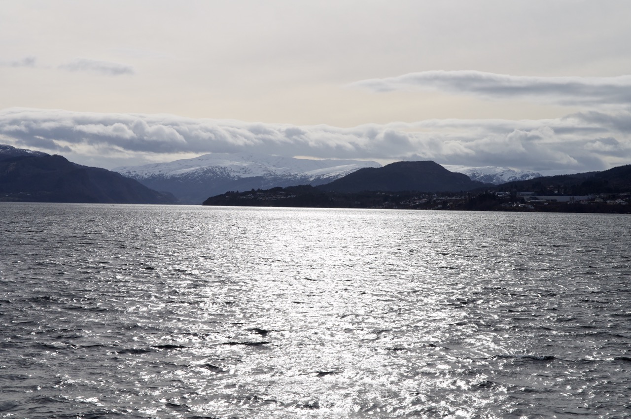 Heute ging es von Bergen aus mit dem Schiff durch den Osterfjord bis zum Sund (Engstelle) Kostraumen mit seiner starken Strömung, wo das Schiff es gerade so durch den Fjord schafft.